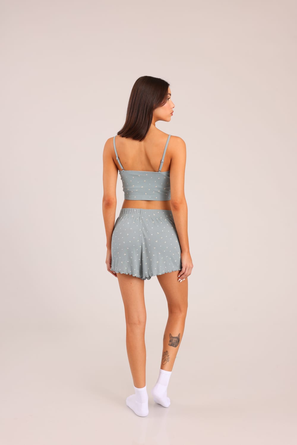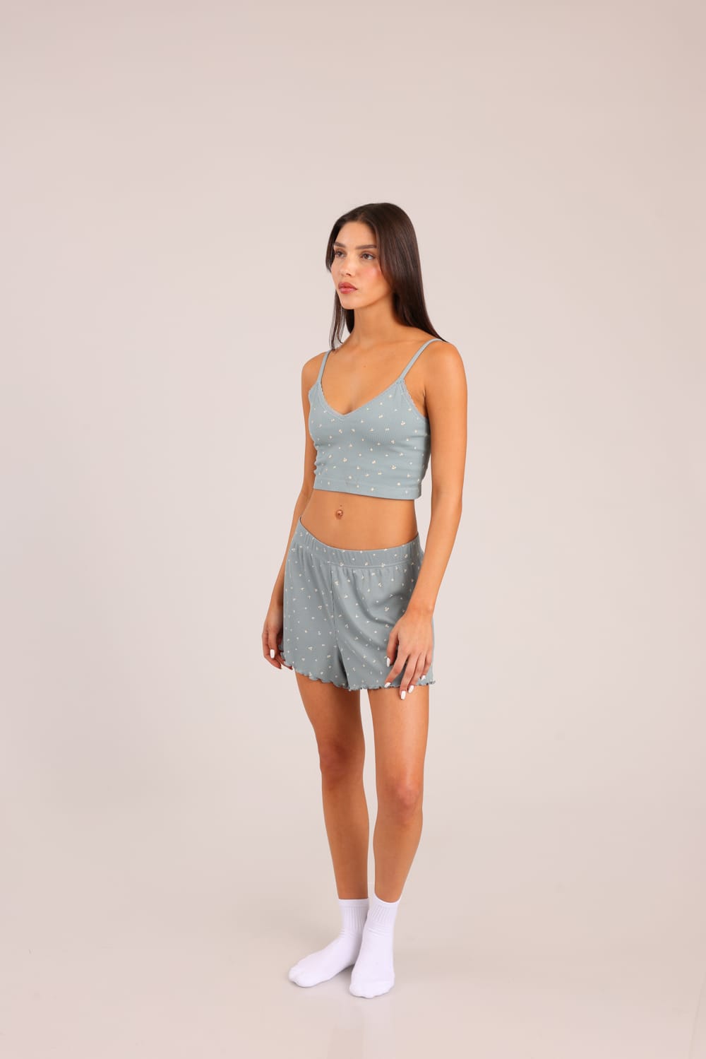סט פיג'מת נשים גופיית V ושורט קצר עם הדפס פרחוני עדין