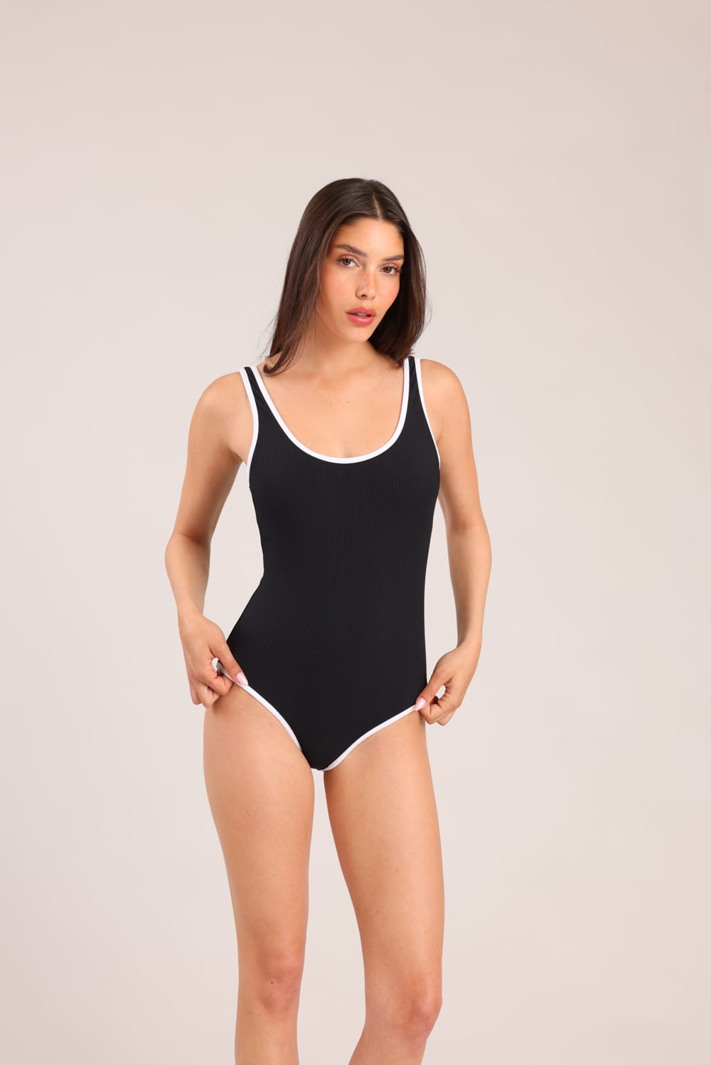 בגד ים שלם עם מחשוף עמוק בגב וגימור מסגרת בלבן