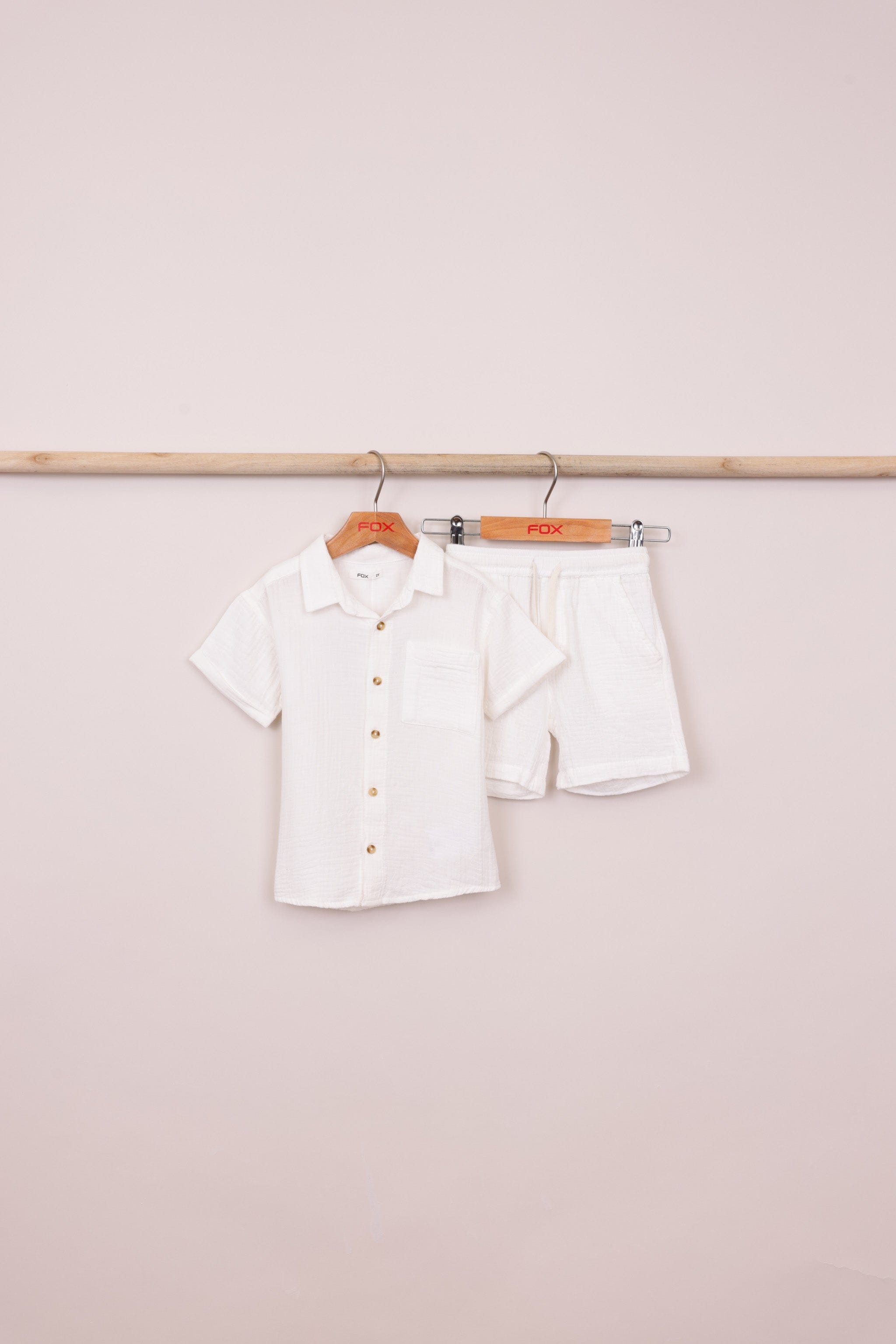 חליפת טטרה בנים, חולצה קצרה מכופתרת עם צווארון , כפתורים וכיס קדמי, ושורט קצר עם גומי במותן ושרוך.