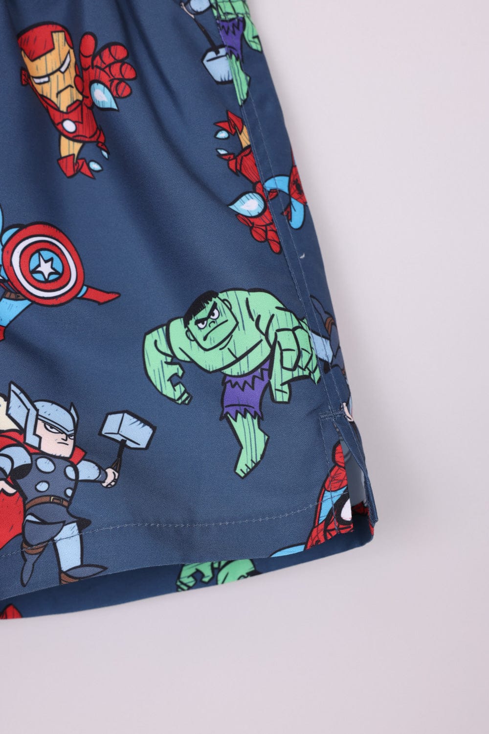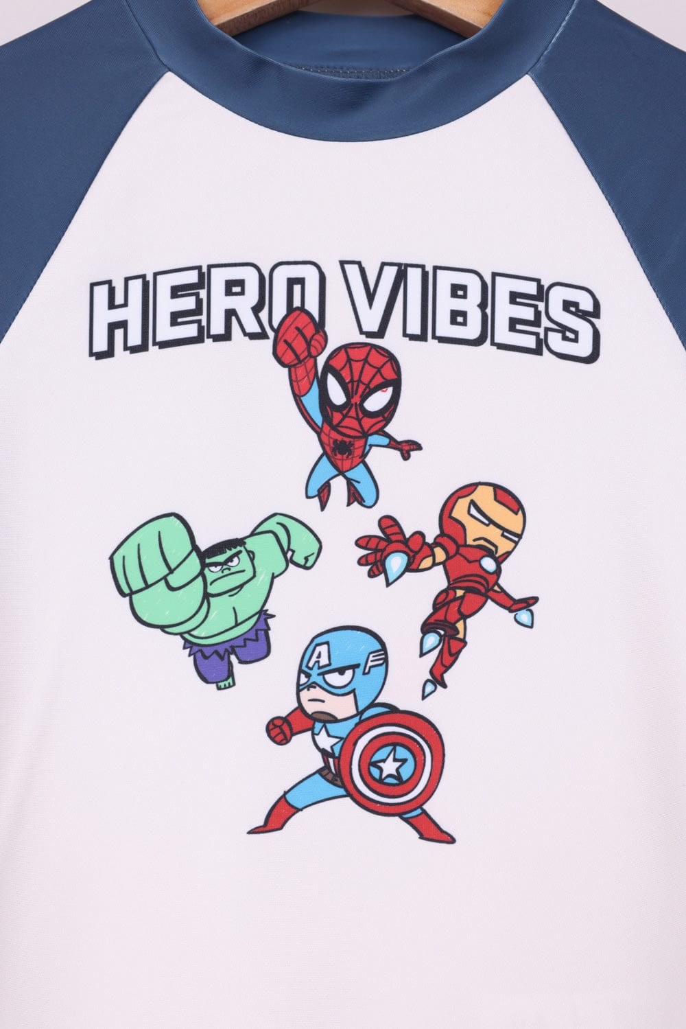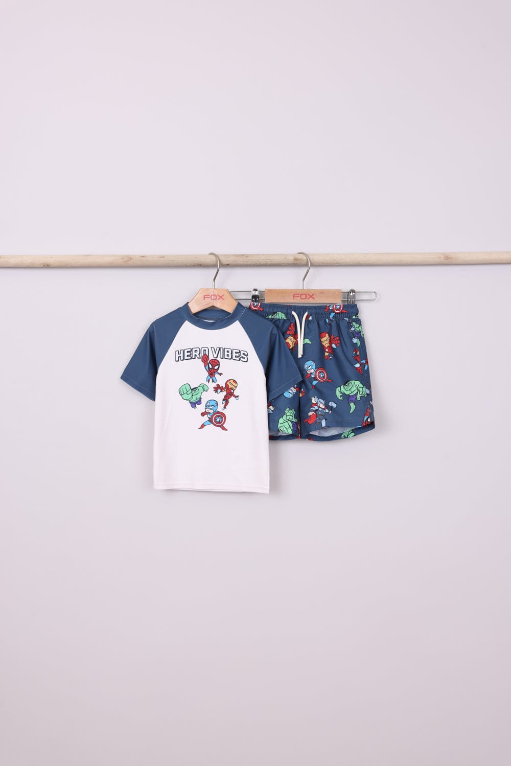 בגד ים שני חלקים מארוול ,שורט עם הדפסים וחולצה קצרה בשילוב צבעים עם הדפס קדמי