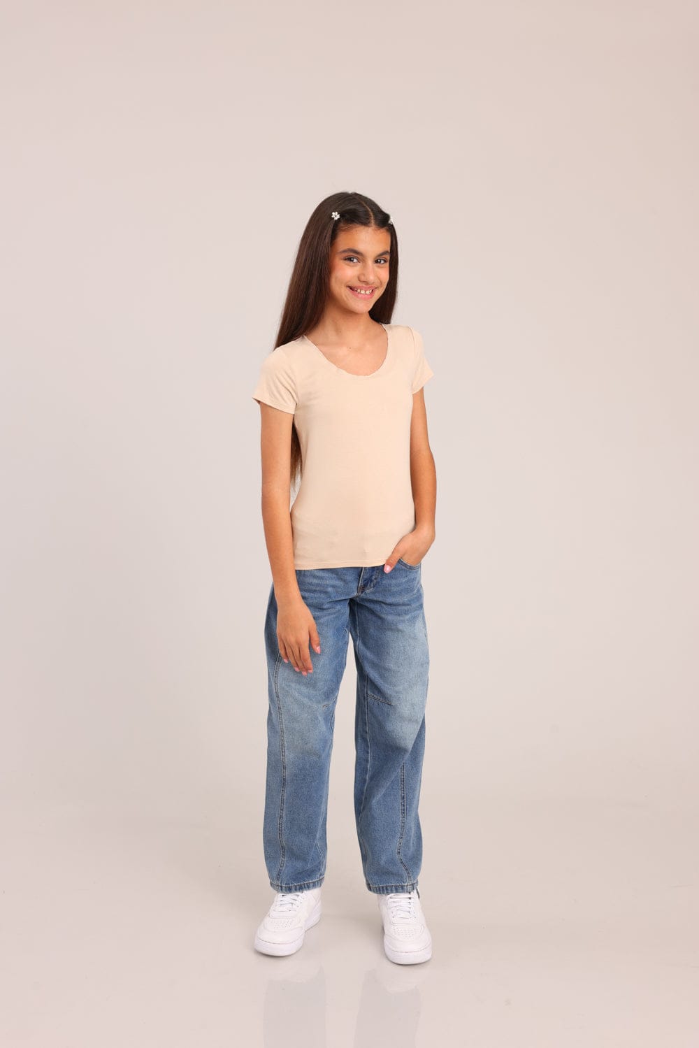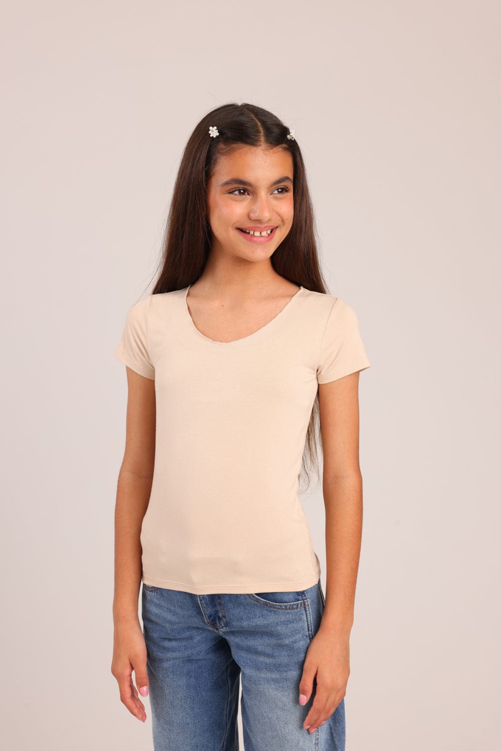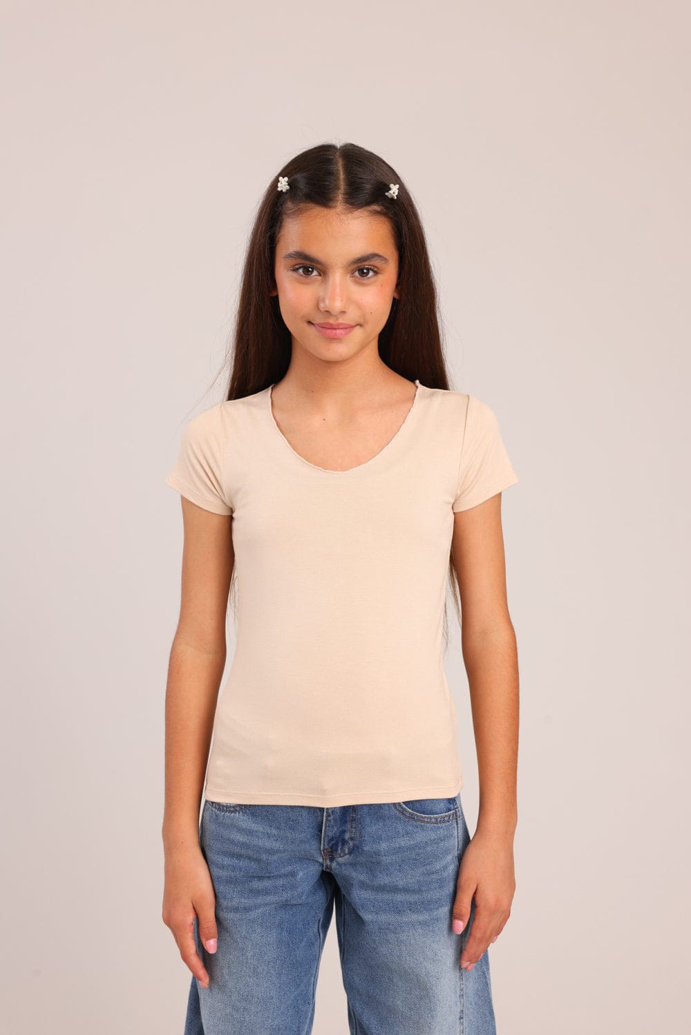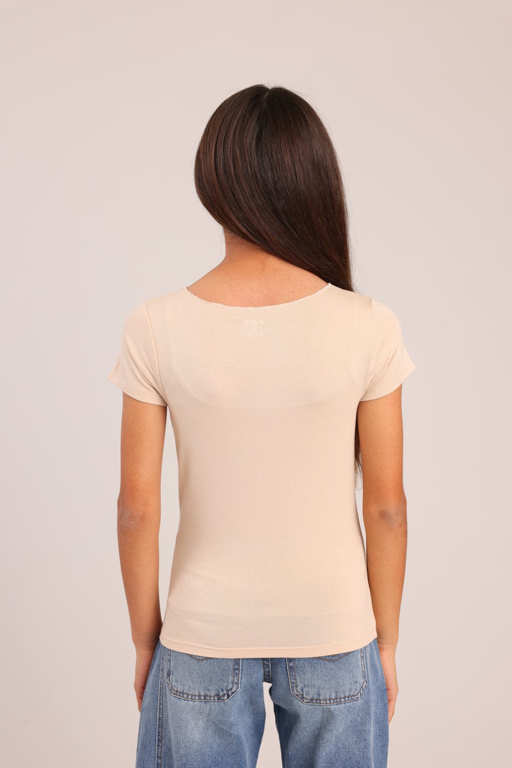 טישרט בייסיק צווארון V עם סיומת גזורה. שרוולים קצרים מבד ויסקוזה, בגזרה צמודה