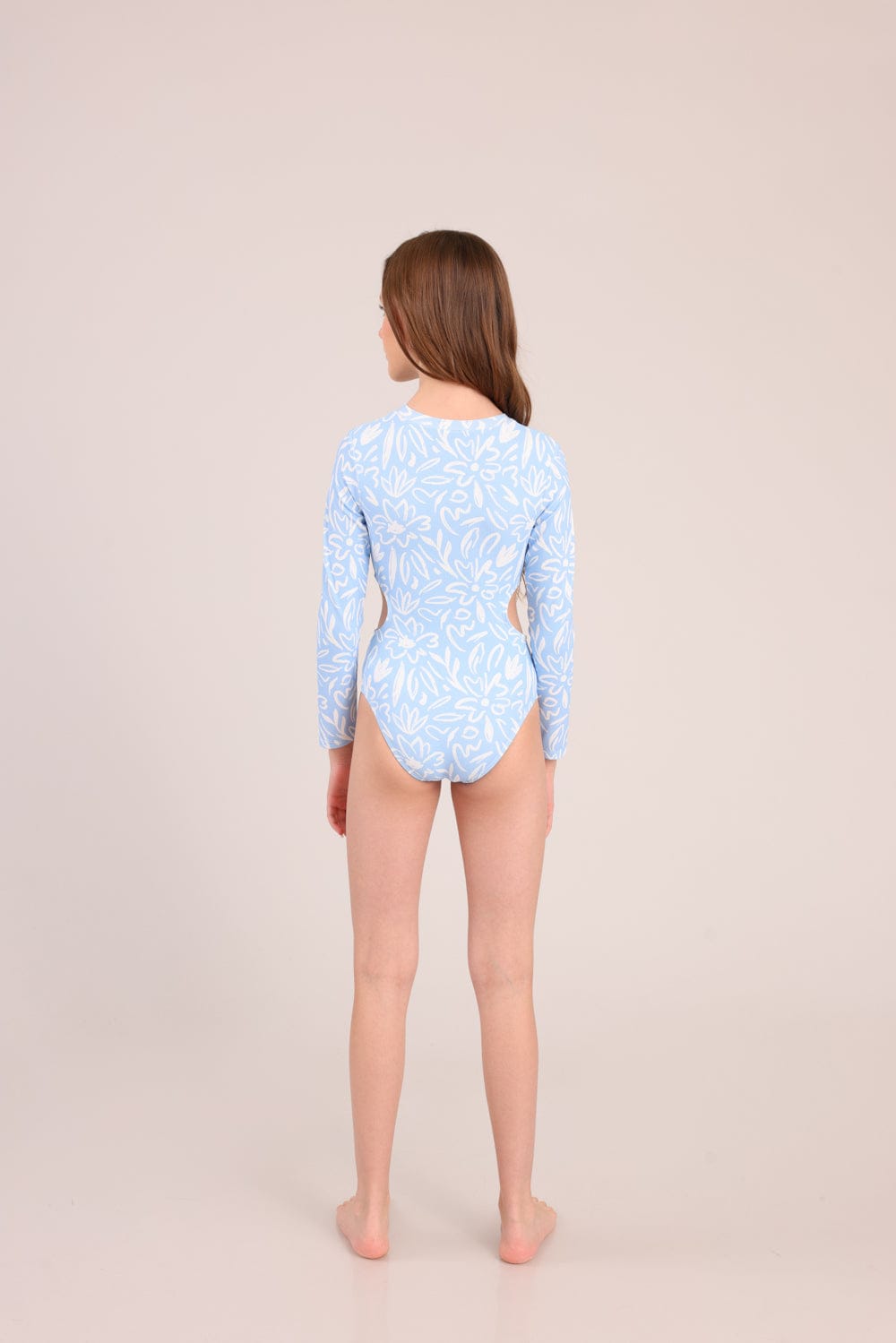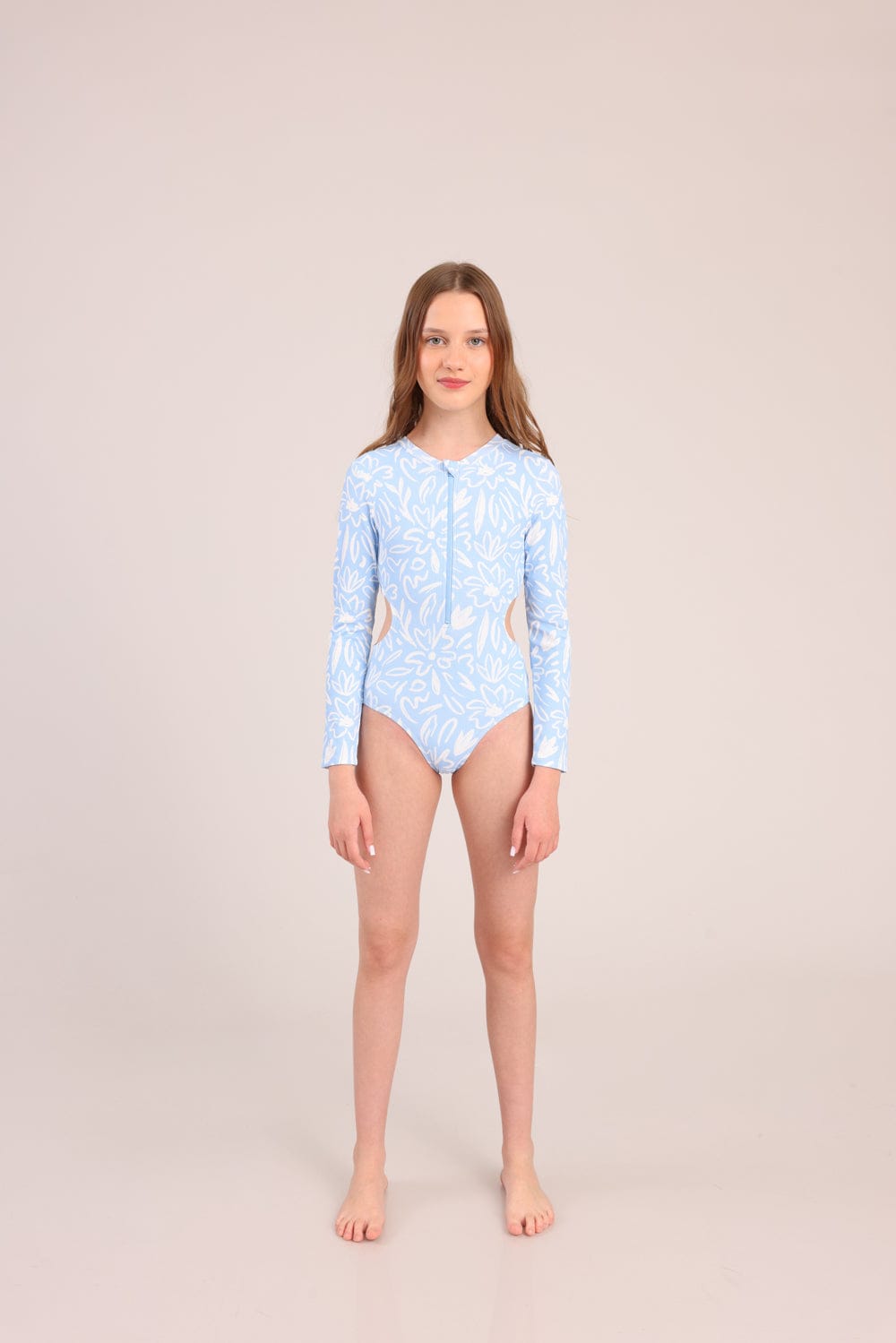 בגד ים שלם עם הדפס ושרוולים ארוכים, נסגר עם רוכסן קדמי.
