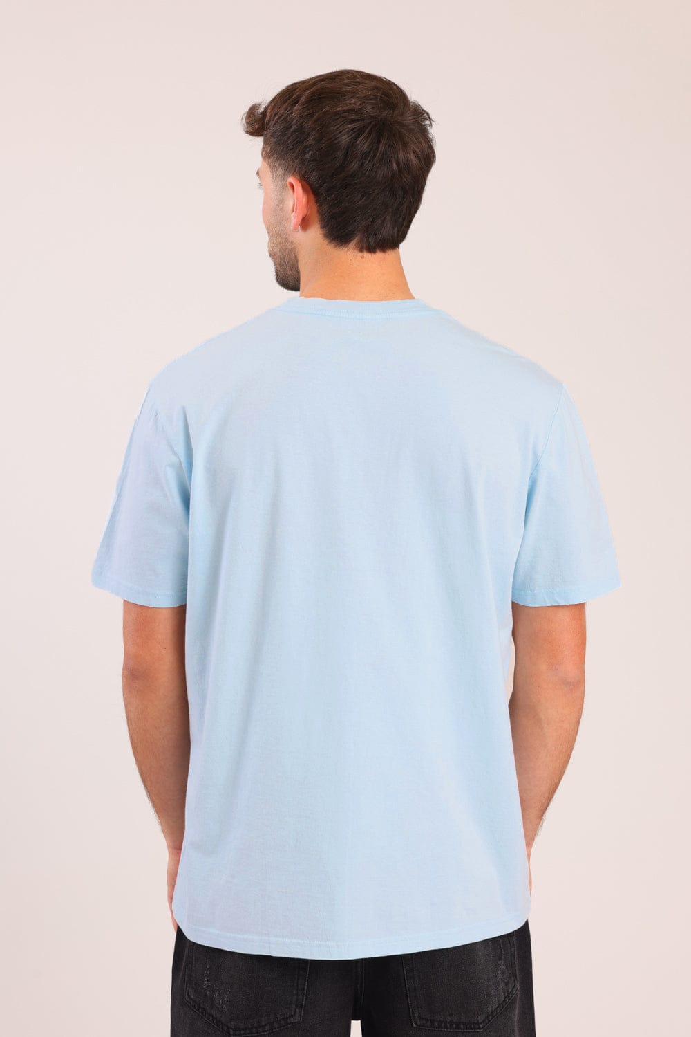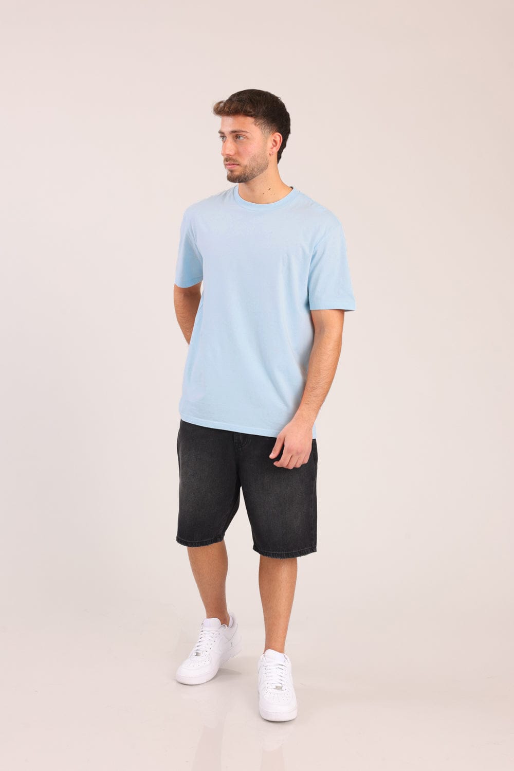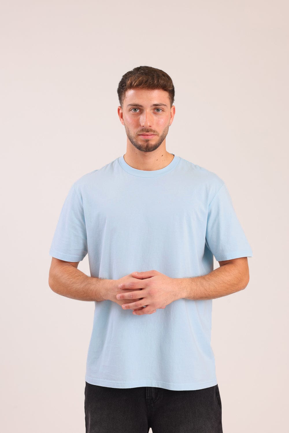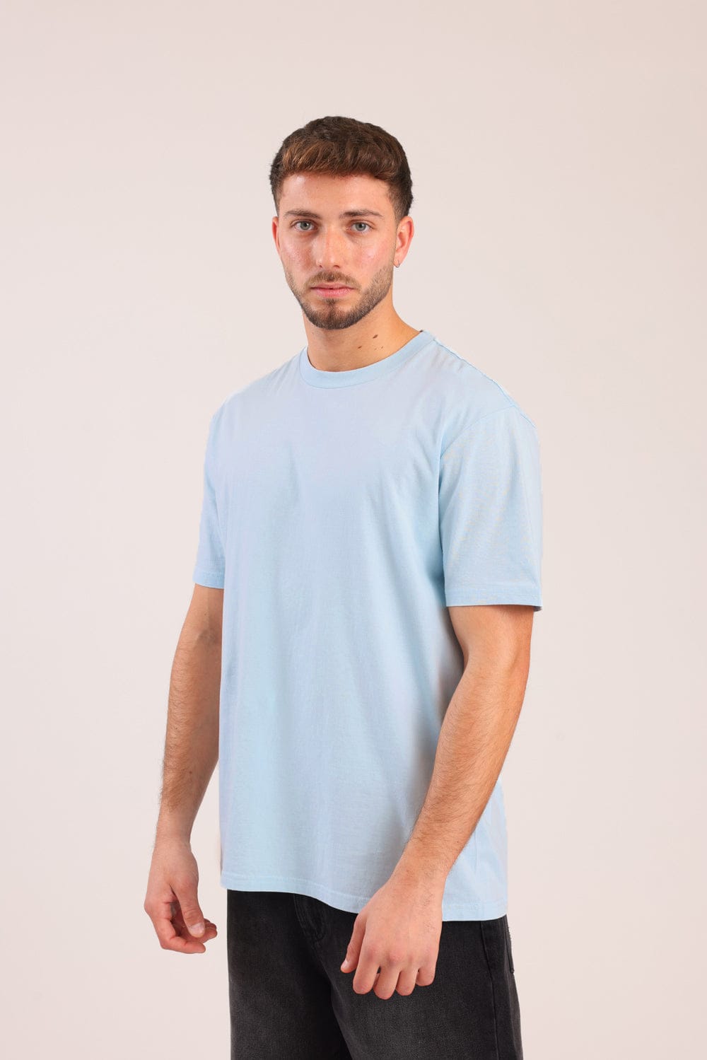 חולצת בייסיק קצרה, בגזרת אוברסייז עם צווארון עגול.