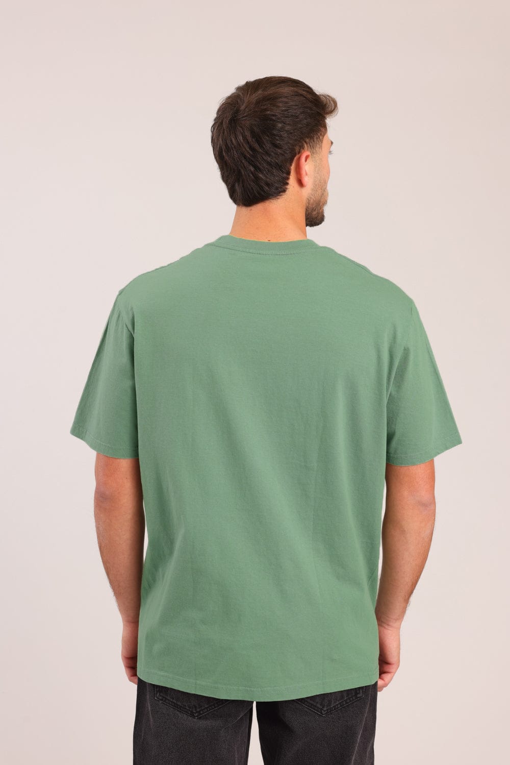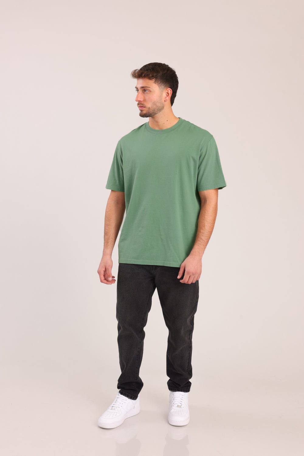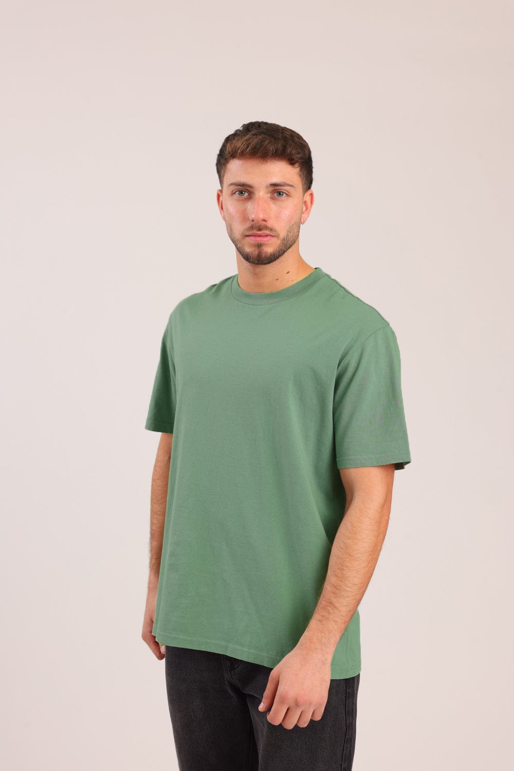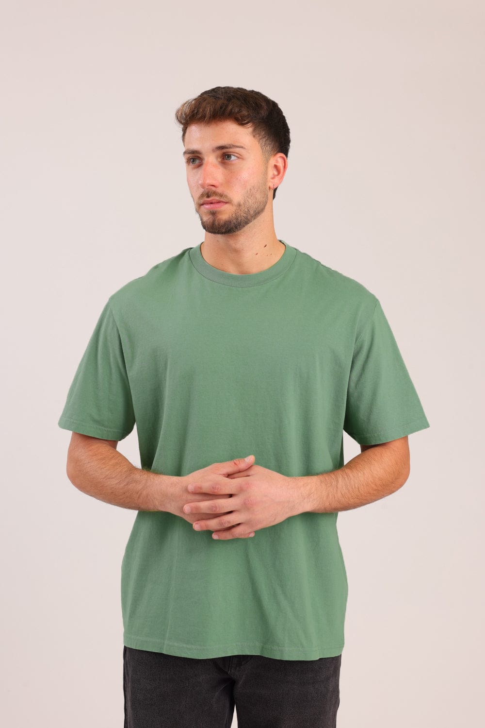 חולצת בייסיק קצרה, בגזרת אוברסייז עם צווארון עגול.