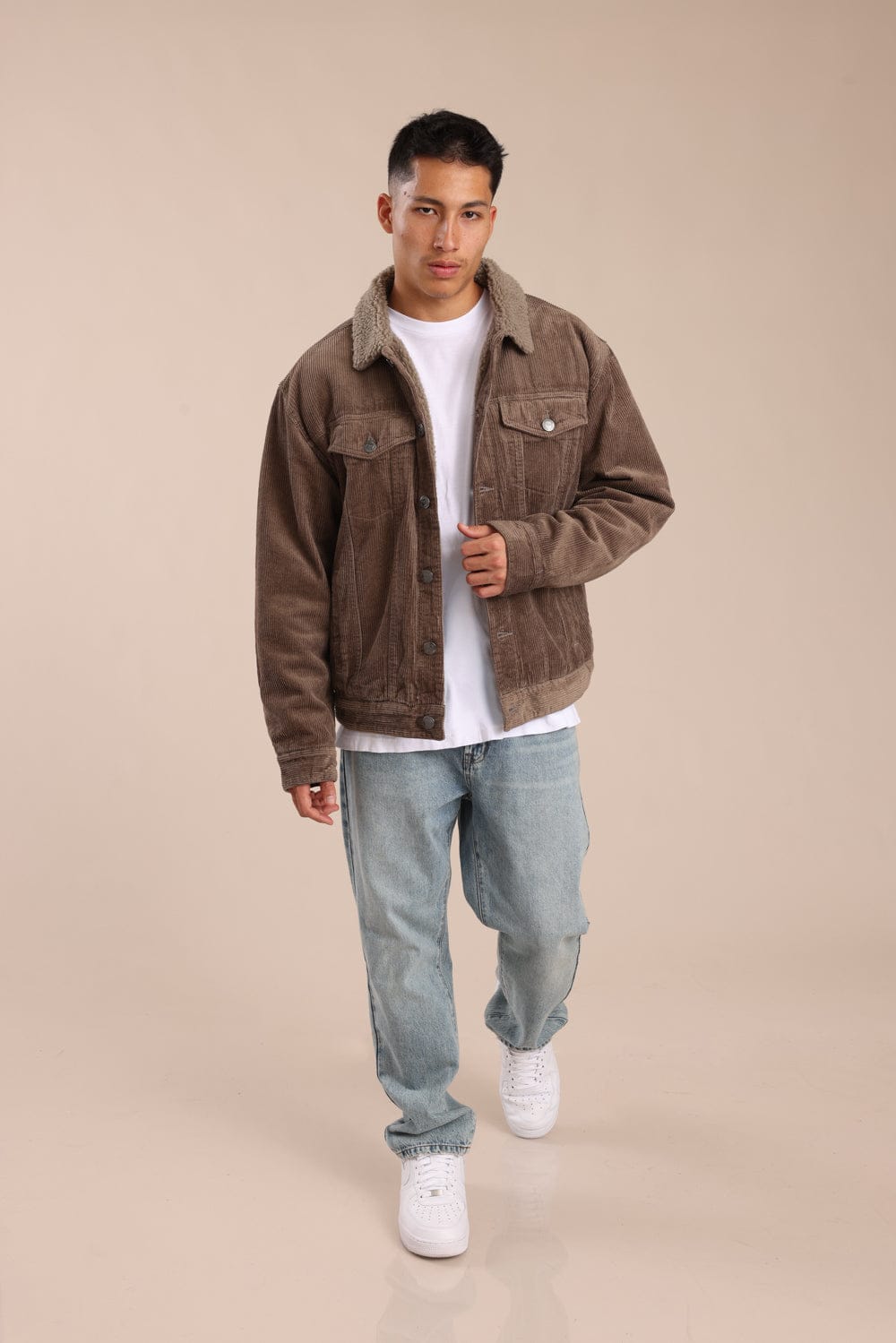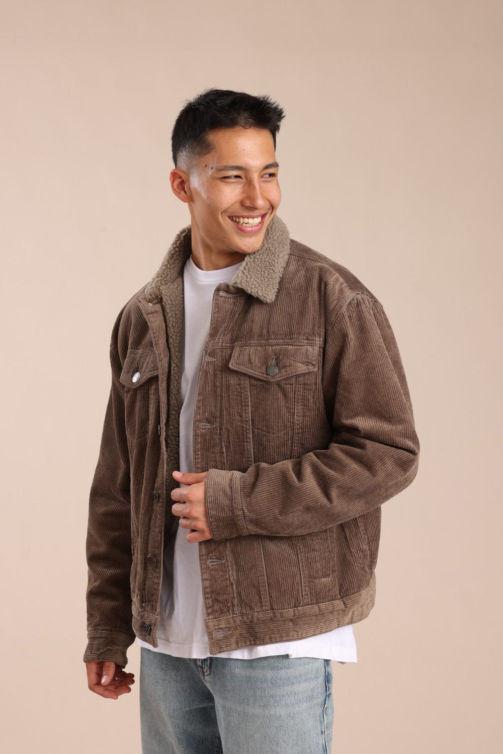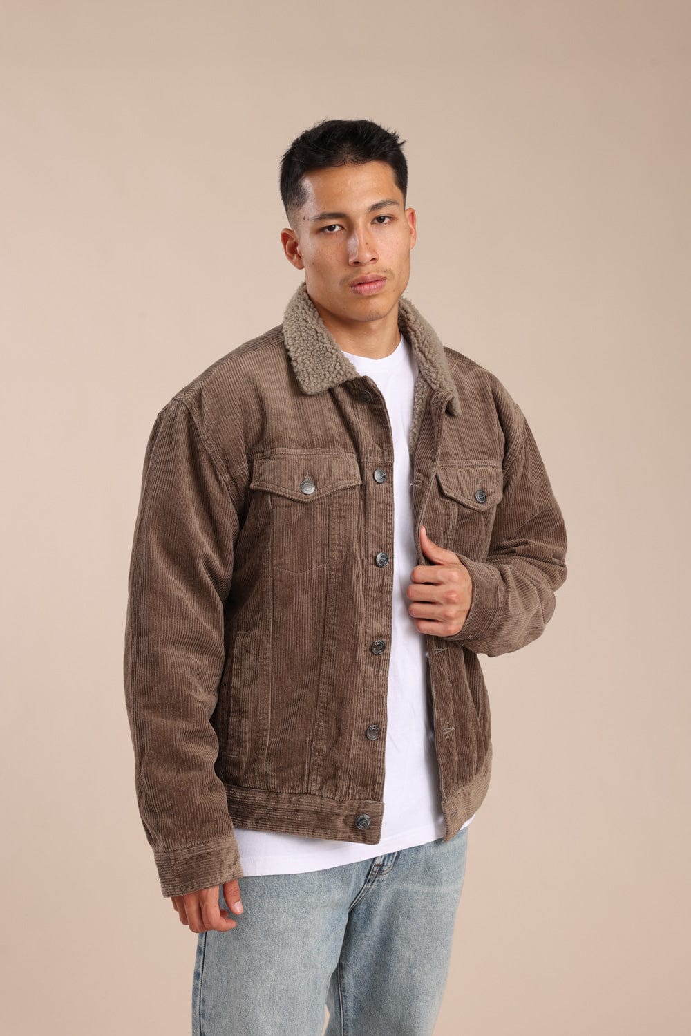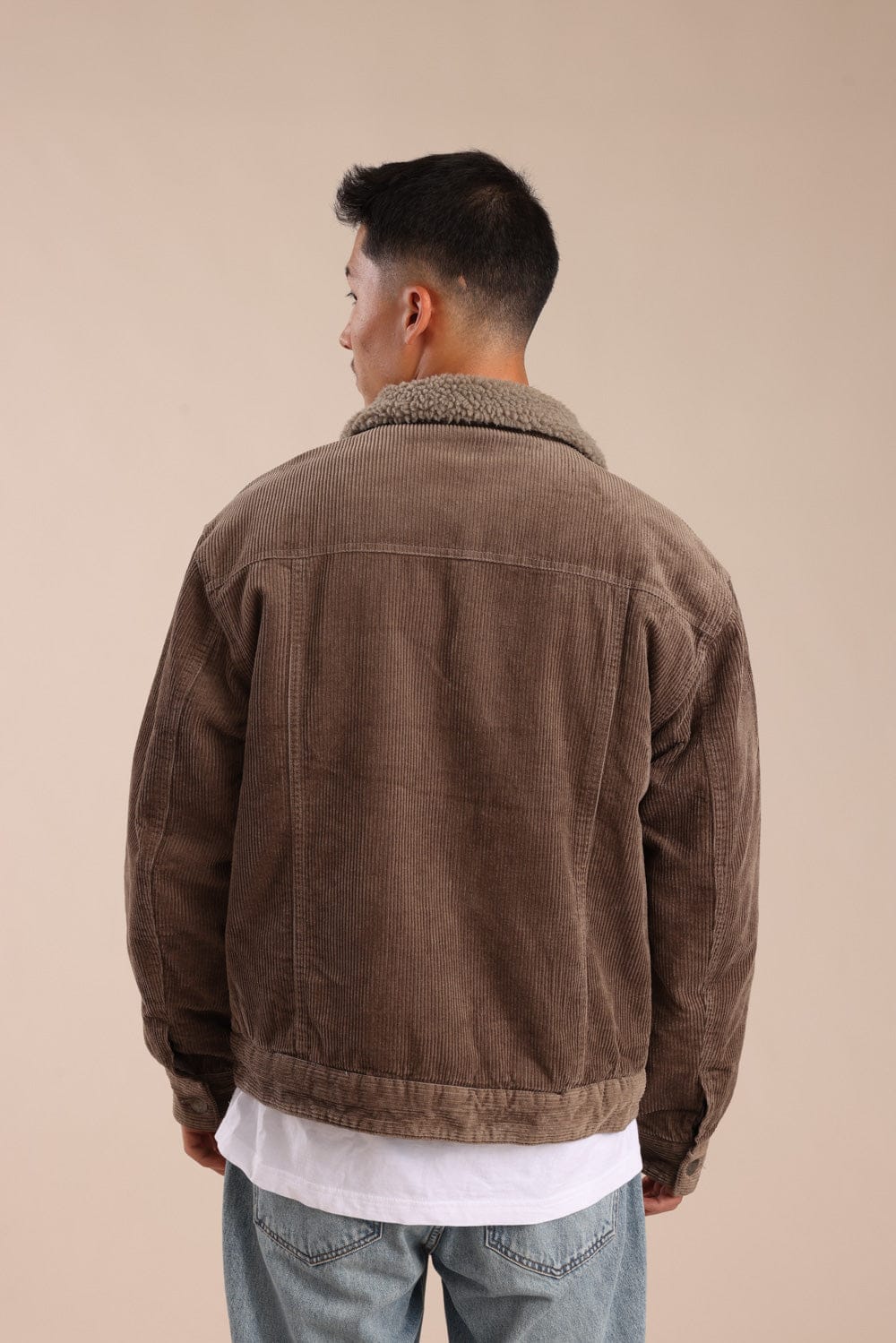 ג'קט קורדרוי קלאסי עם צווארון פרווה הכולל סגירת כפתורים קדמית ושני כיסים בחזה