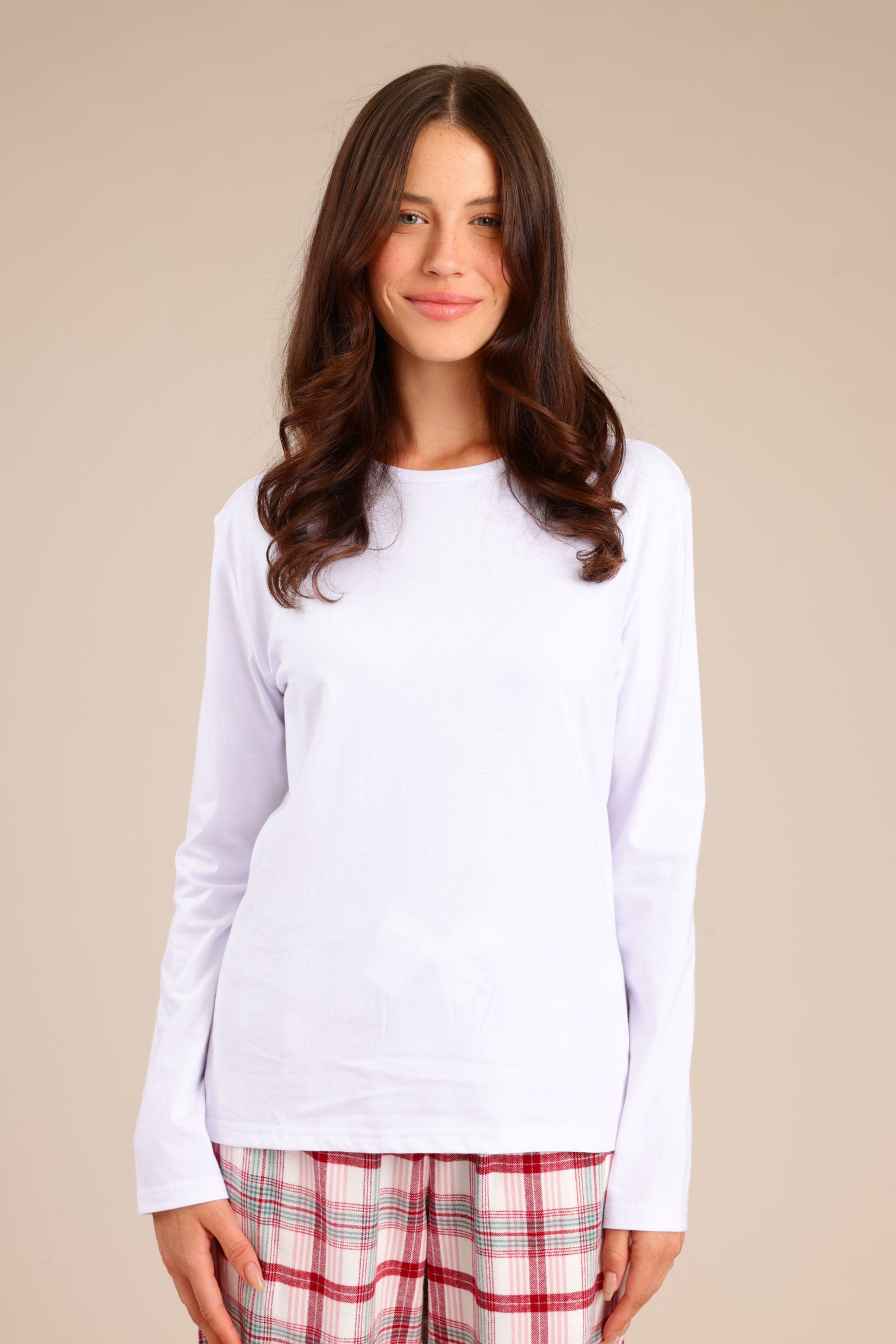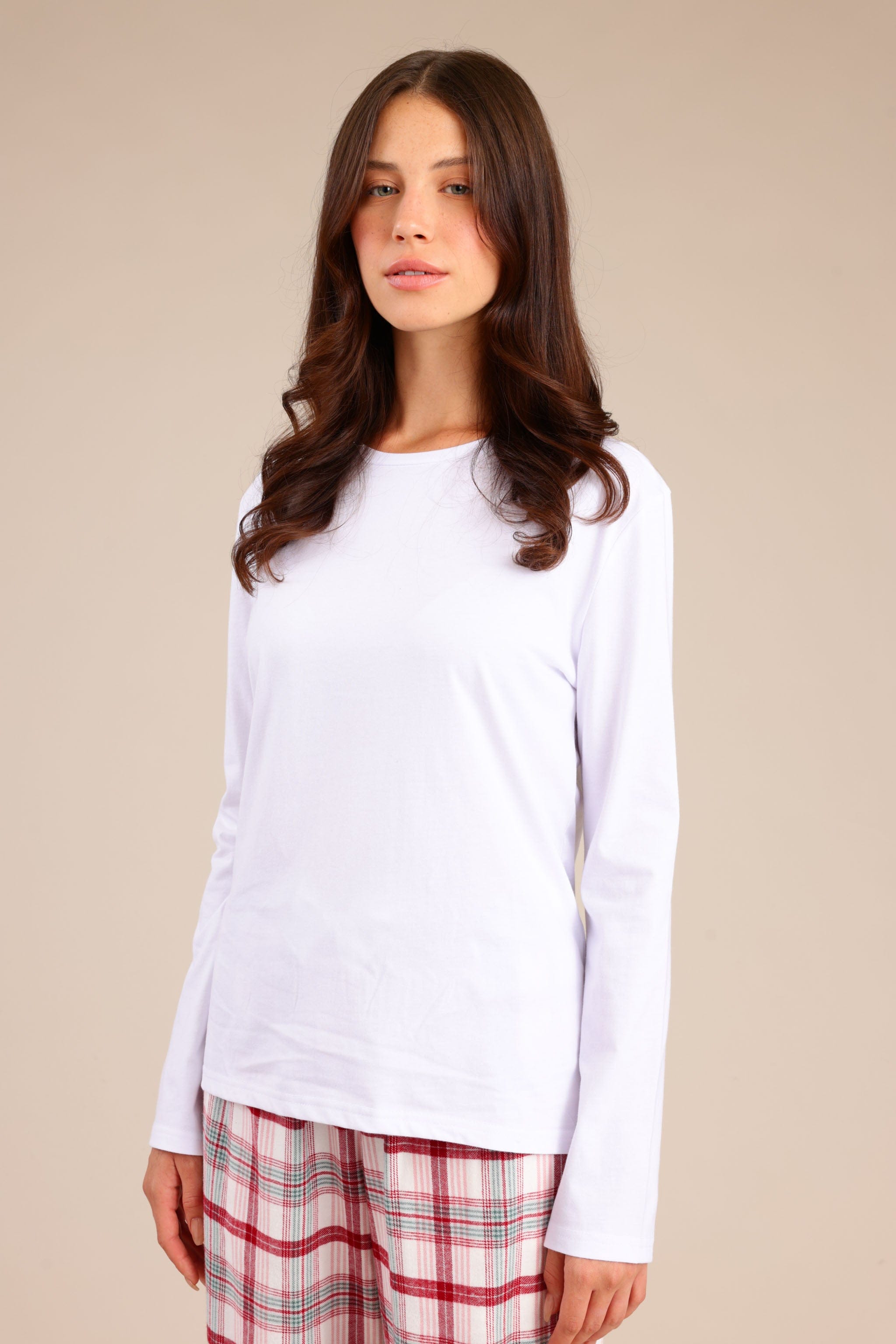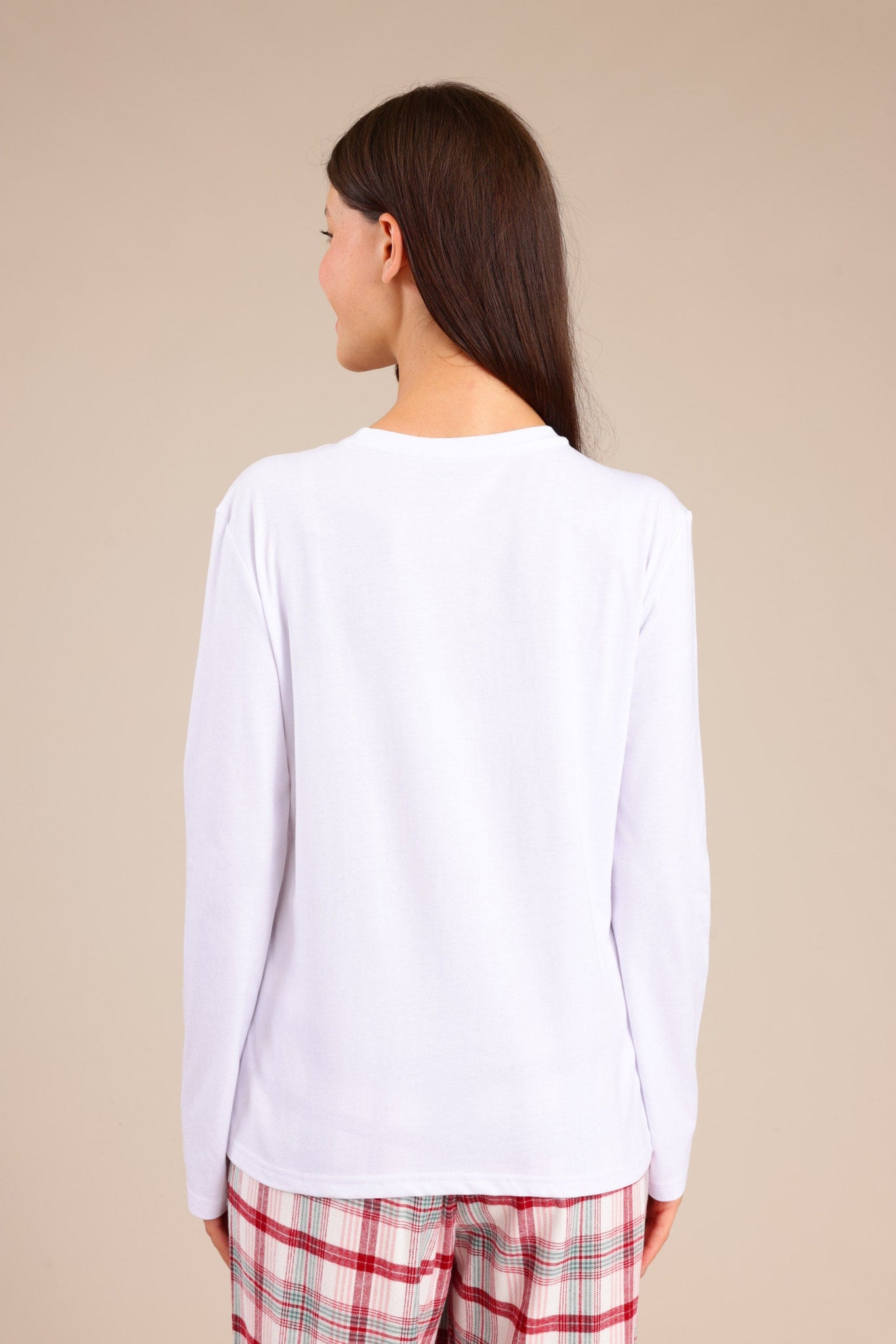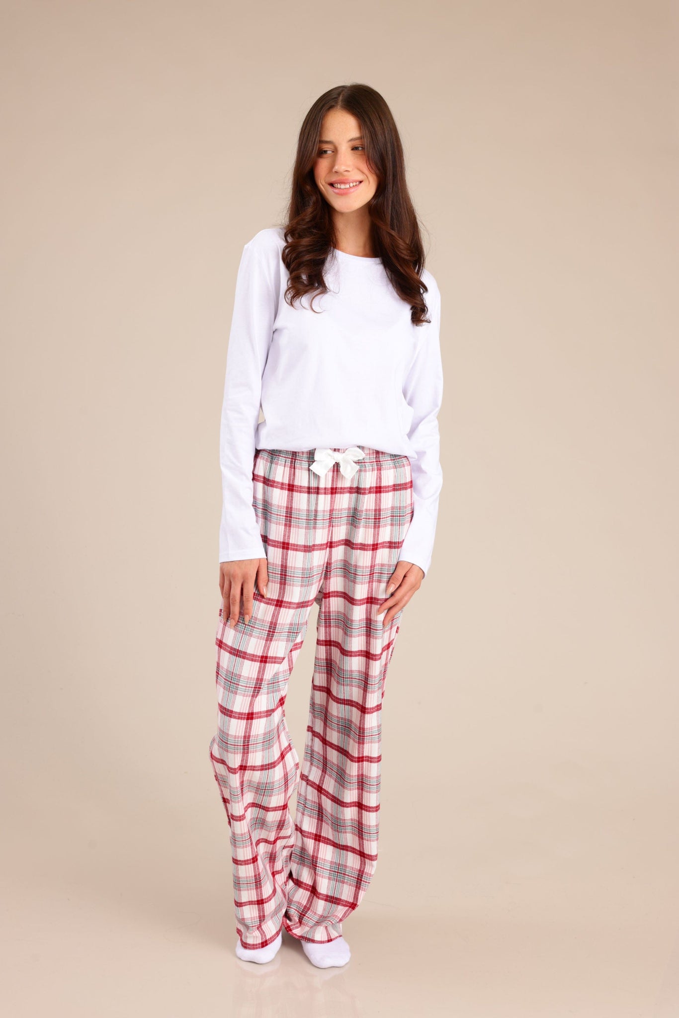 פיג'מת נשים הכוללת טי שרט חלקה ומכנס אוברסייז משובץ