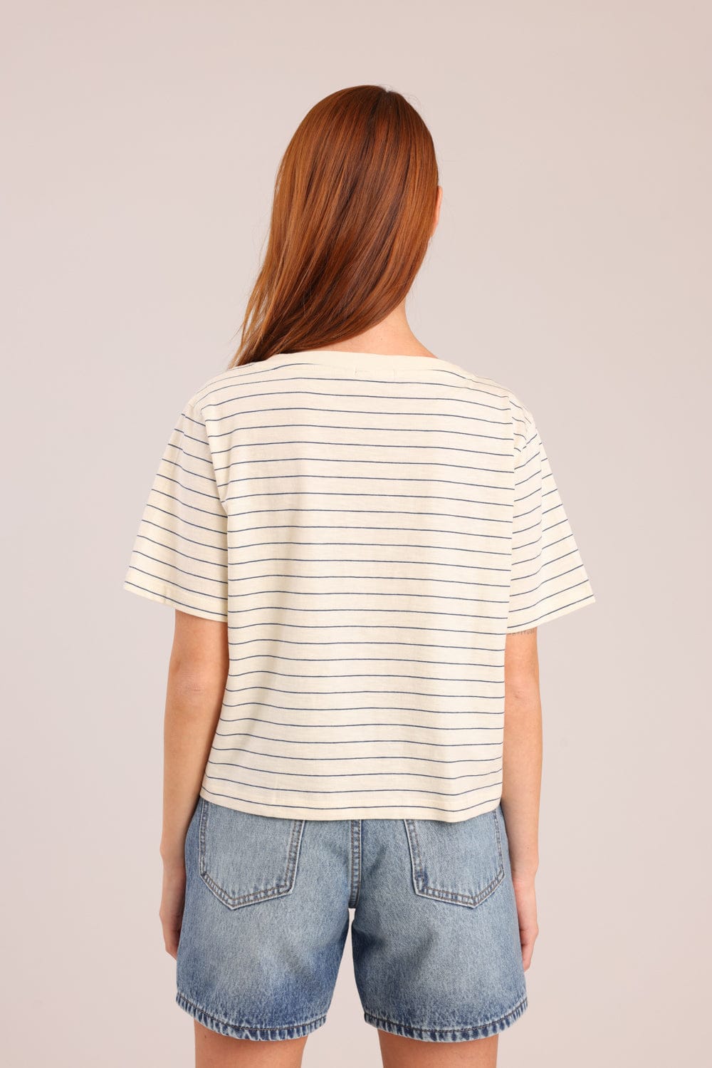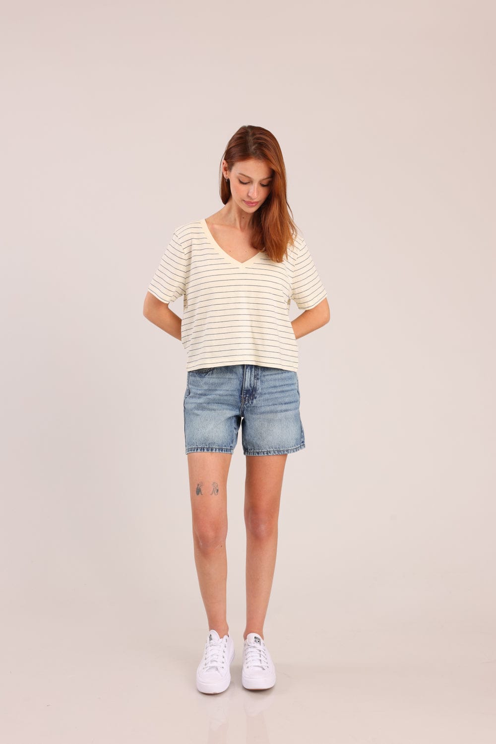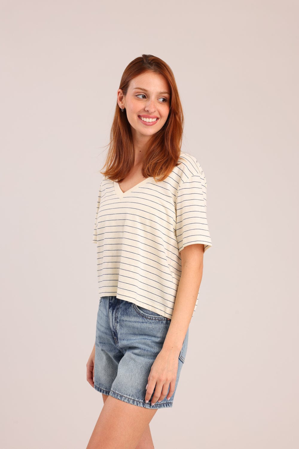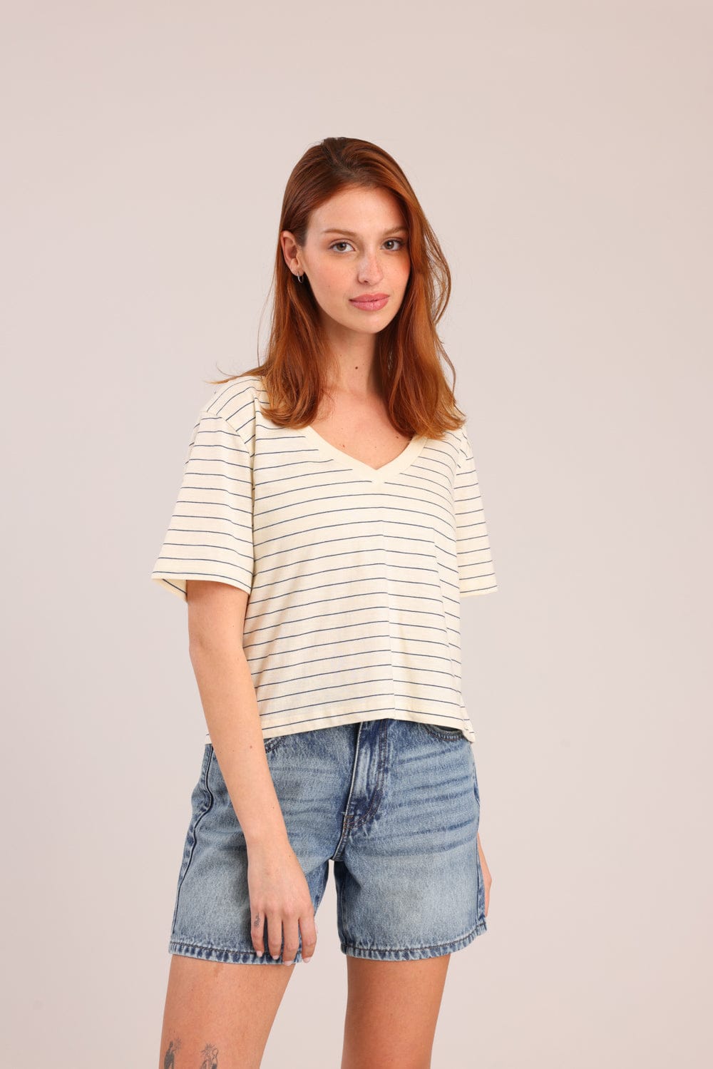 חולצת טישרט עם פסים לרוחב וצווארון V.