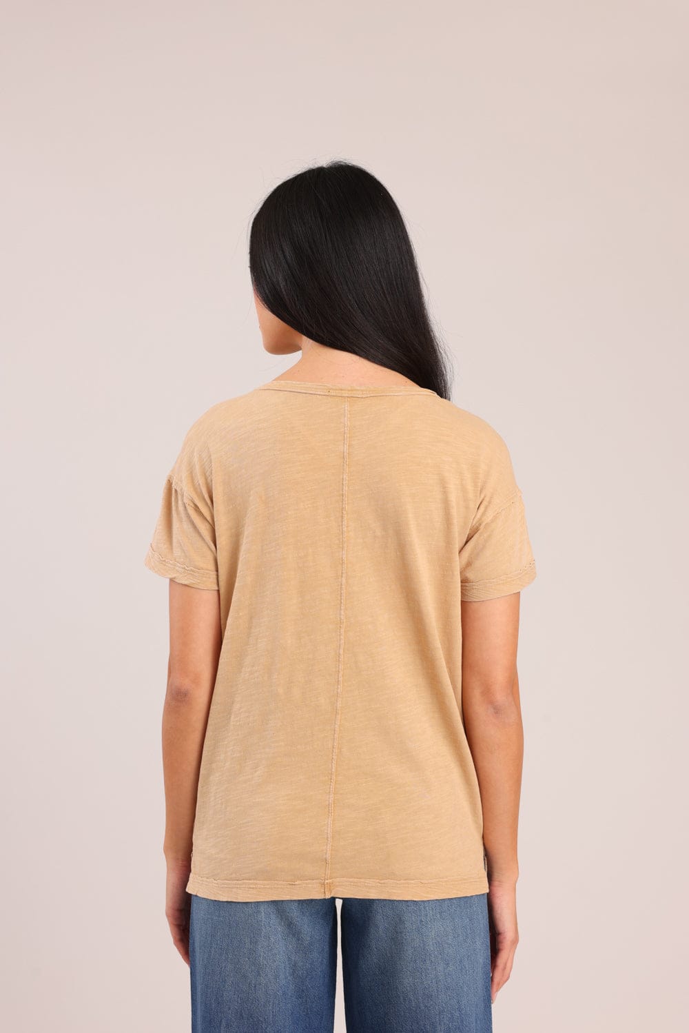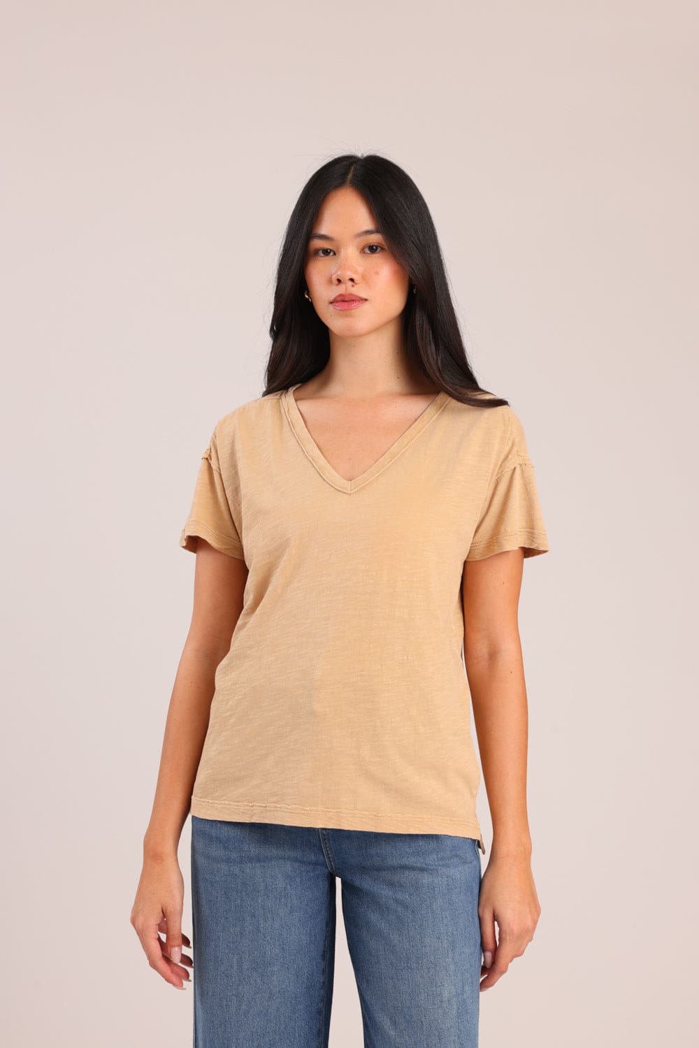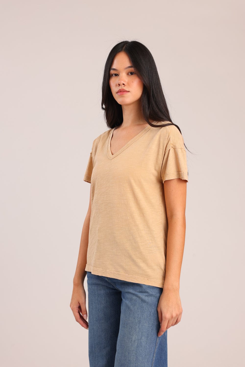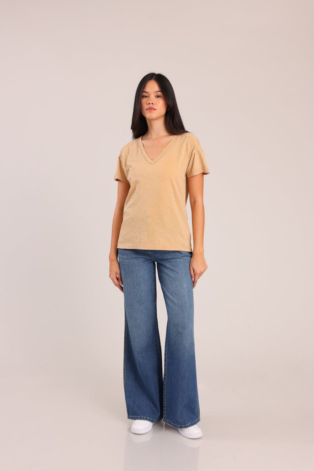 חולצת טריקו נשים 100% כותנה בגזרת אוברסייז עם צווארון V.