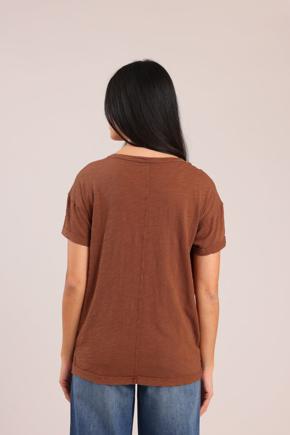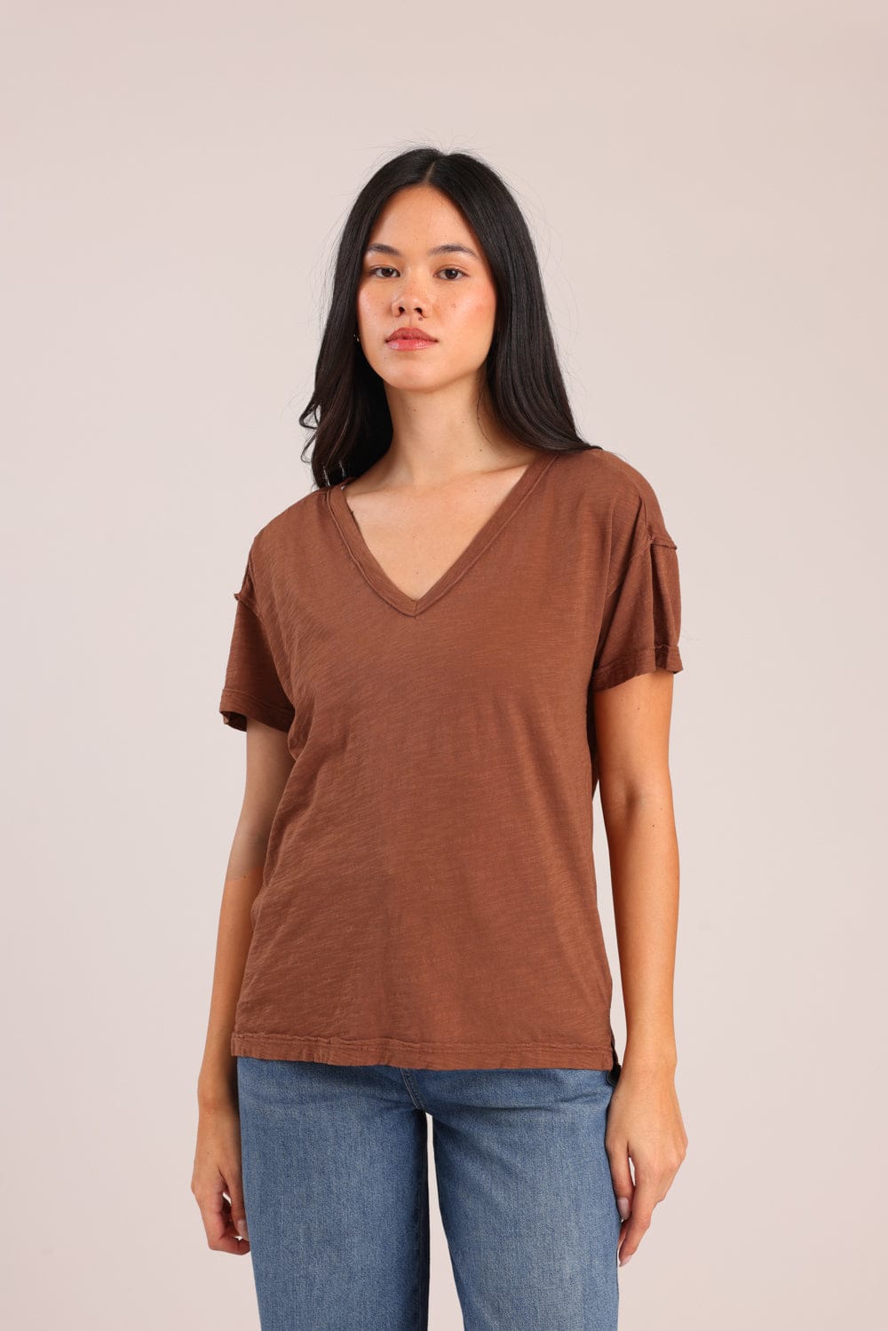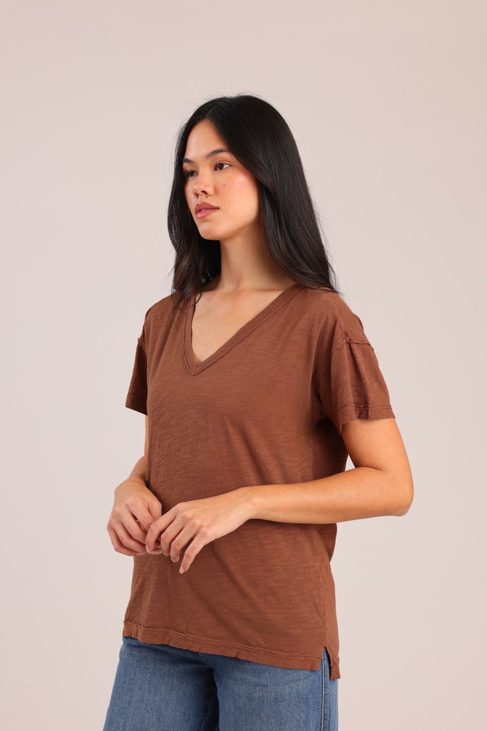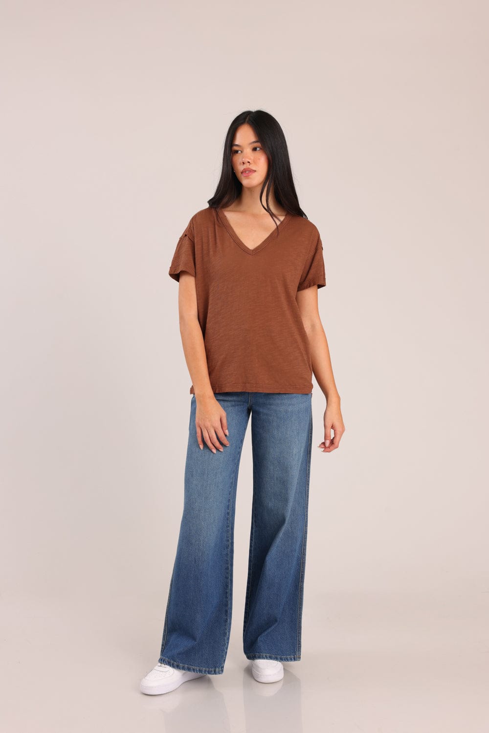 חולצת טריקו נשים 100% כותנה בגזרת אוברסייז עם צווארון V.