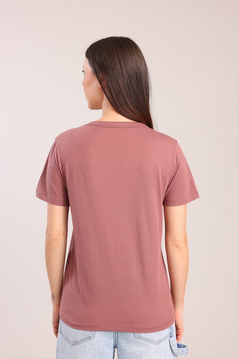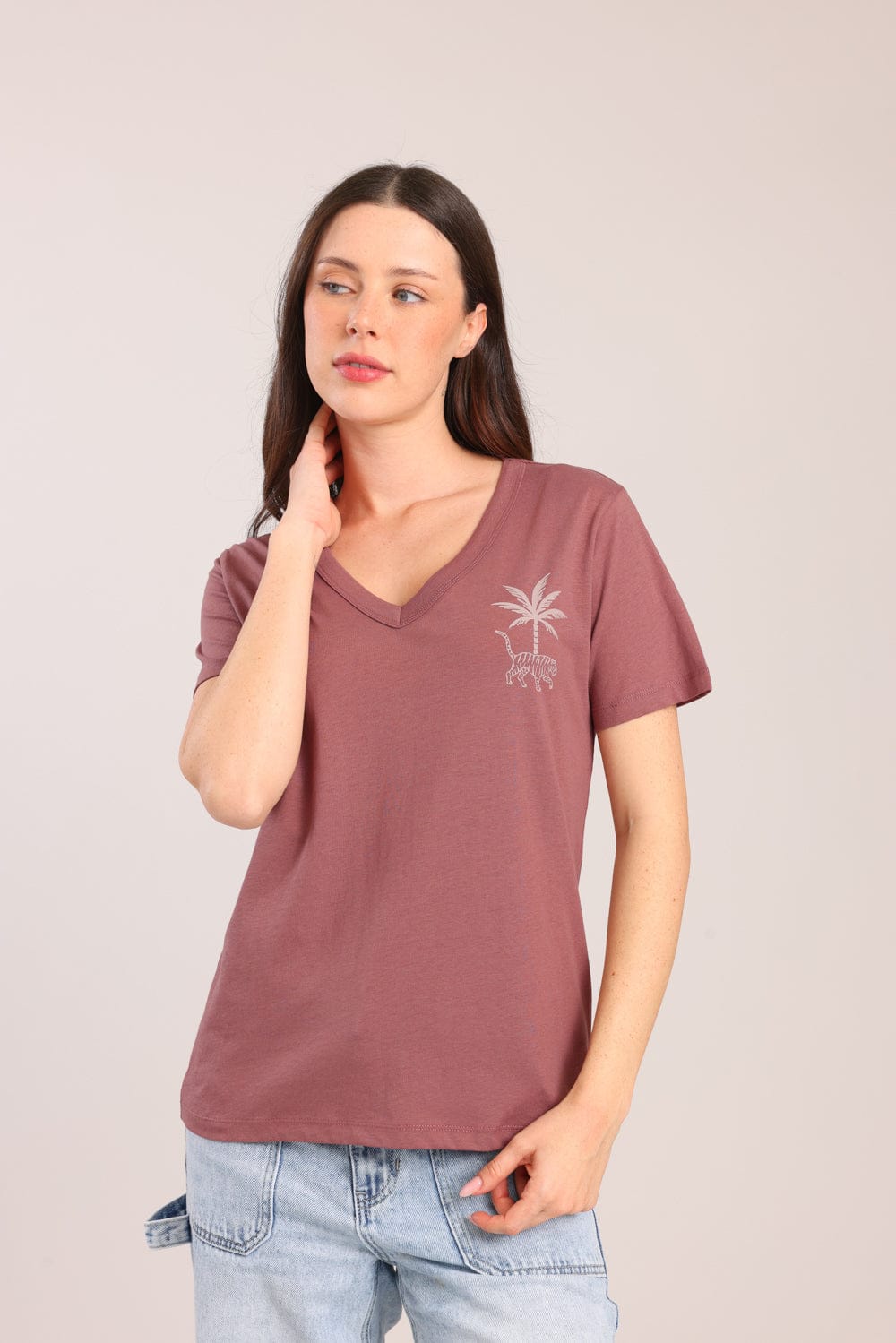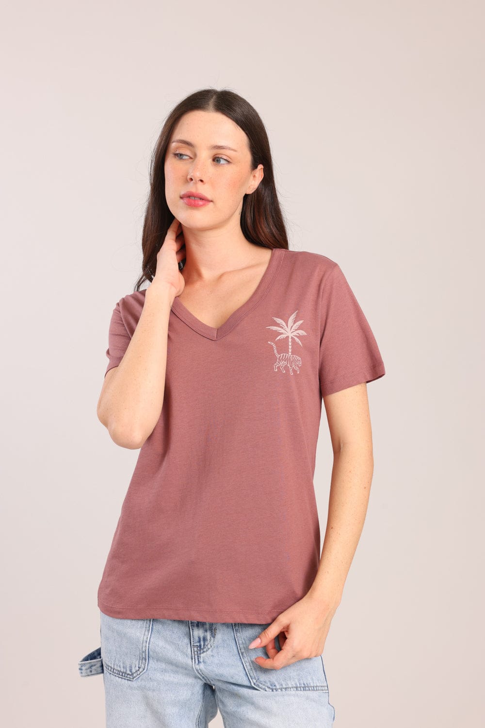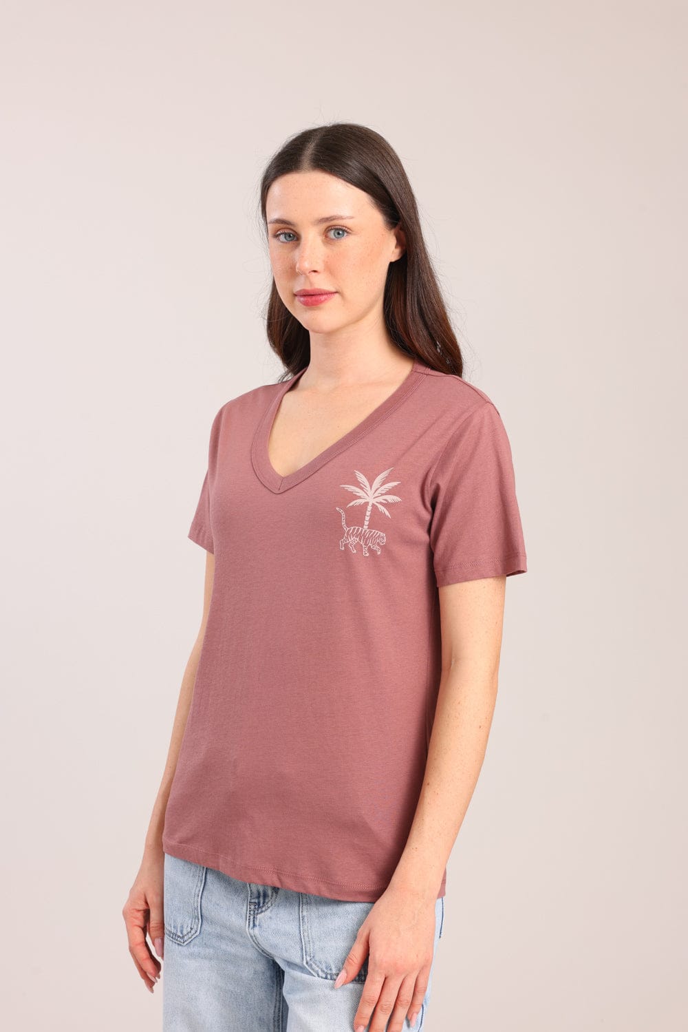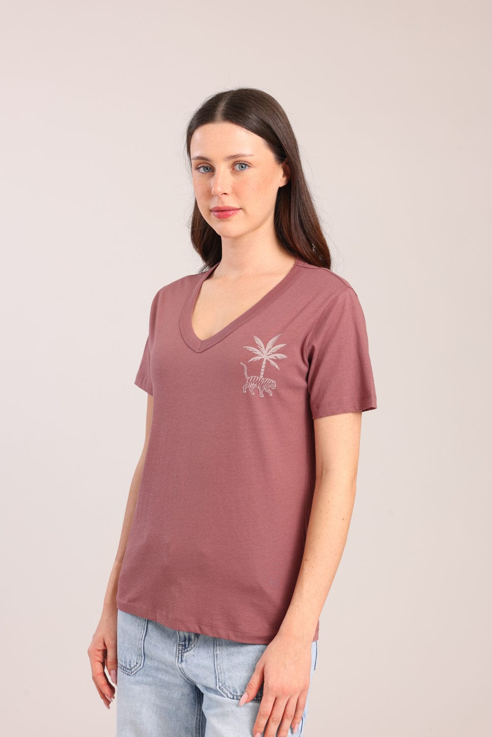 חולצת טישרט נשים , צווארון V עם הדפס.