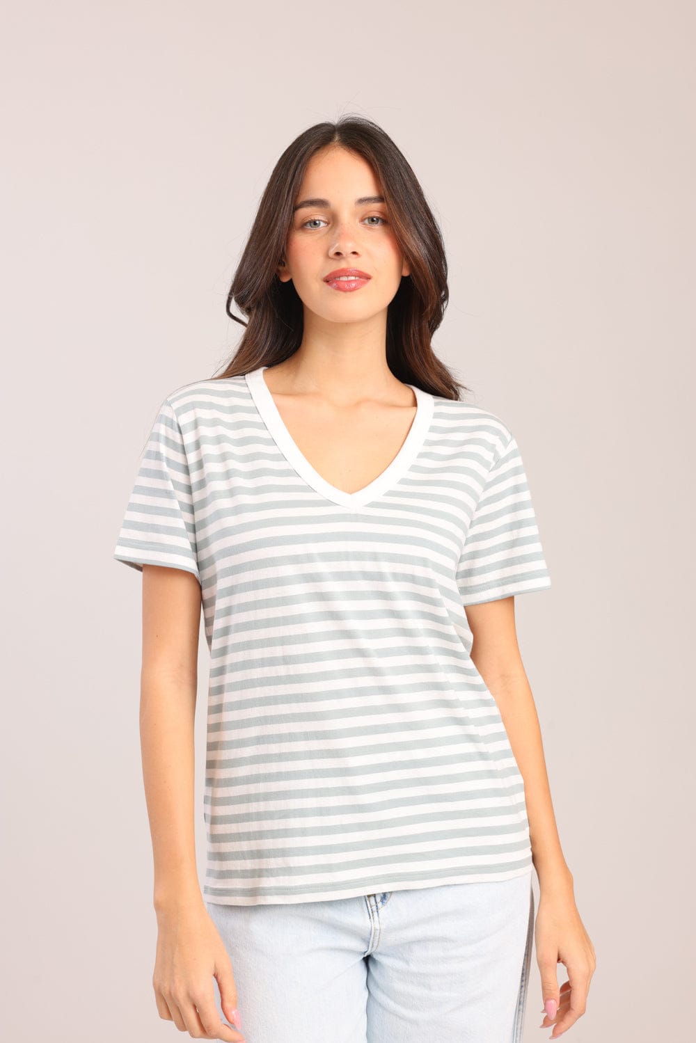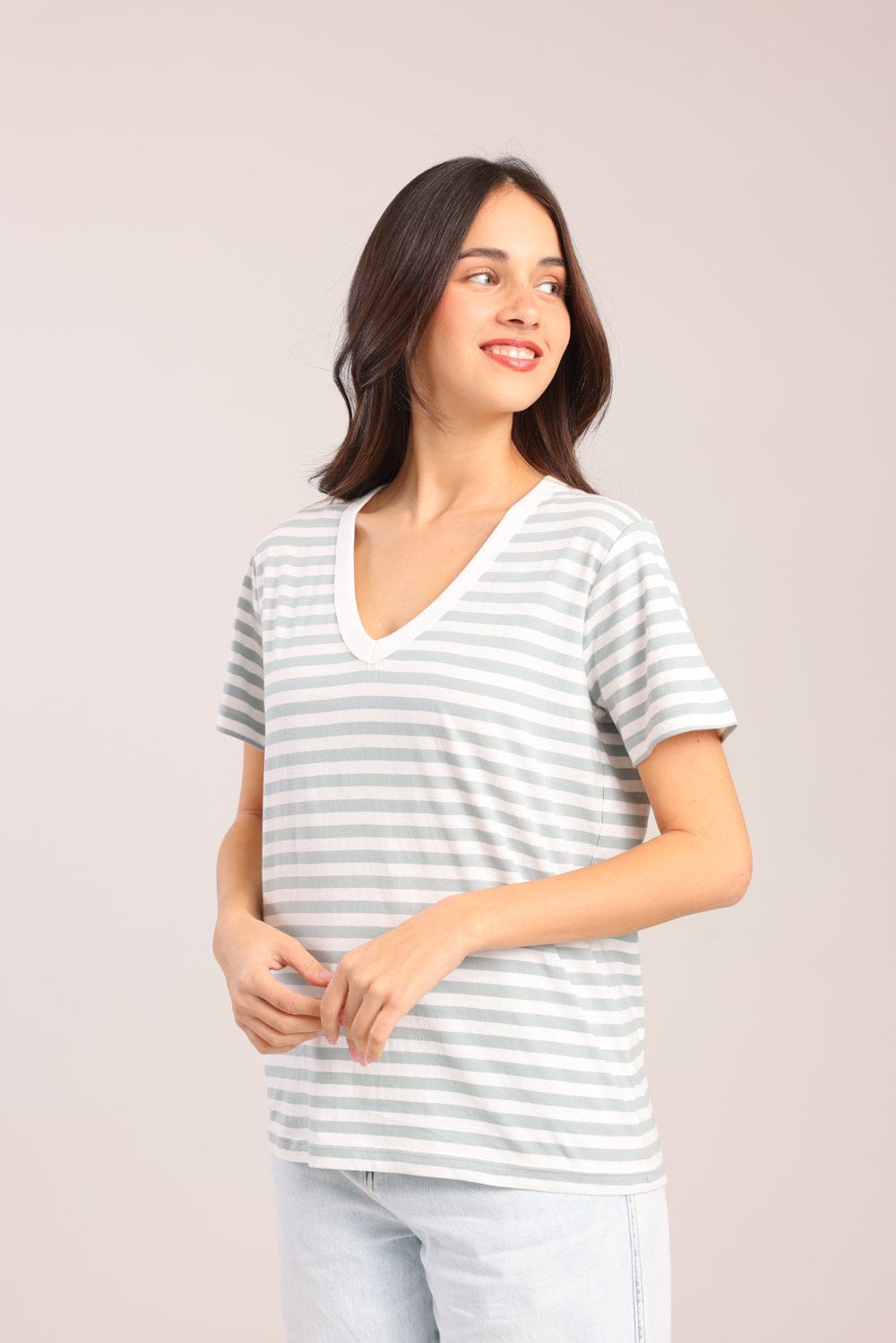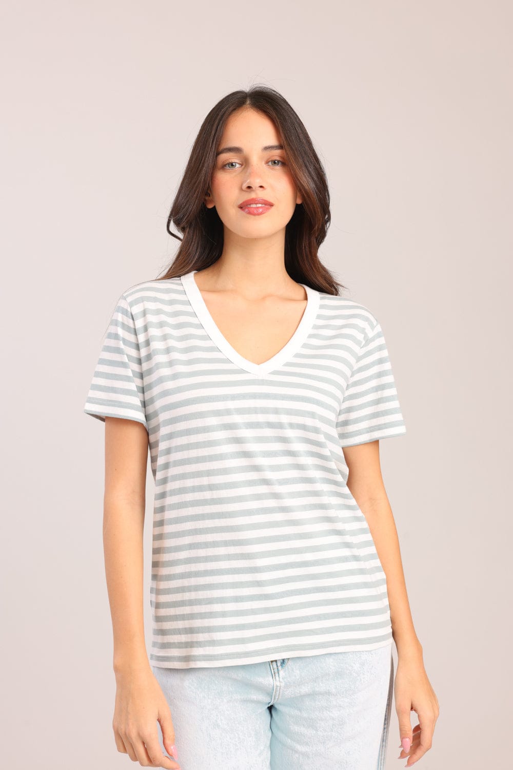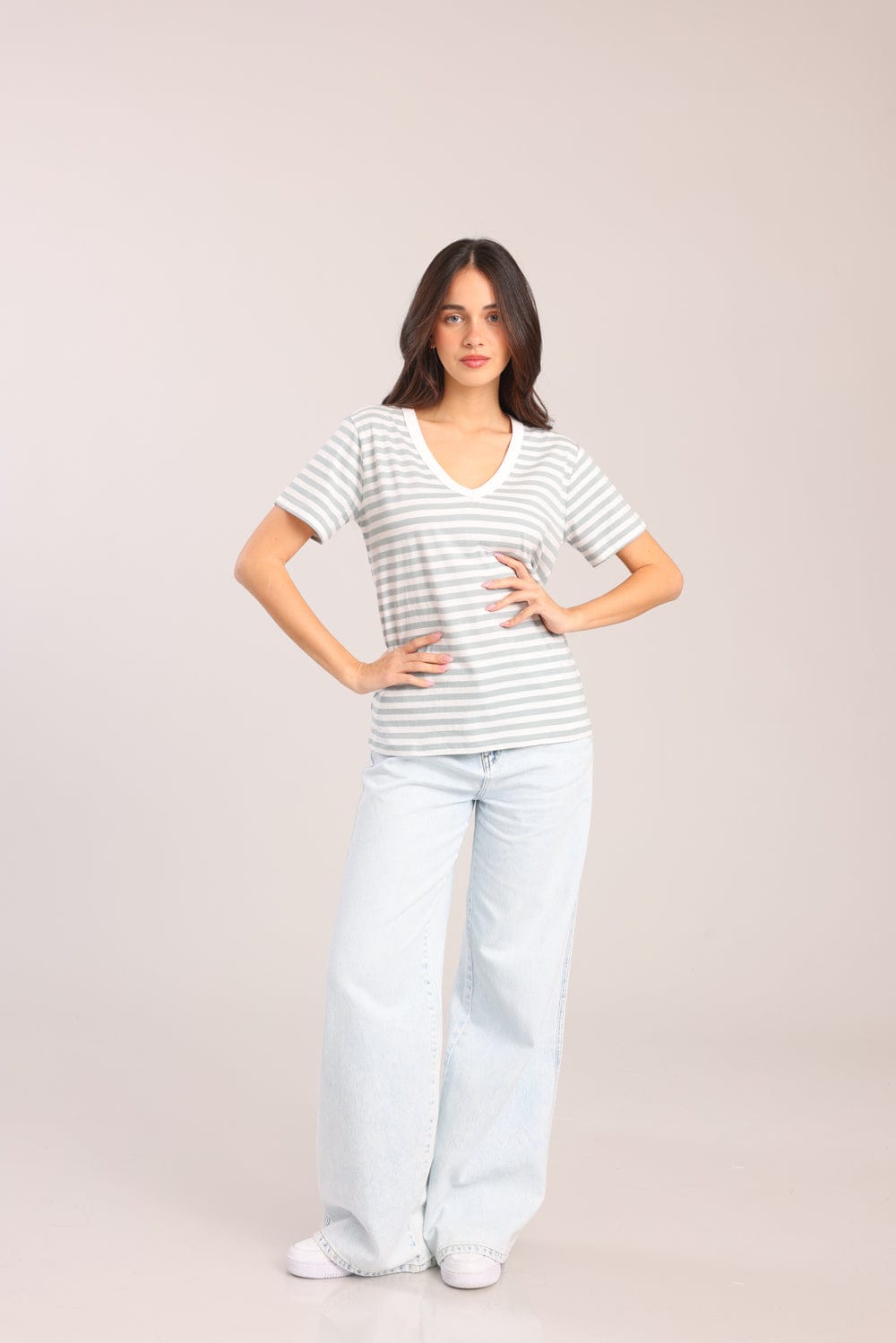 טישרט נשים קצרה בגזרה רחבה, הדפס פסים לרוחב עם צווארון V.