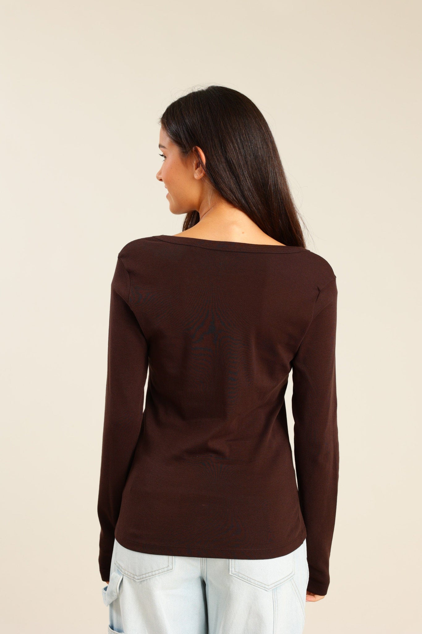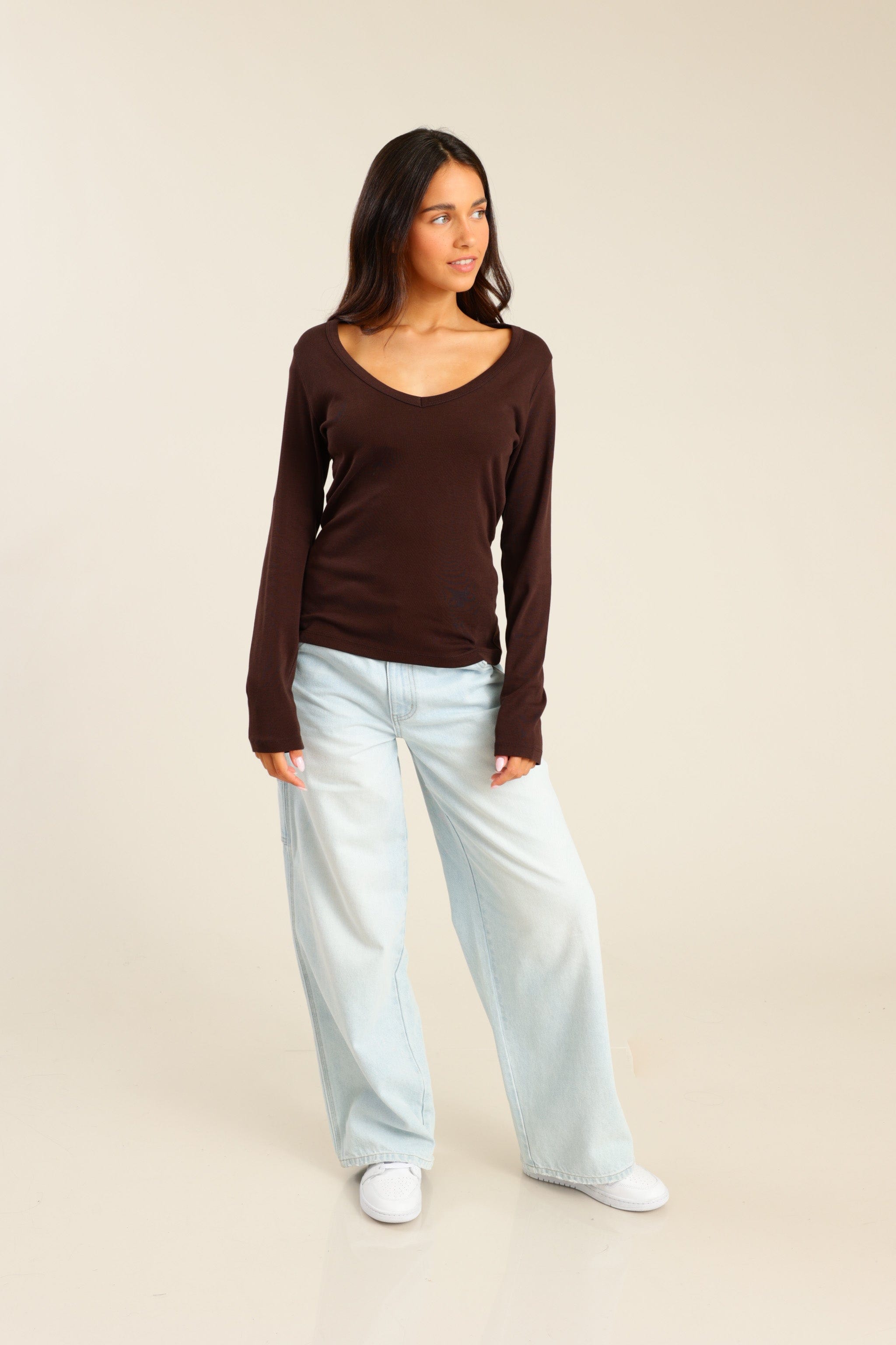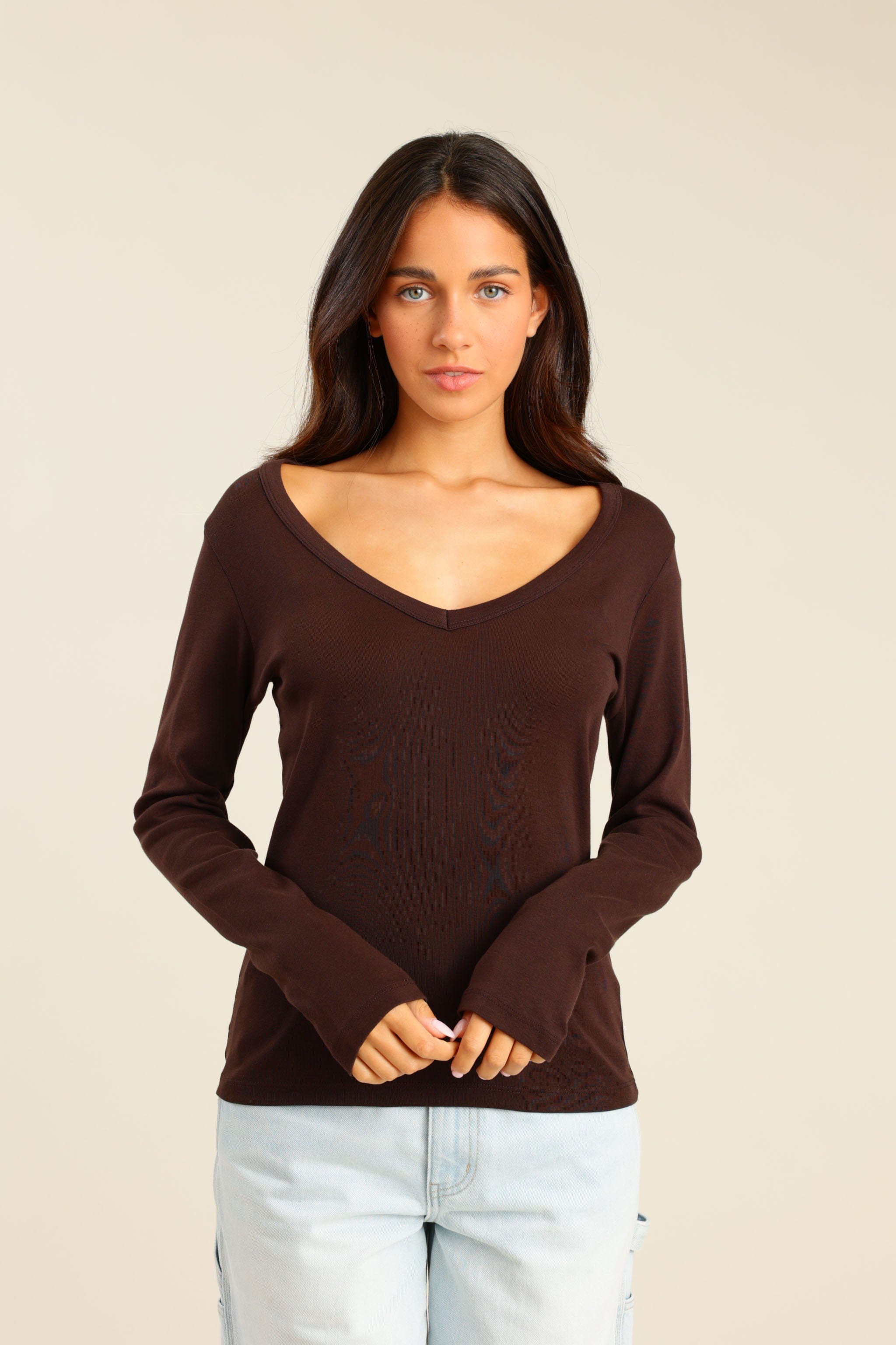חולצת בייסיק ארוכה צווארון V מבד ריב בגזרה צרה