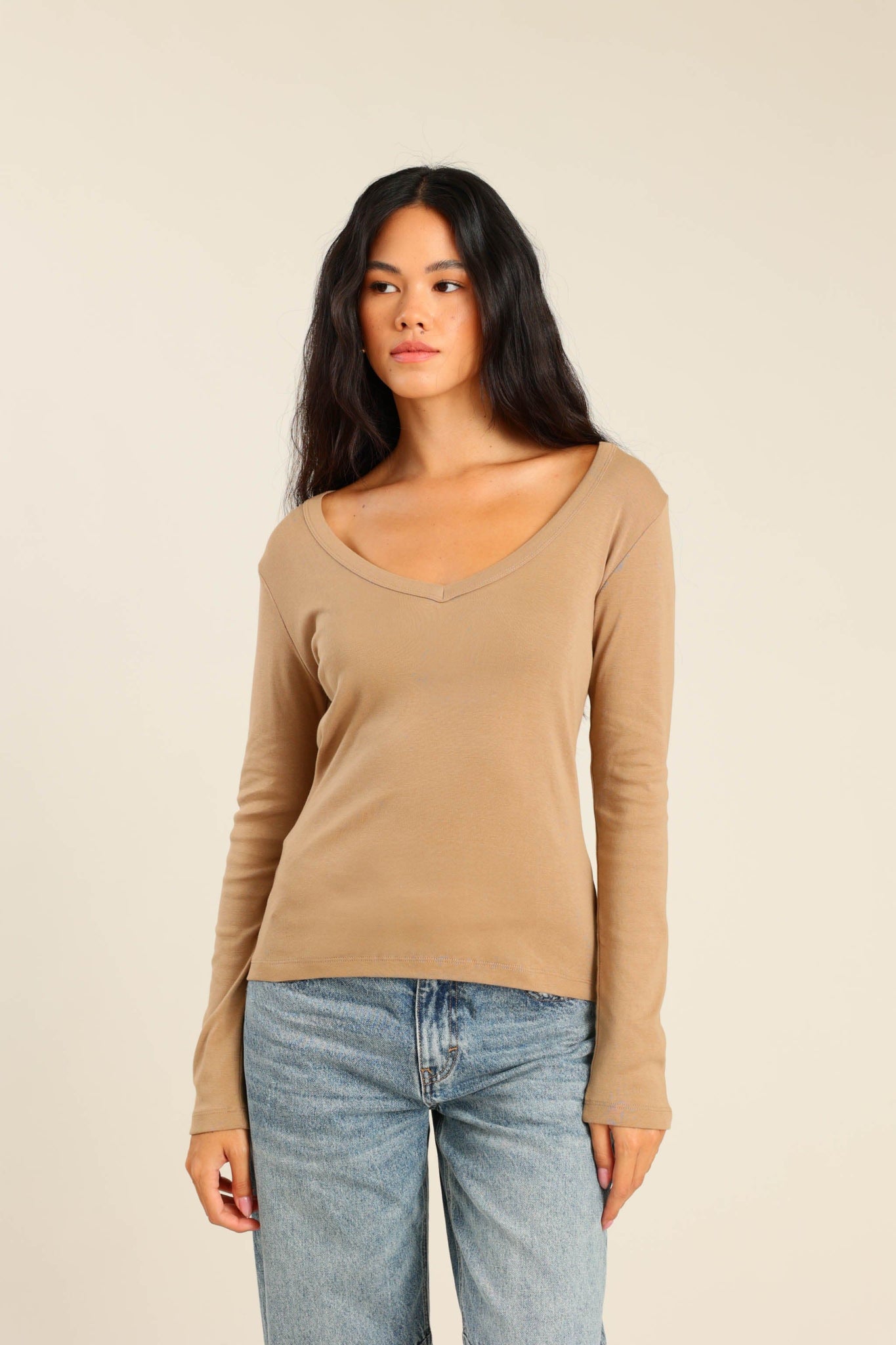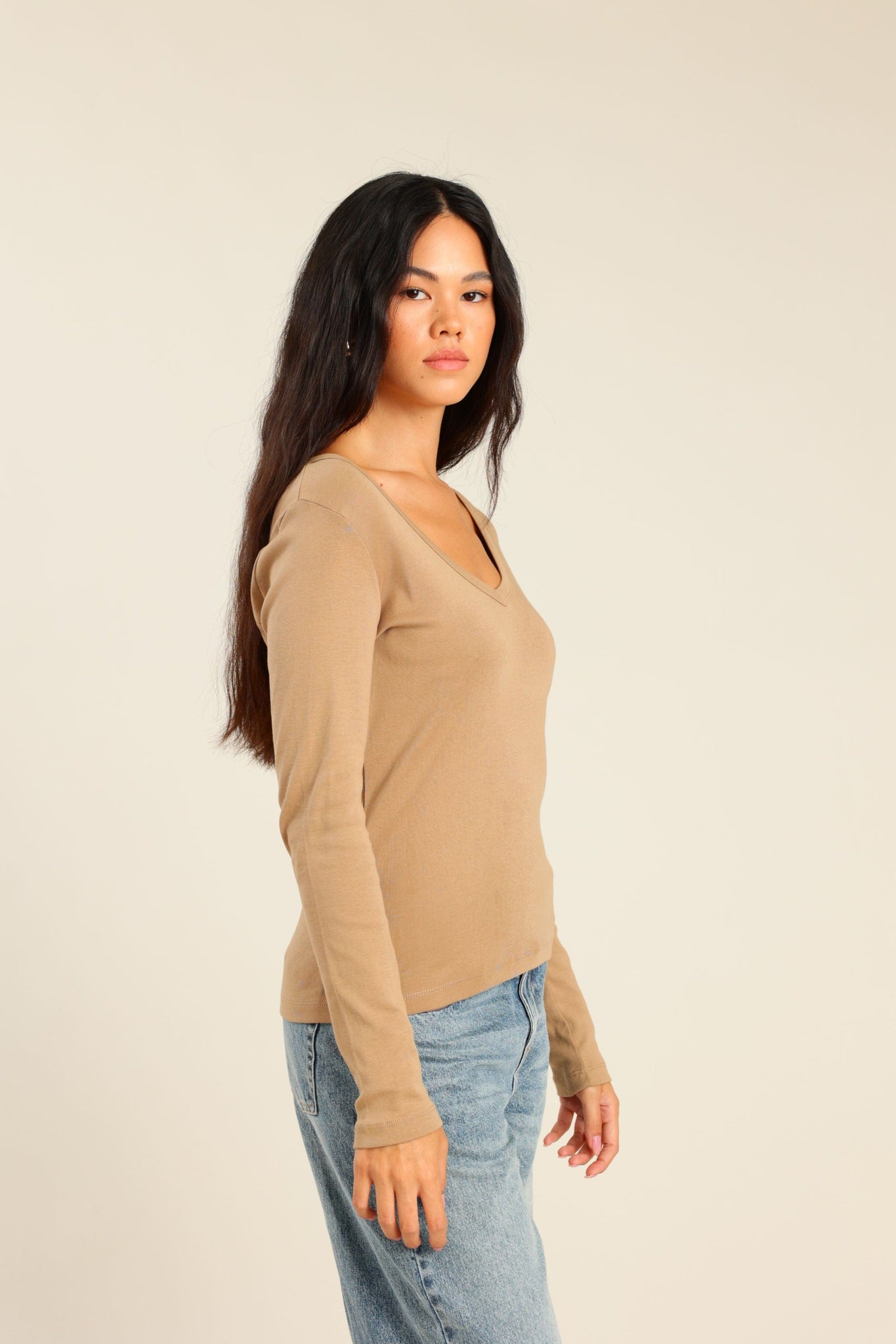 חולצת בייסיק ארוכה צווארון V מבד ריב בגזרה צרה