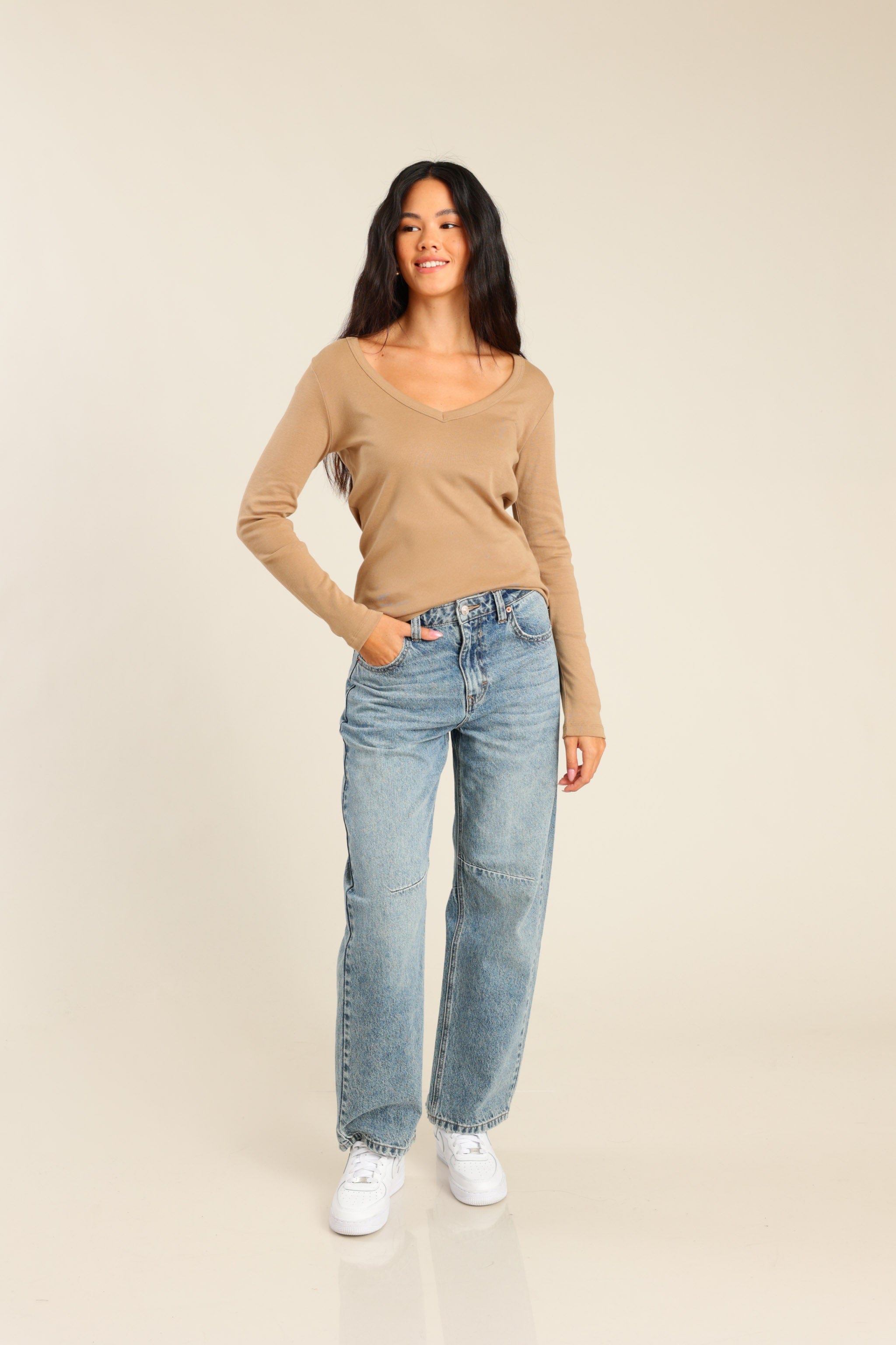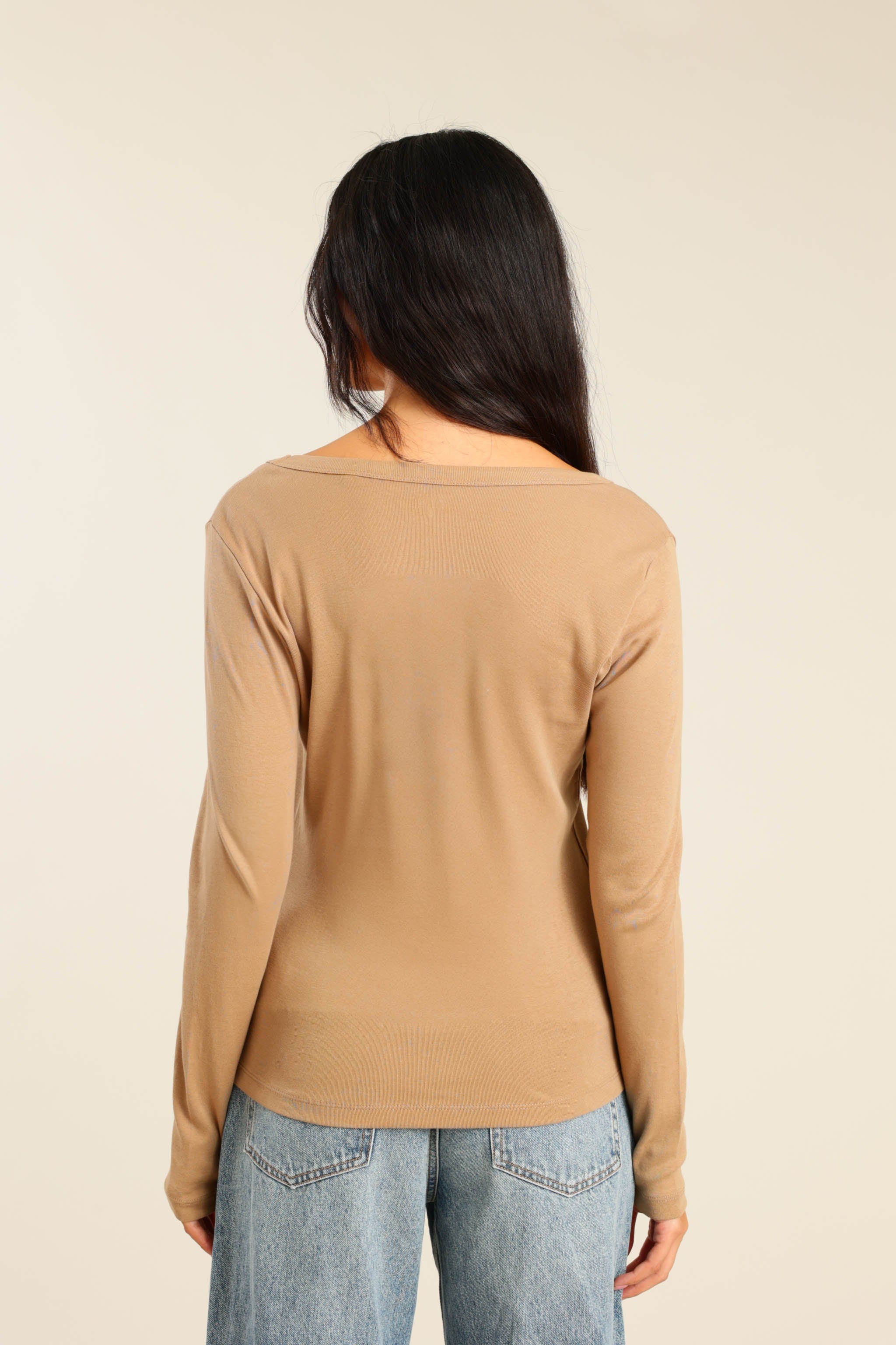 חולצה ארוכה צווארון V בצבע קרמל