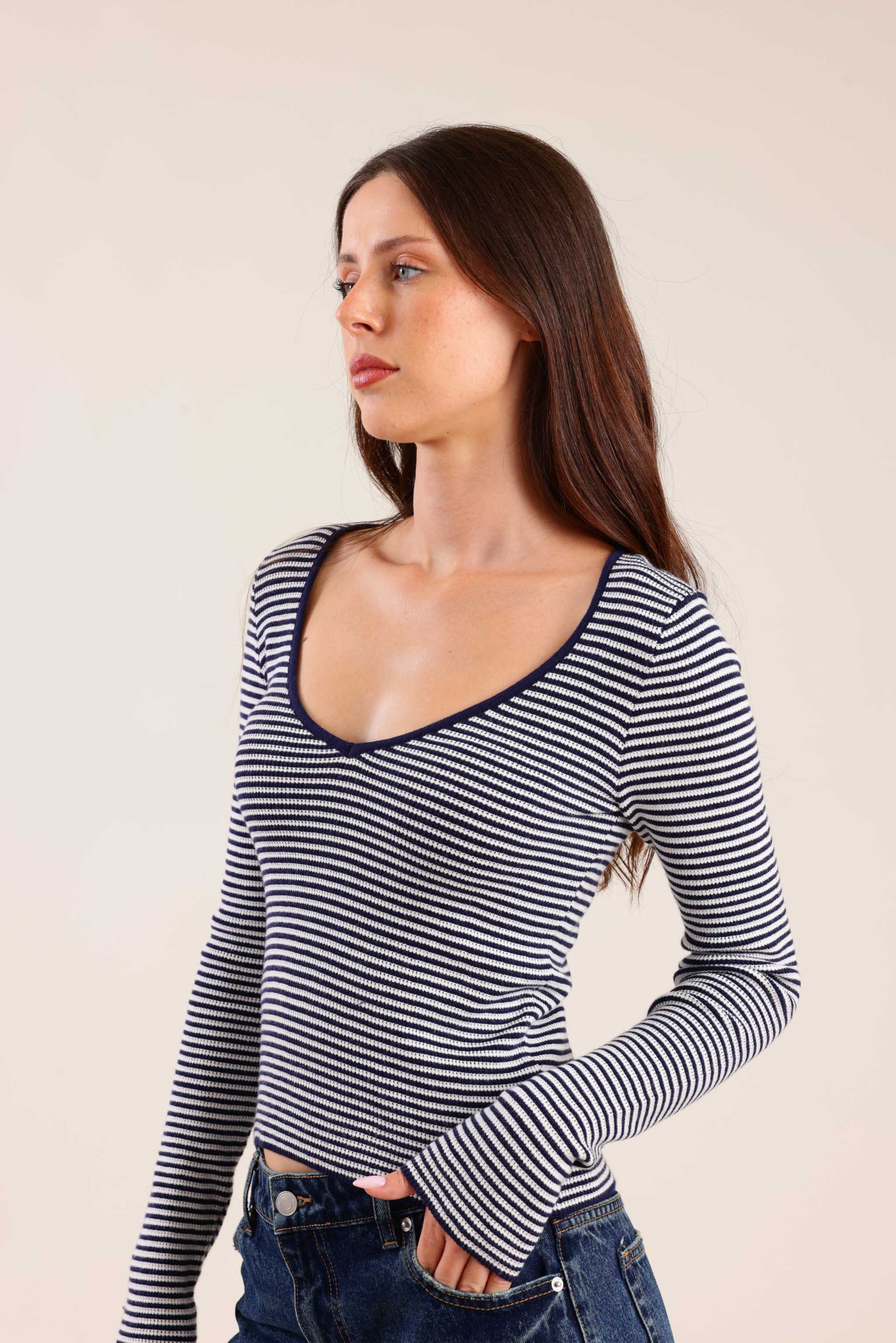 חולצת ריב עם שרוולים ארוכים ומפתח צוואר עגול בגזרה צמודה ונוחה מתאימה למראה יומיומי ואופנתי
