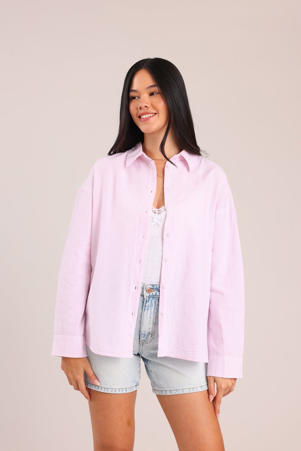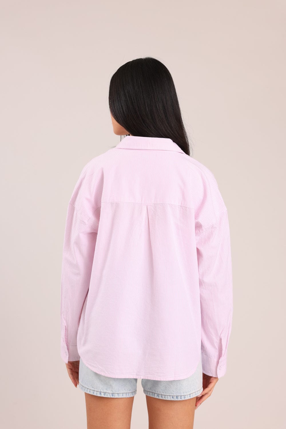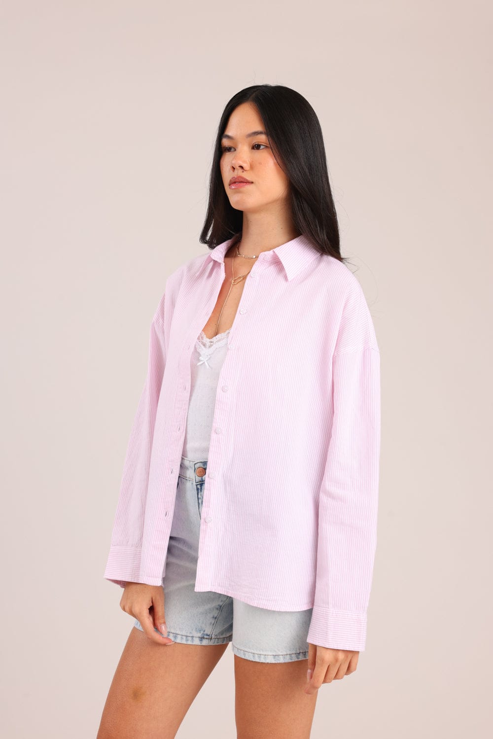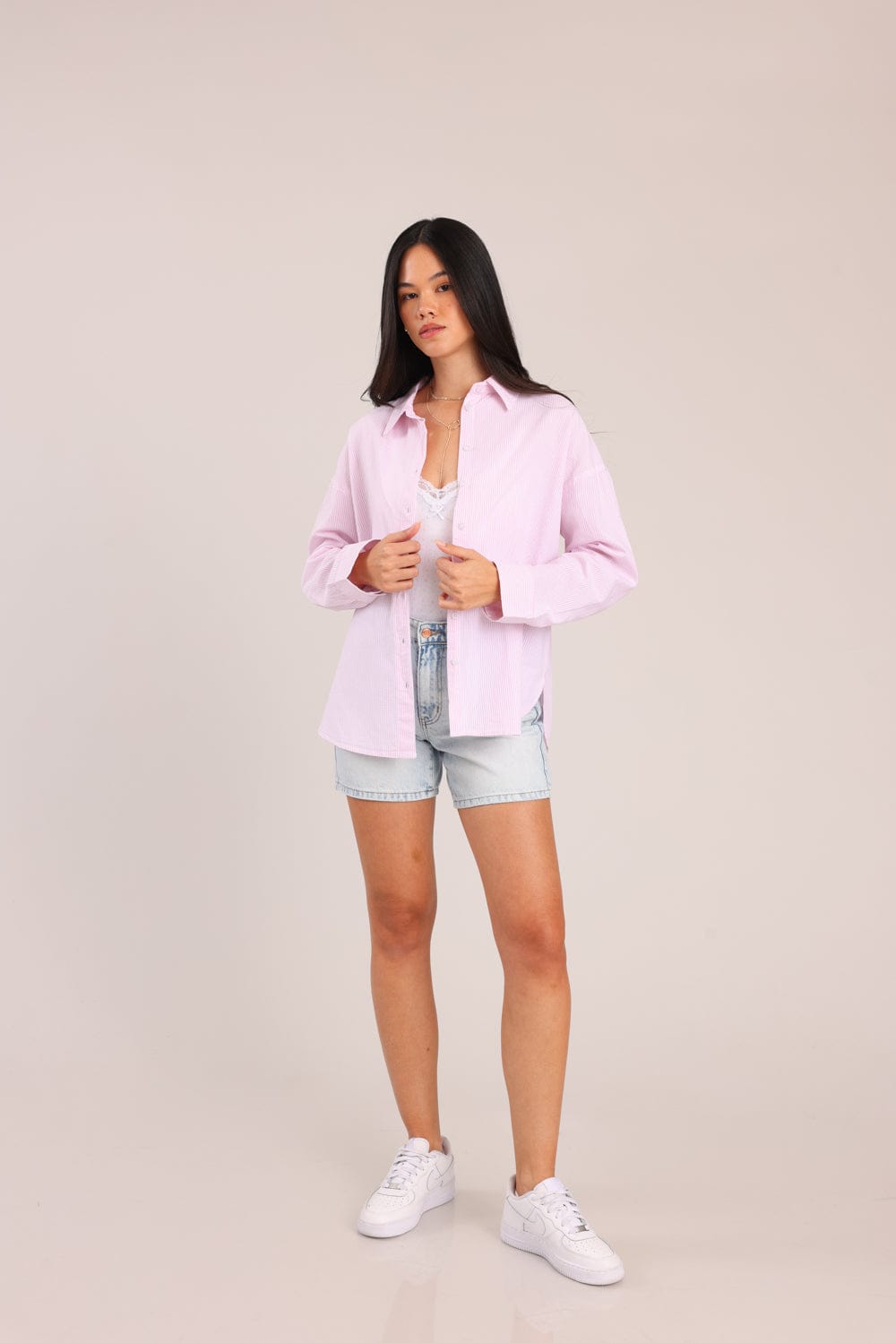 חולצת נשים מכופתרת עם צווארון, בגזרת אוברסייז עם פסים דקים לאורך.