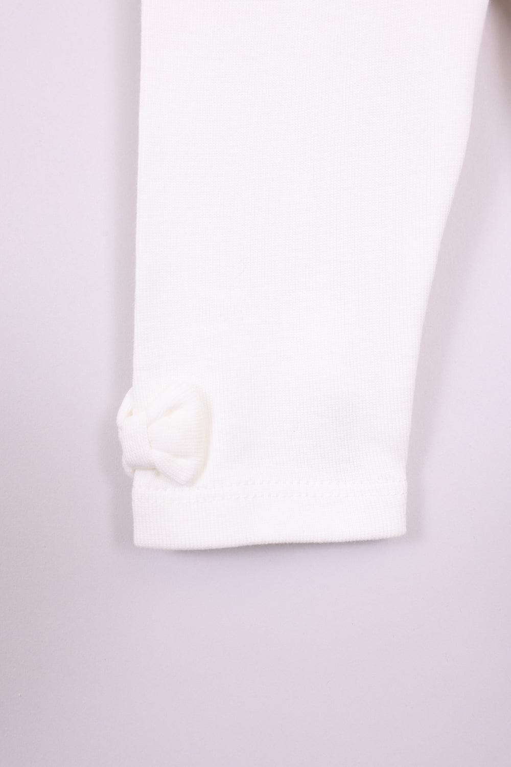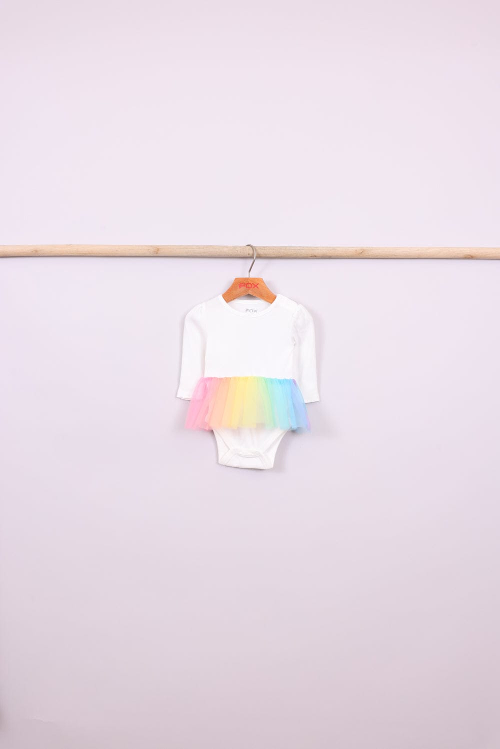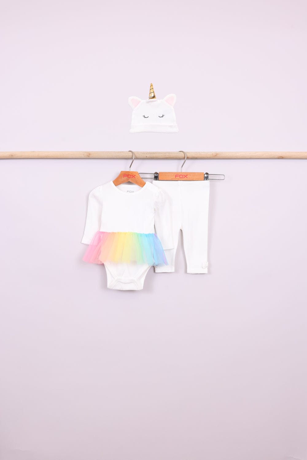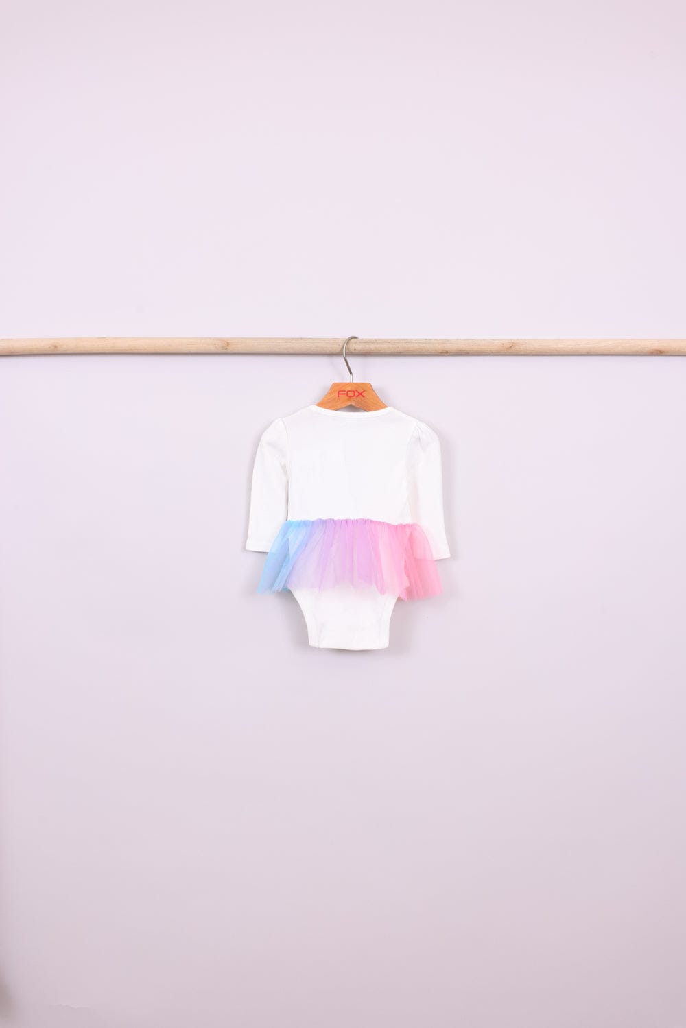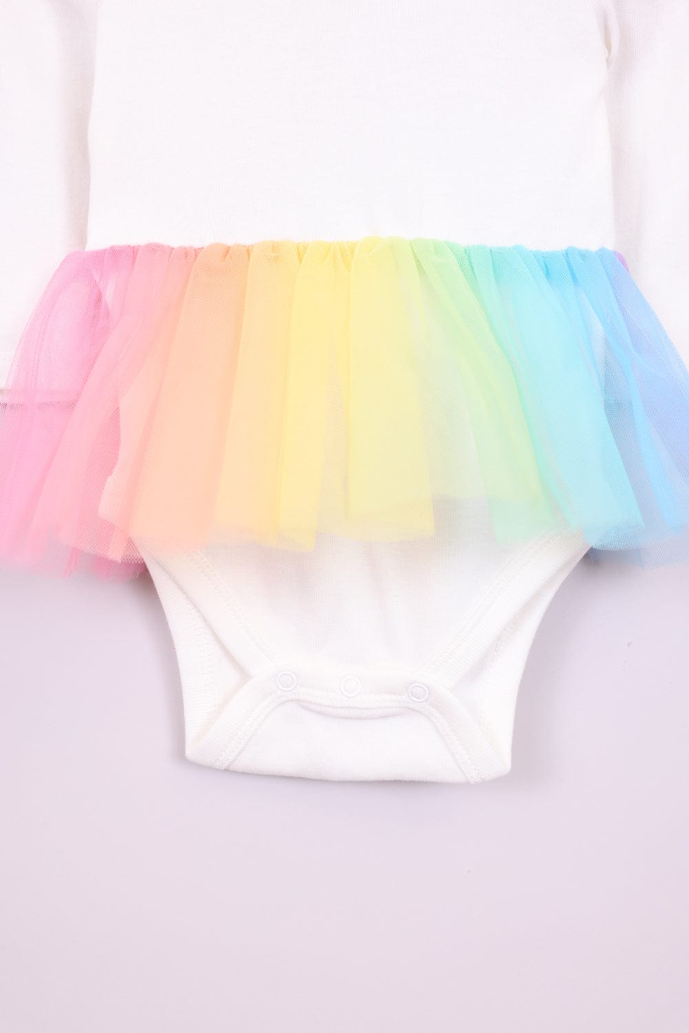 בגד גוף לבן עם חצאית טול צבעונית מובנית וכפתורים בחלק התחתון, טייץ וכובע עם אוזניים.