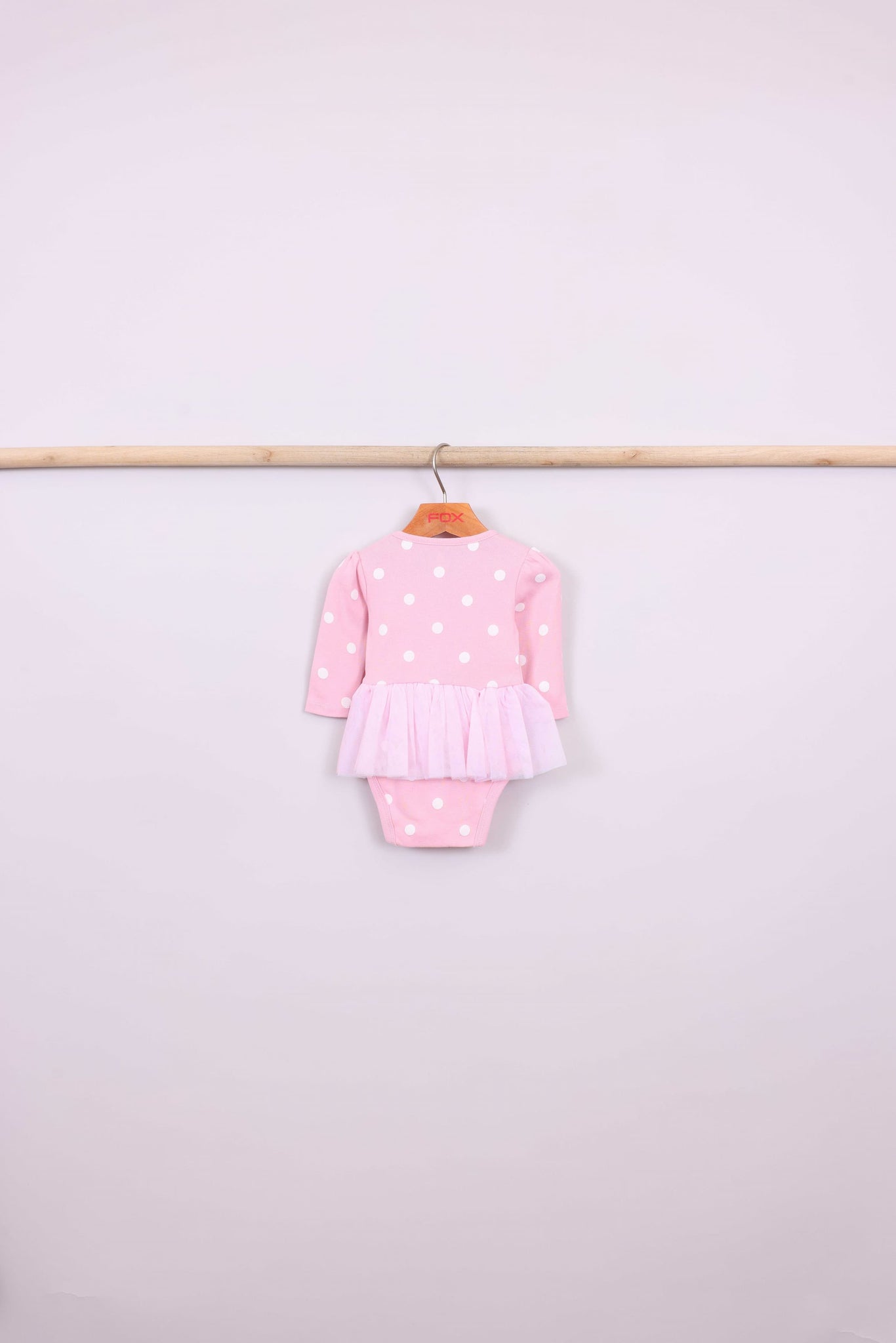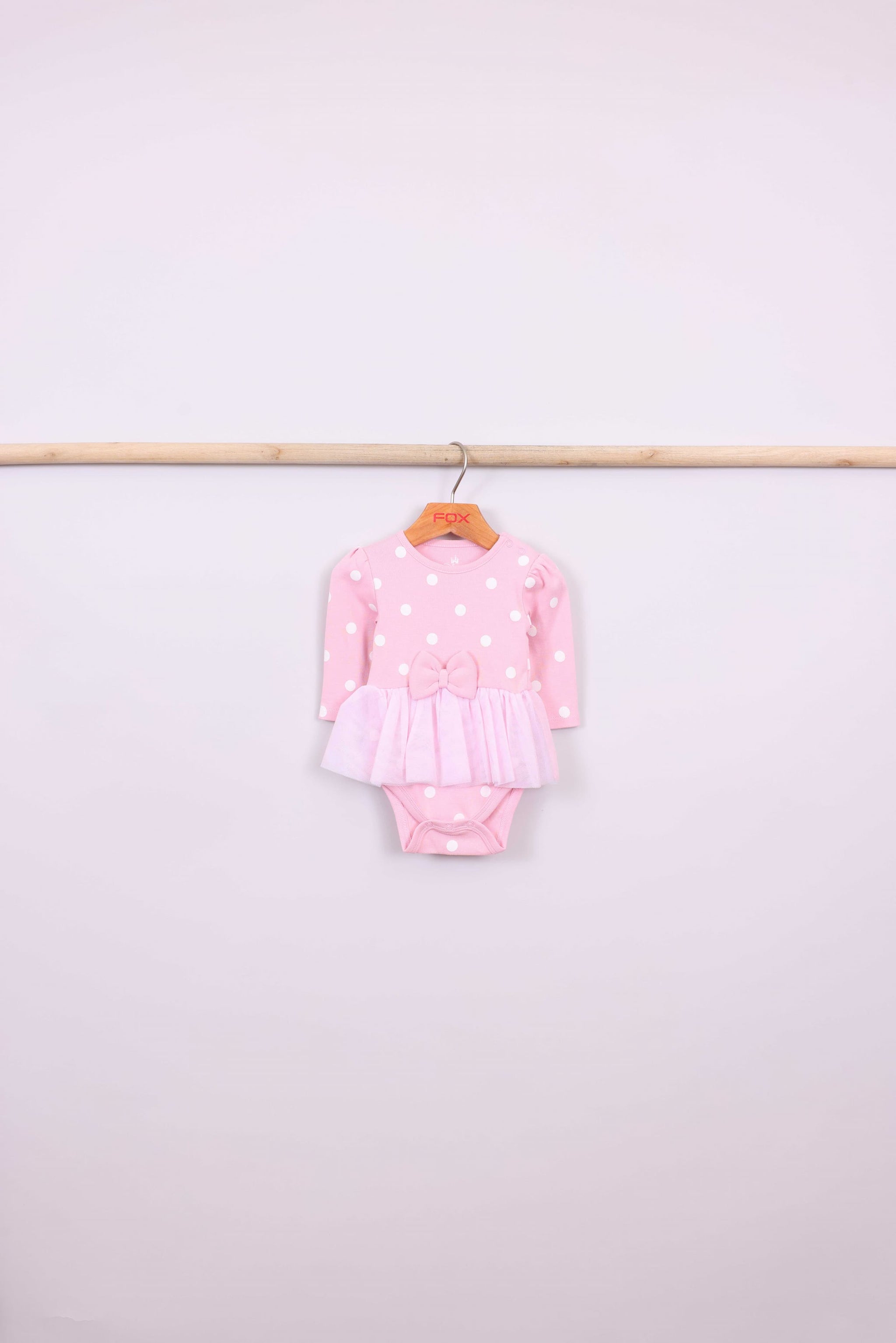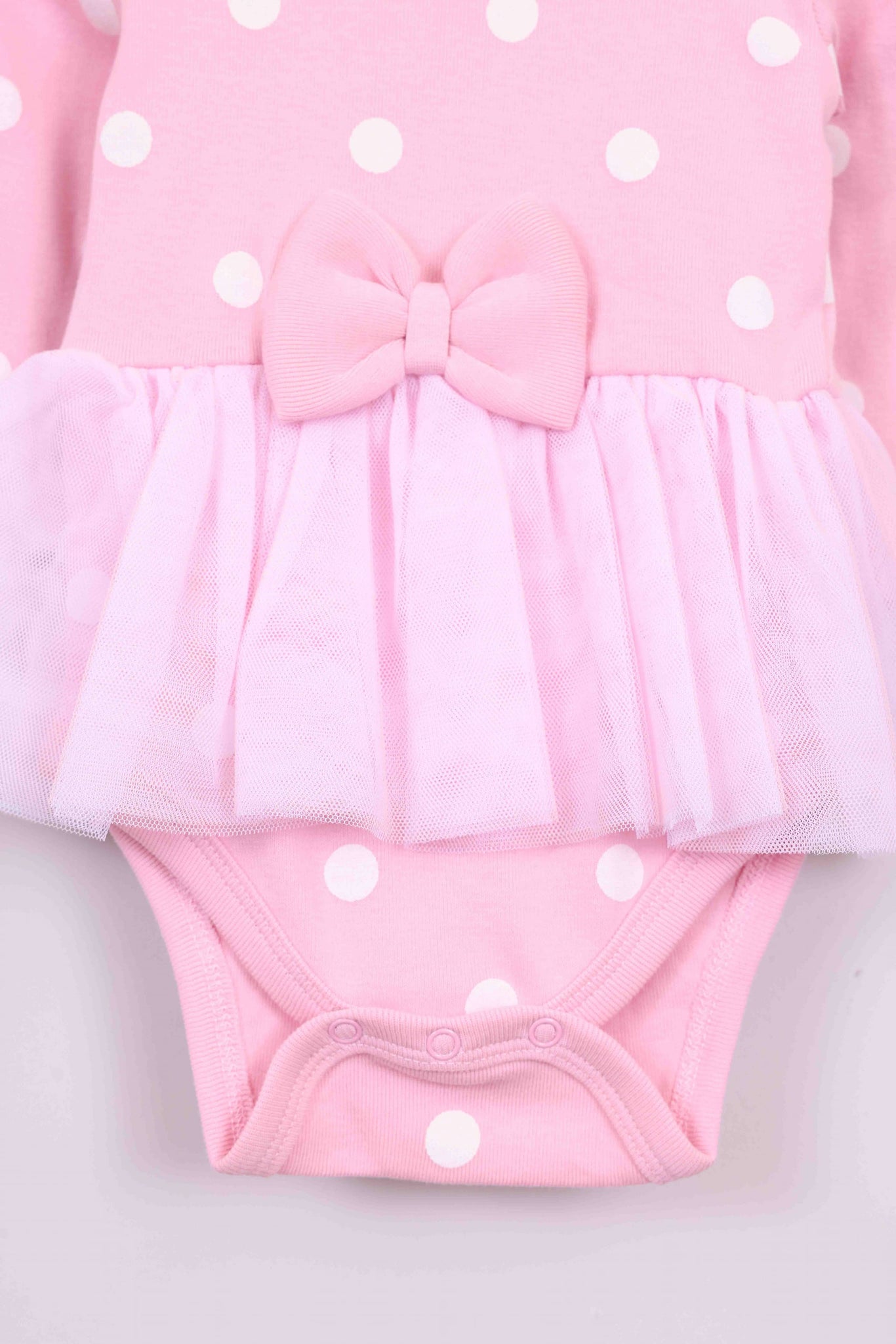 בגד גוף ורוד מנוקד עם חצאית טול מובנית, טייץ ורוד וכובע עם אוזניים ופפיון.
