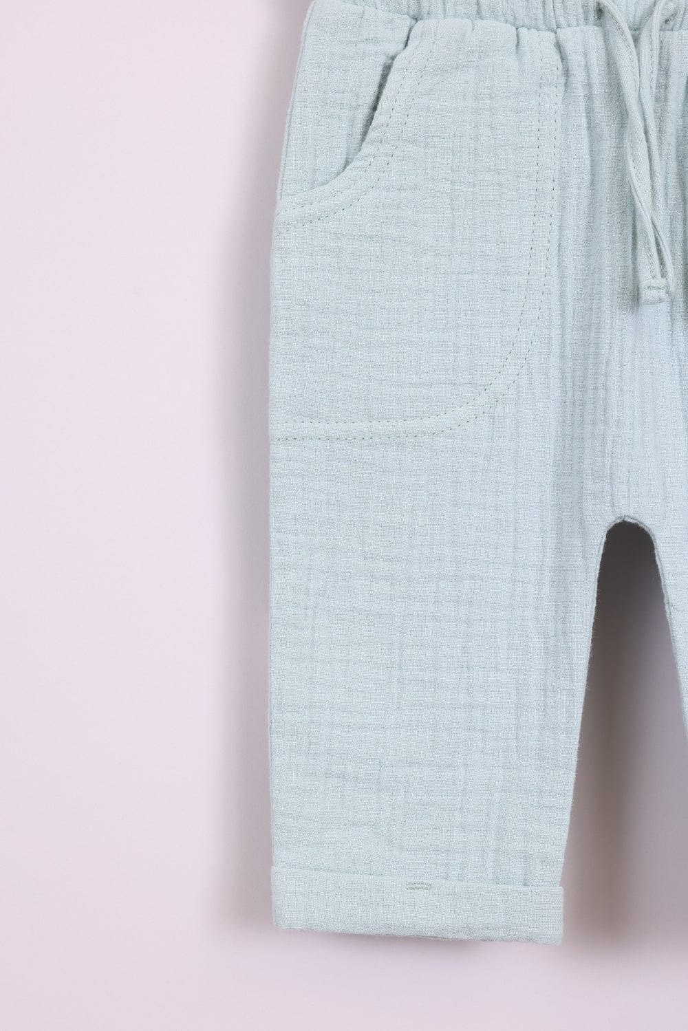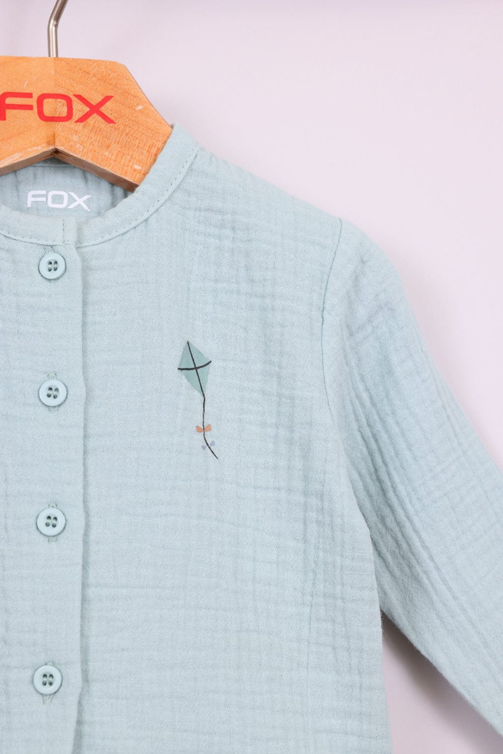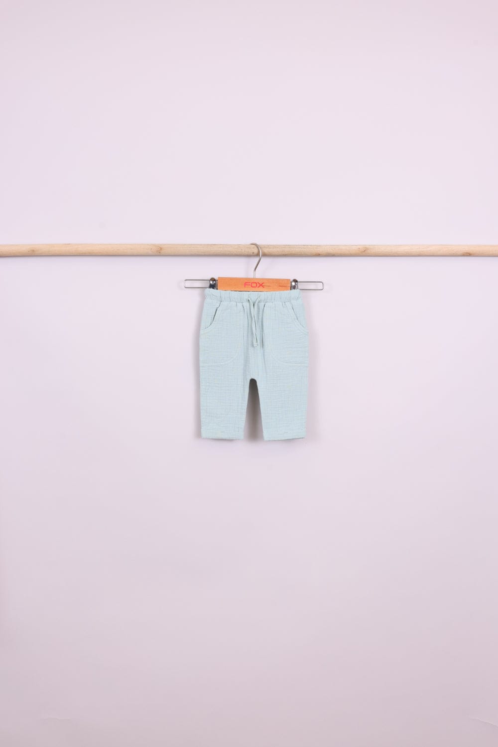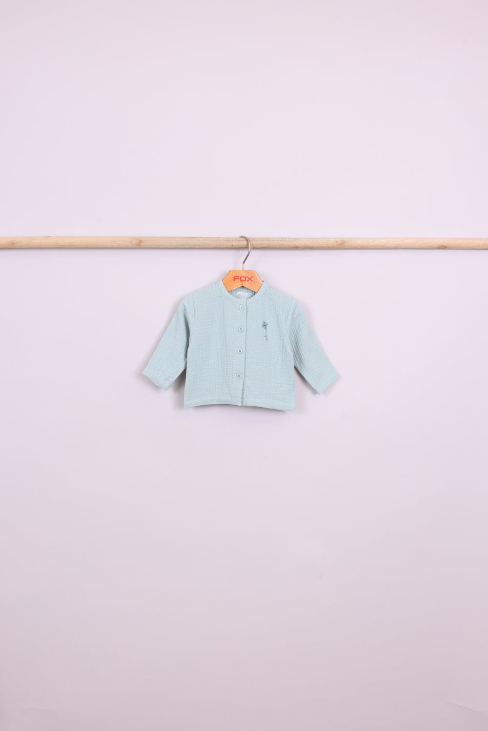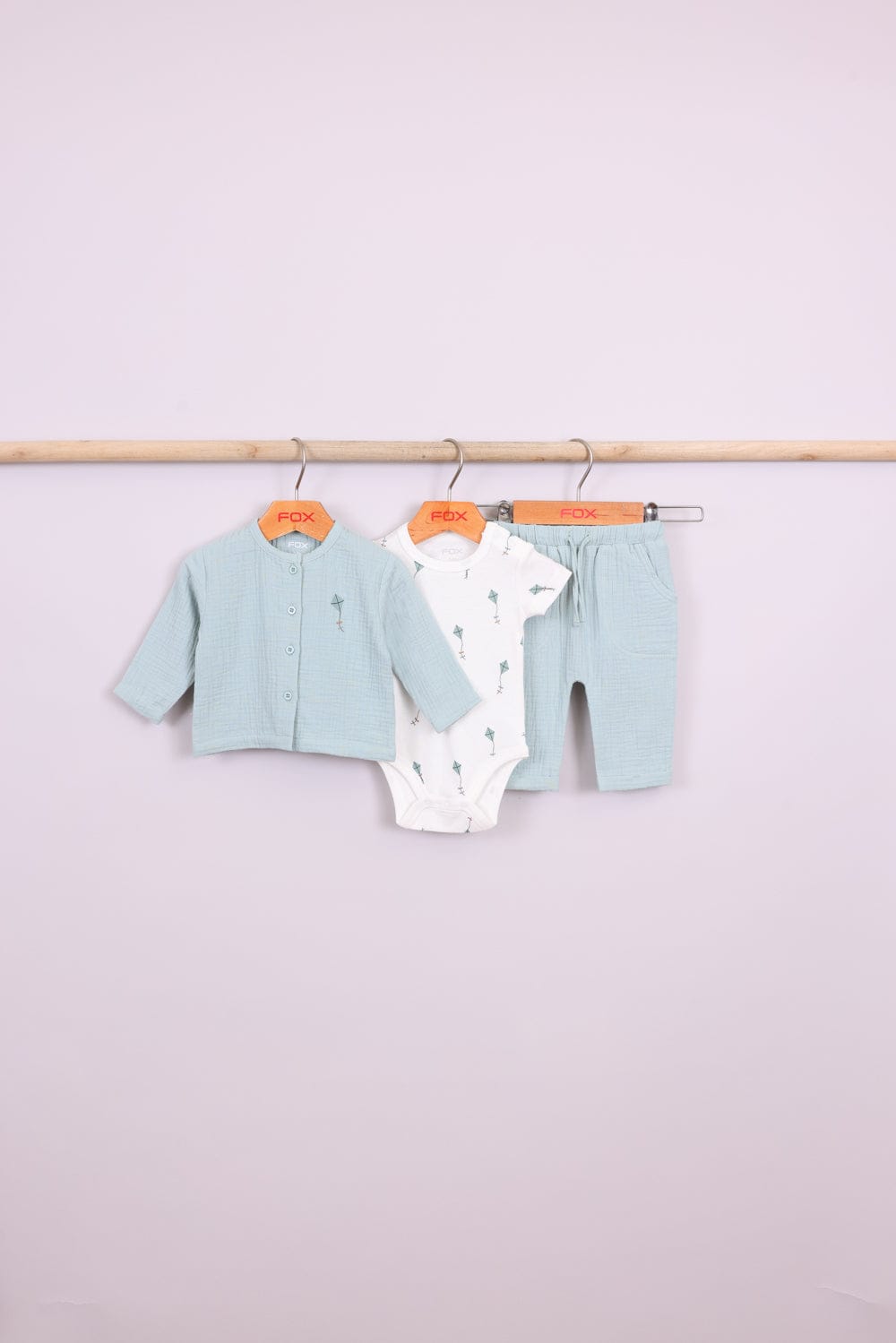 סט ניו בורן 3 חלקים, אוברול קצר עם סגירת כפתורים למטה, מכנס וקרדיגן עם כפתורים.