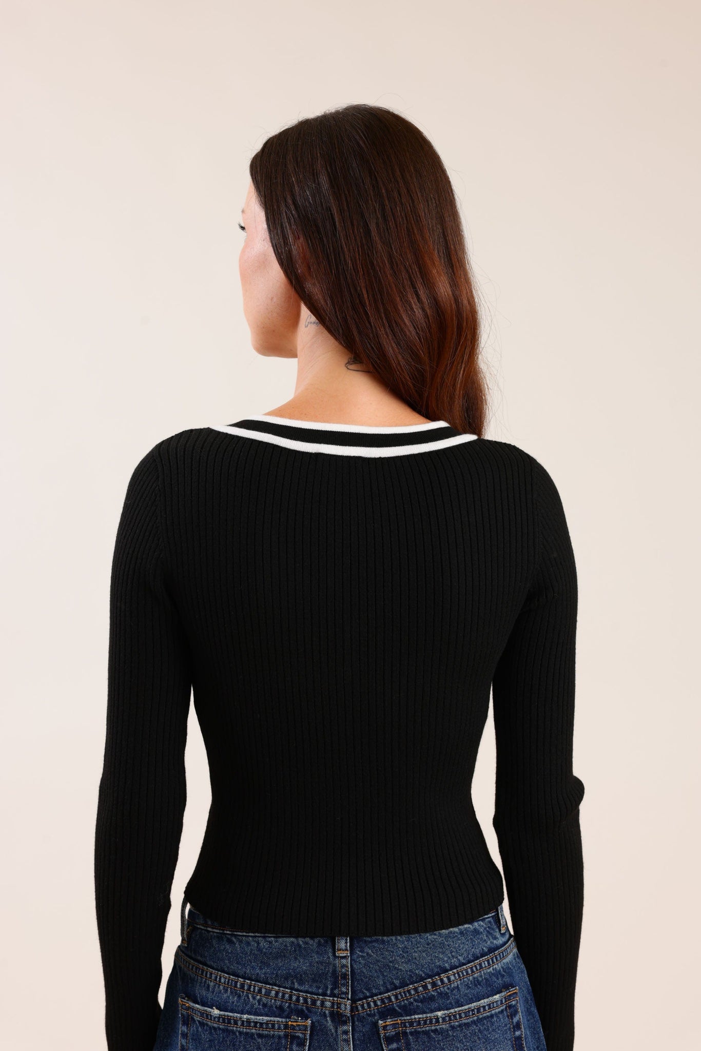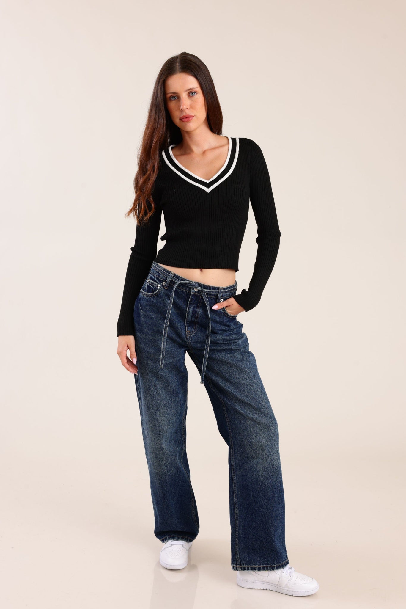 סריג לנשים בגזרה מחמיאה עם מפתח V מעוטר בפס כפול ליצירת מראה ספורטיבי אלגנטי.