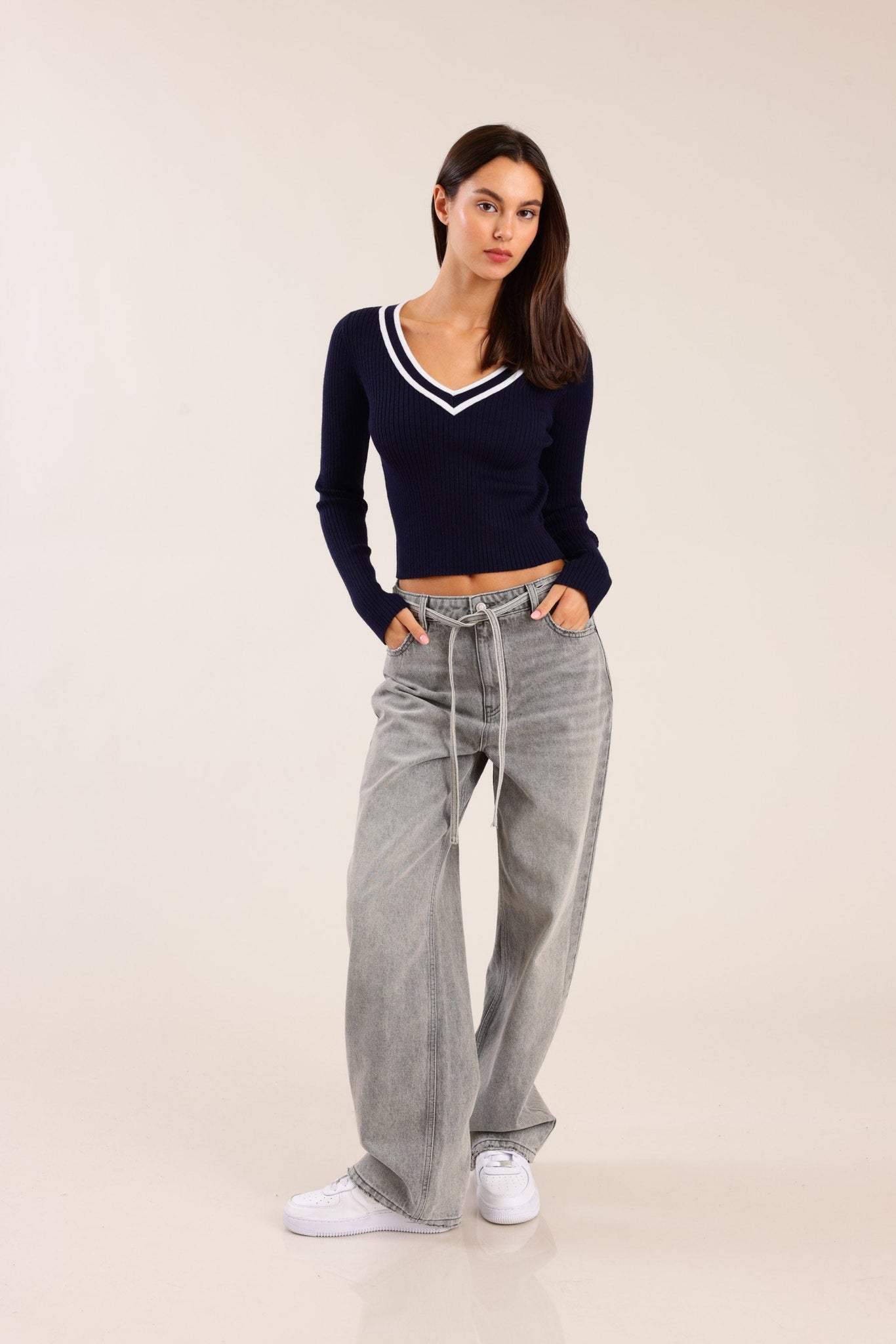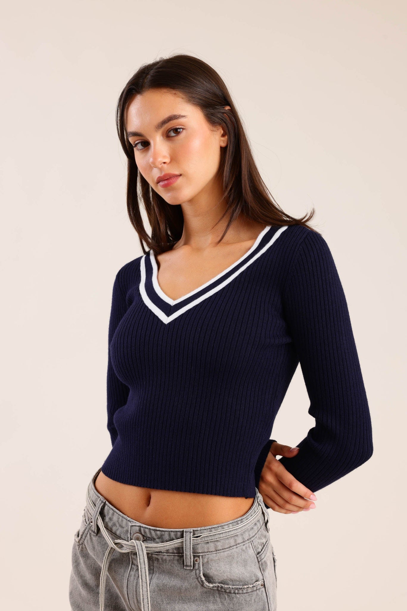 סריג לנשים בגזרה מחמיאה עם מפתח V מעוטר בפס כפול ליצירת מראה ספורטיבי אלגנטי.
