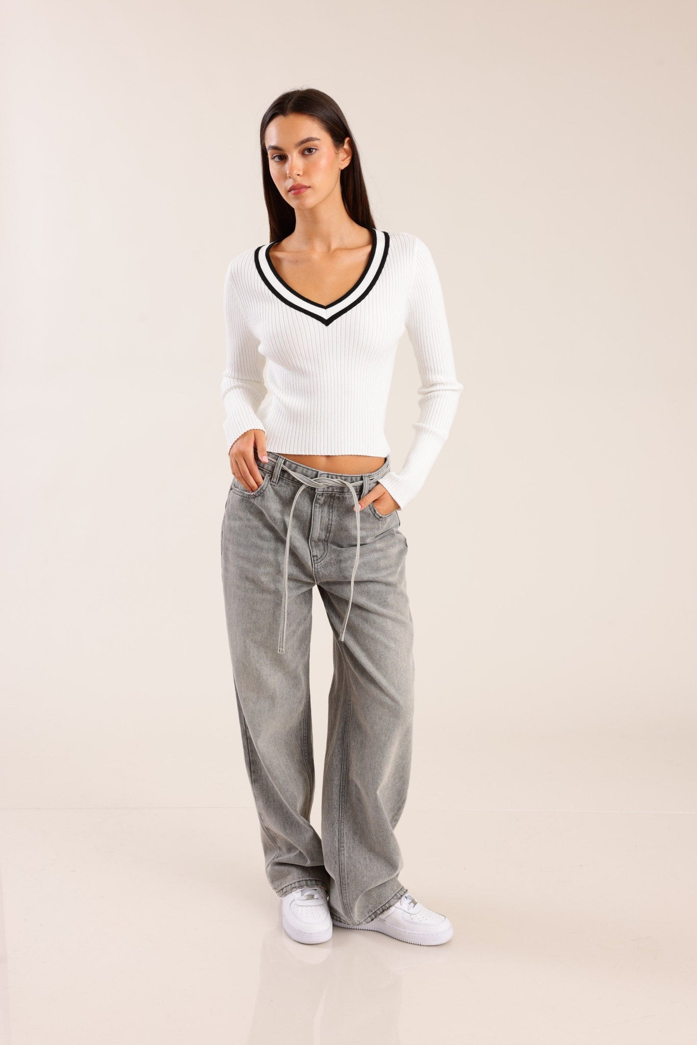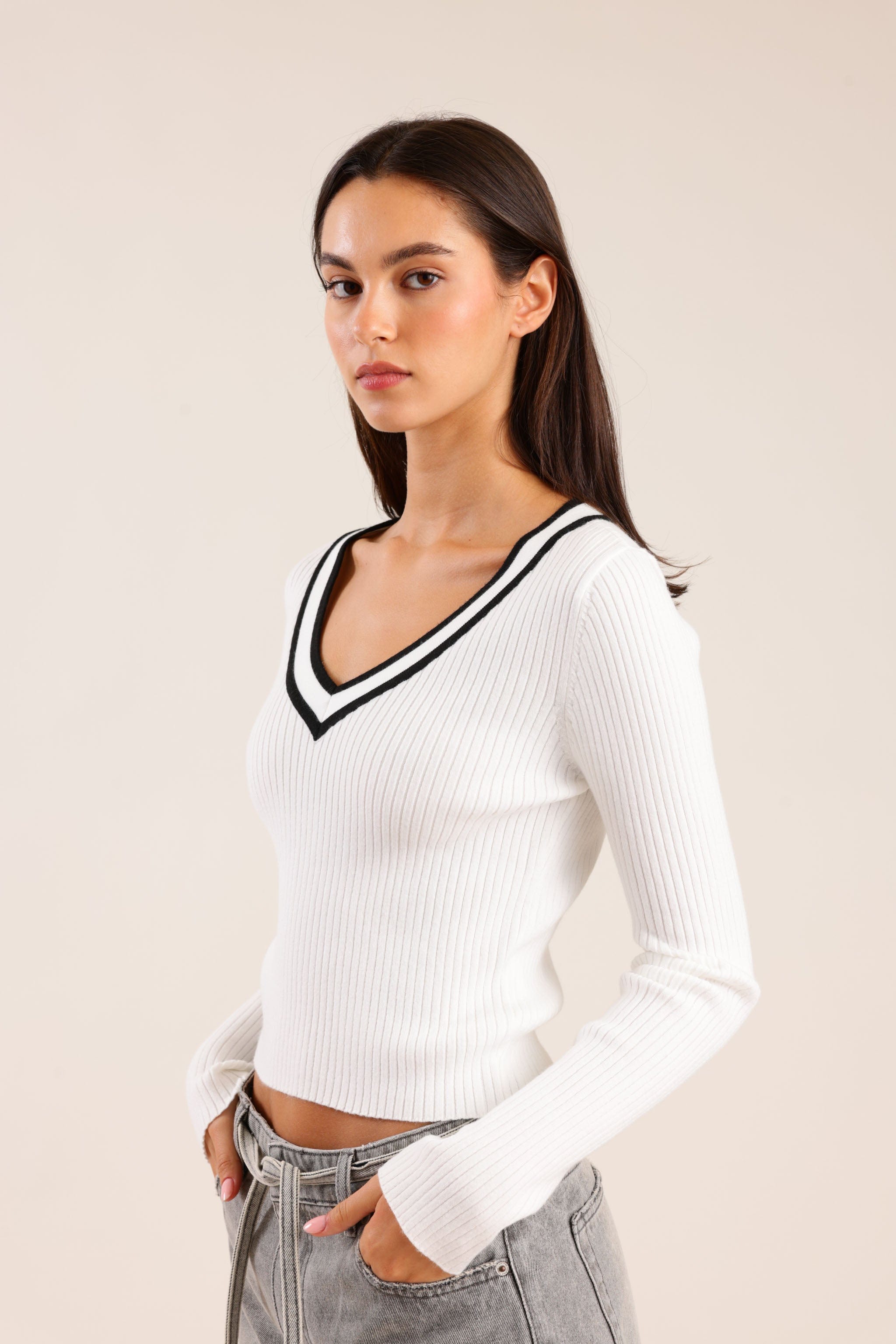 סריג לנשים בגזרה מחמיאה עם מפתח V מעוטר בפס כפול ליצירת מראה ספורטיבי אלגנטי.