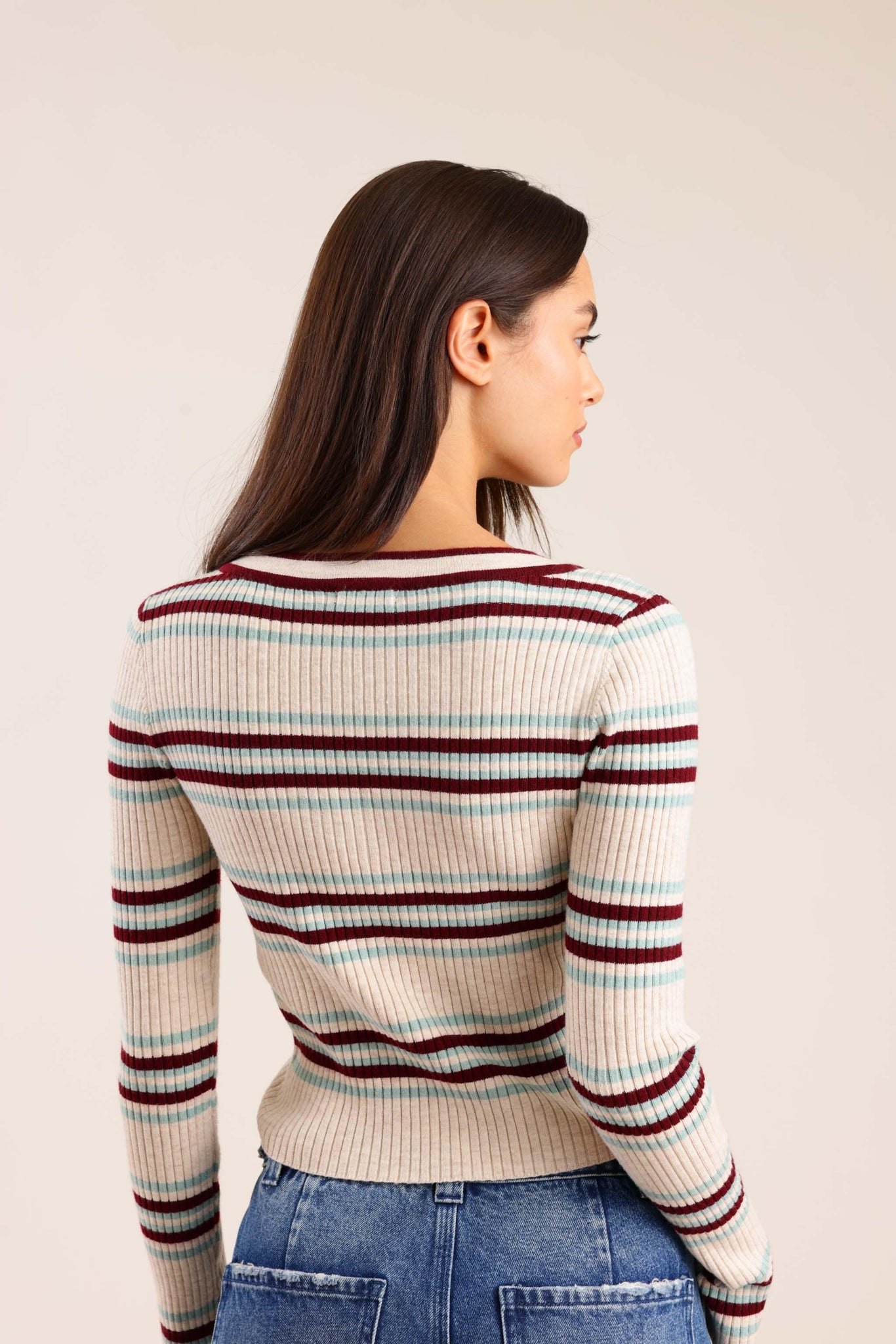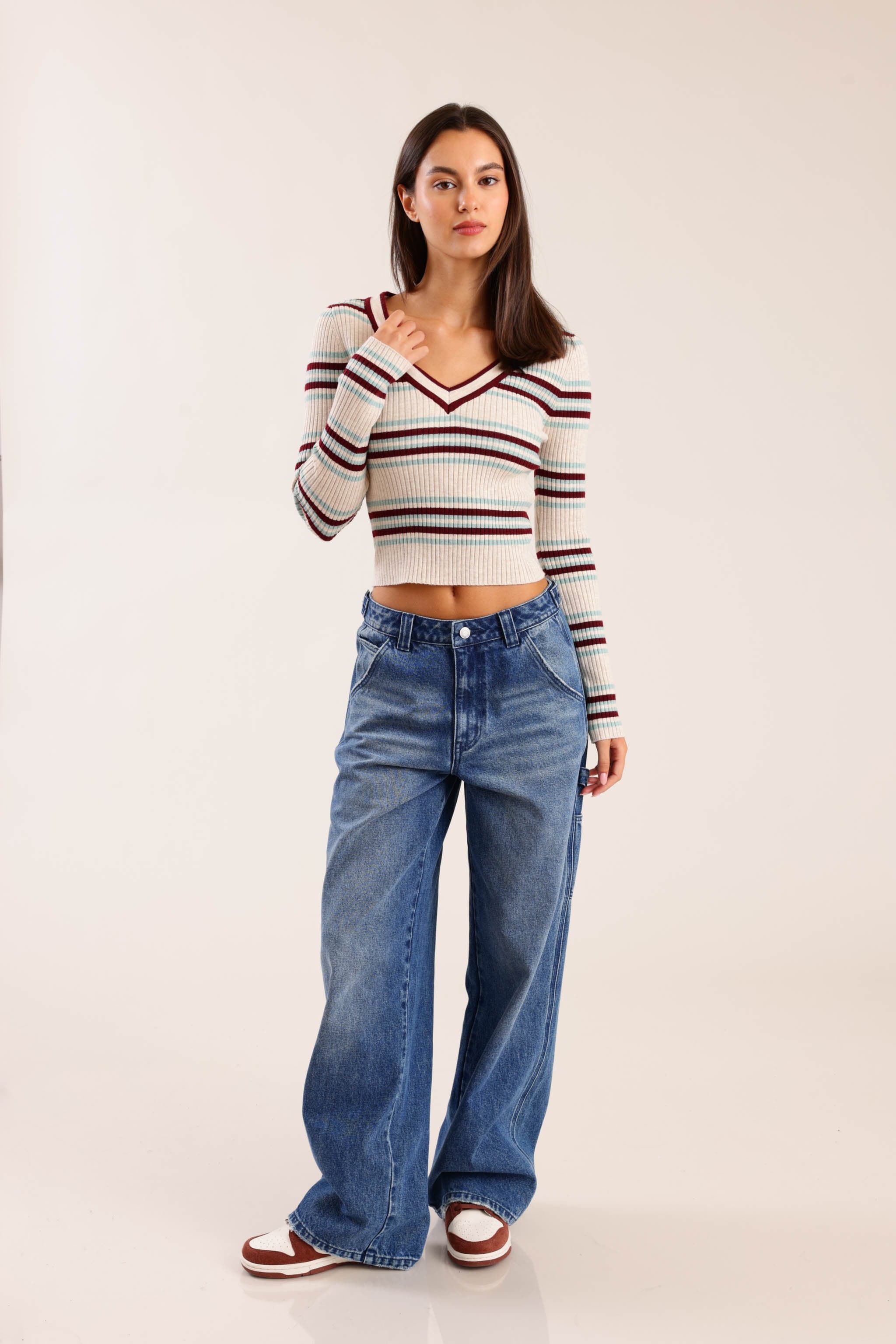 סריג לנשים בגזרת קרופ מחמיאה, עם מפתח V מודגש ועיטור פסים אופנתי.