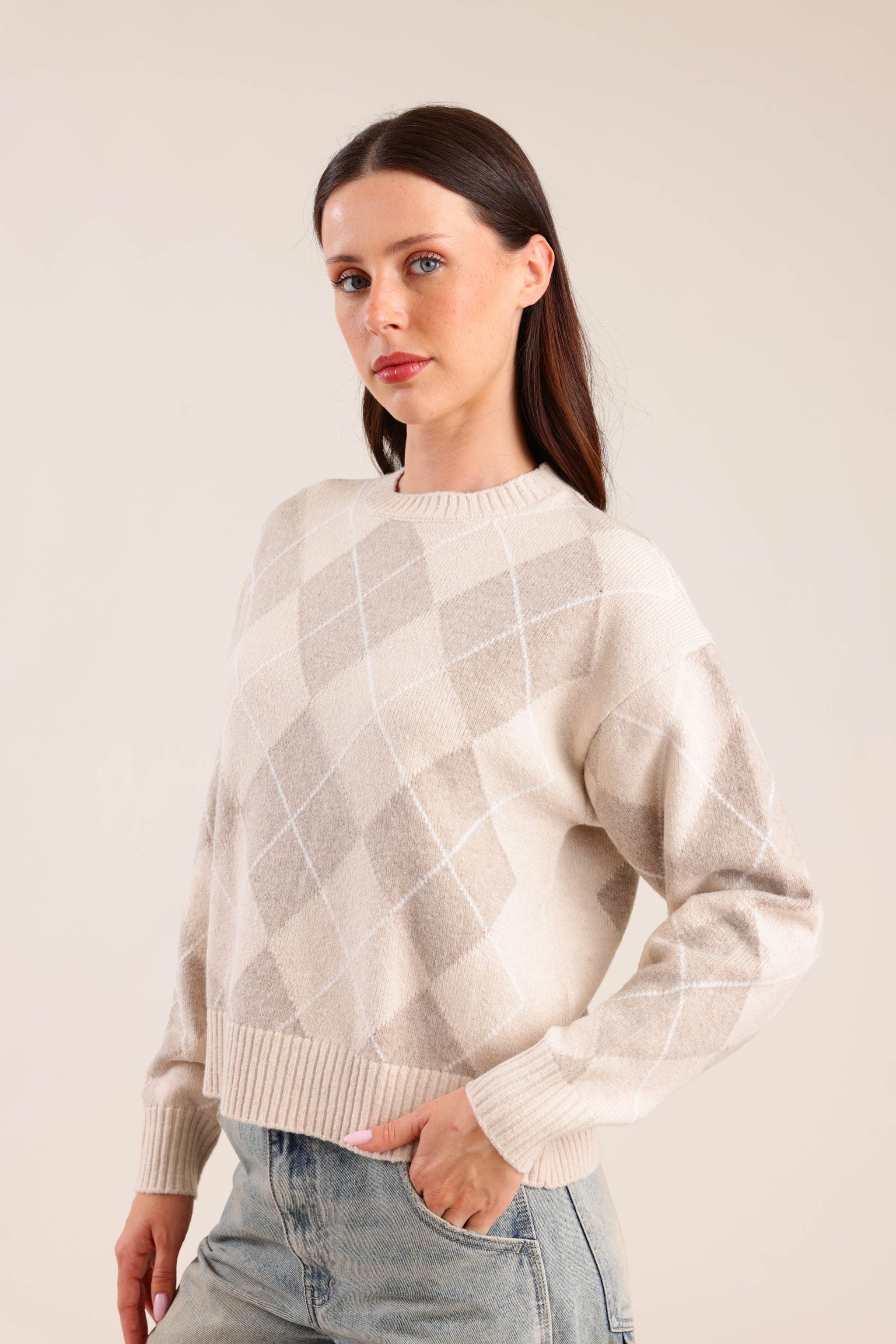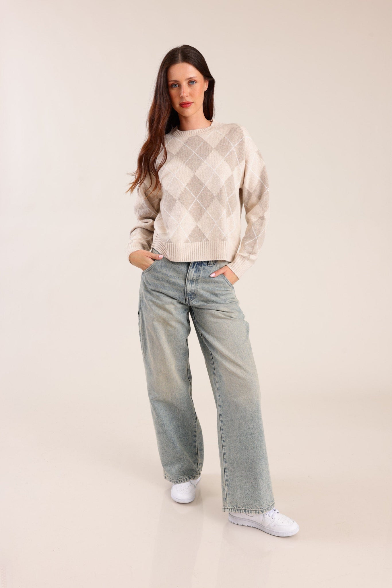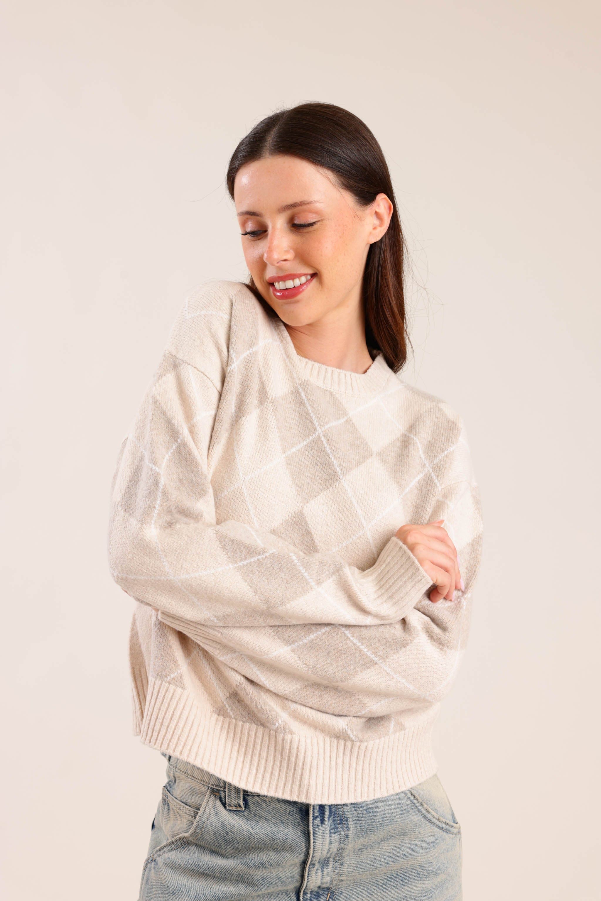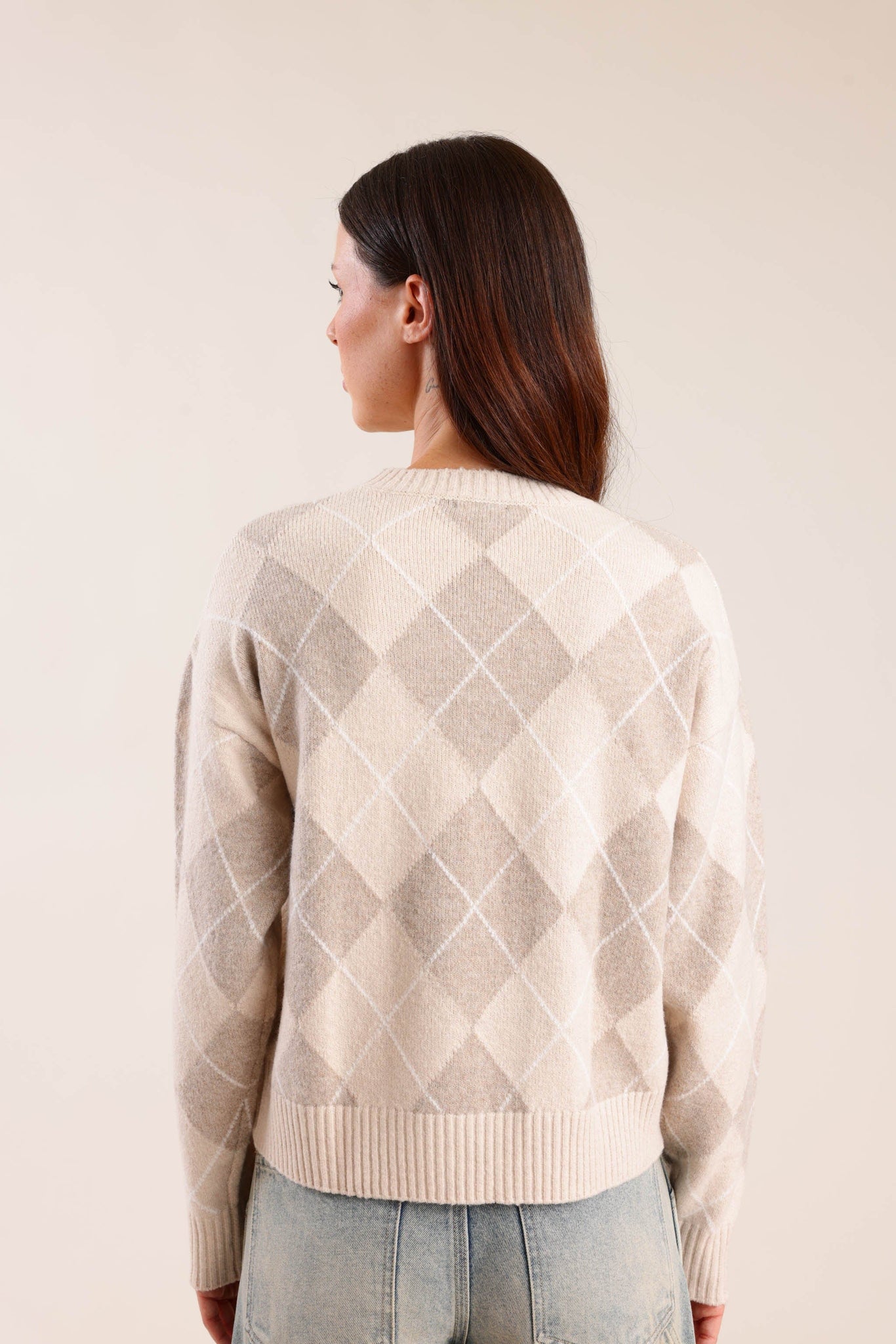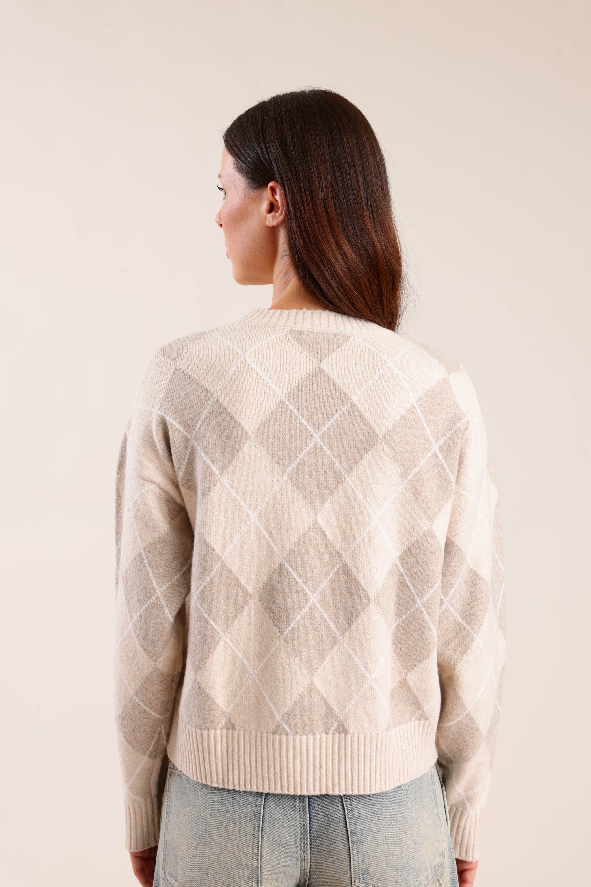 סריג לנשים בדוגמת משבצות יהלום קלאסית, בגזרה רגילה עם צווארון עגול.