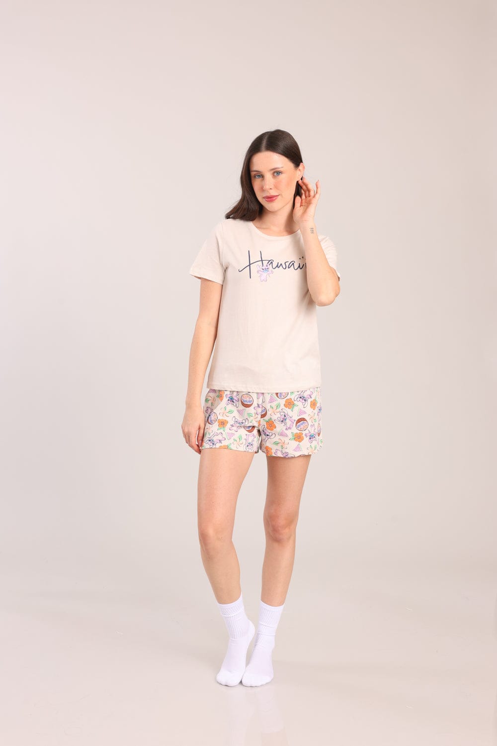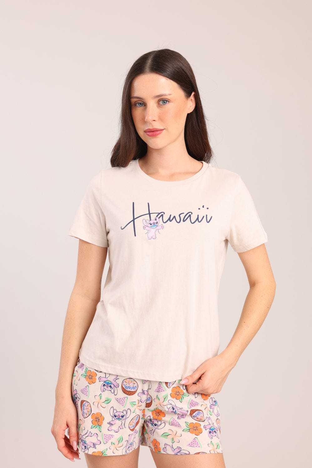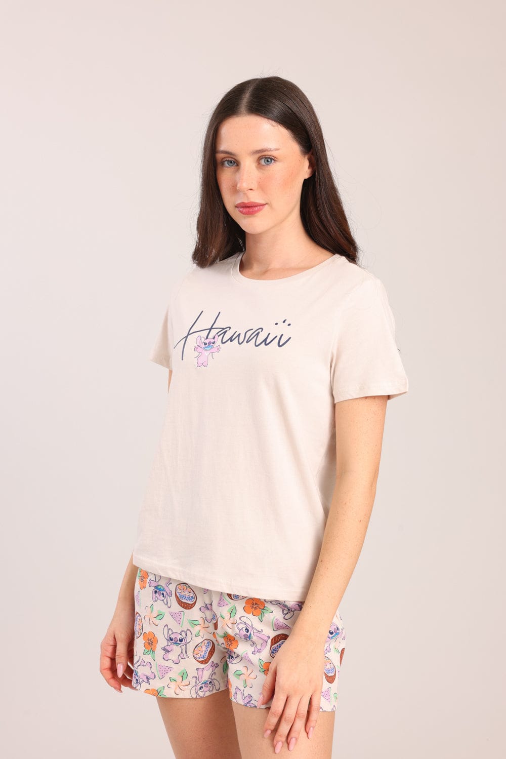פיג'מת נשים 100% כותנה ממותגת סטיץ'. חולצה קצרה עם הדפס קדמי ושורט עם גומי ושרוך במותן עם הדפסים.