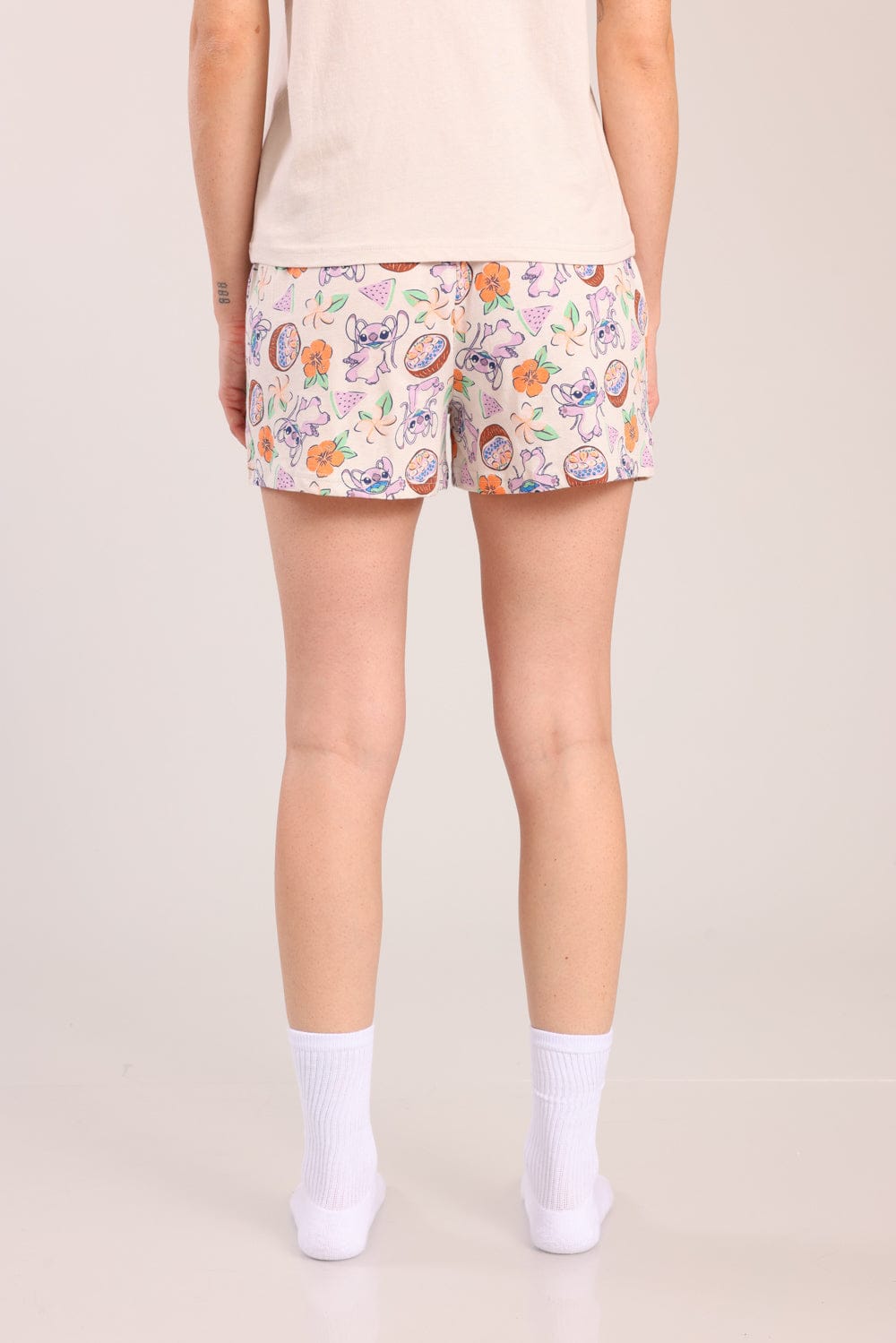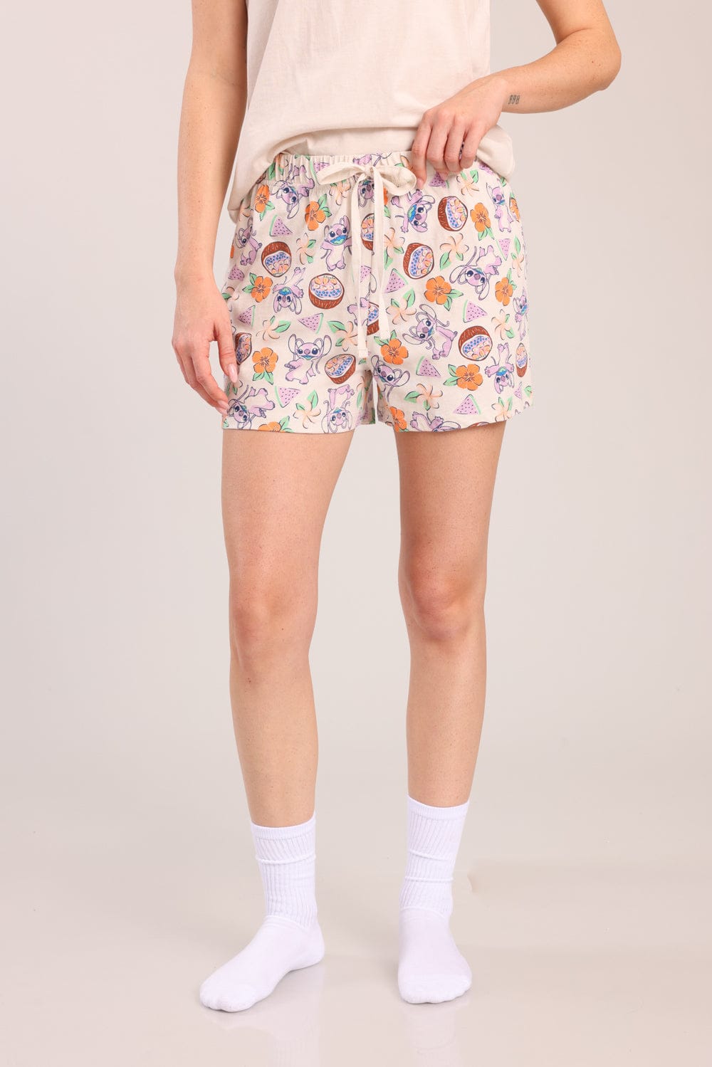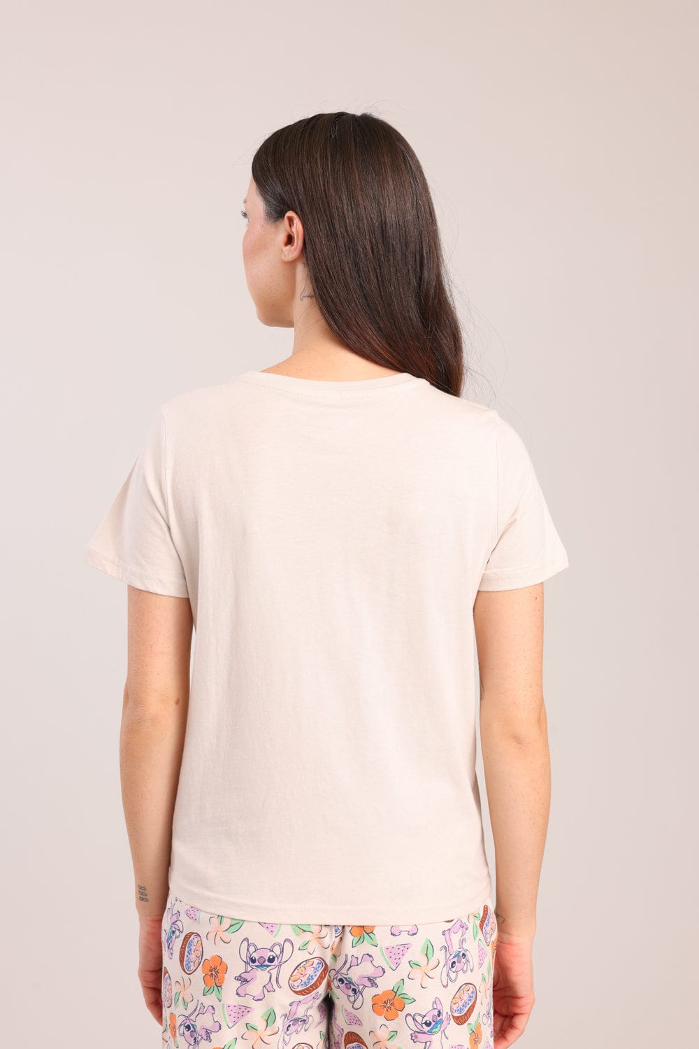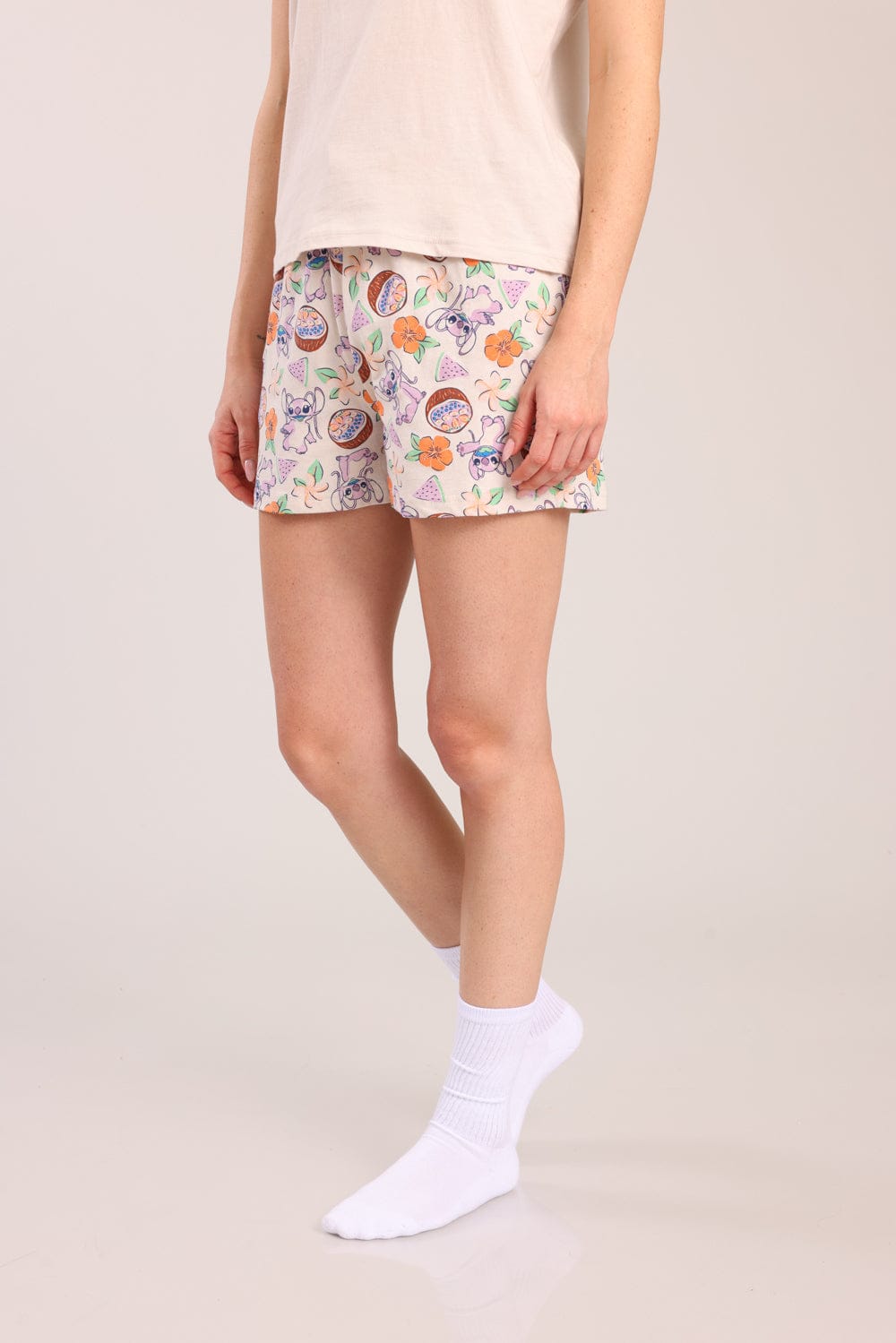 פיג'מת נשים 100% כותנה ממותגת סטיץ'. חולצה קצרה עם הדפס קדמי ושורט עם גומי ושרוך במותן עם הדפסים.