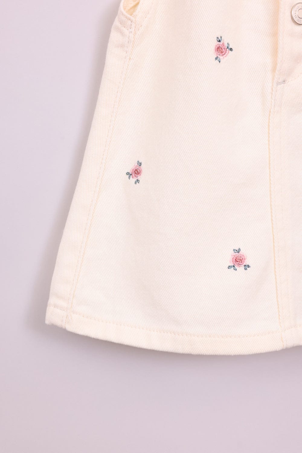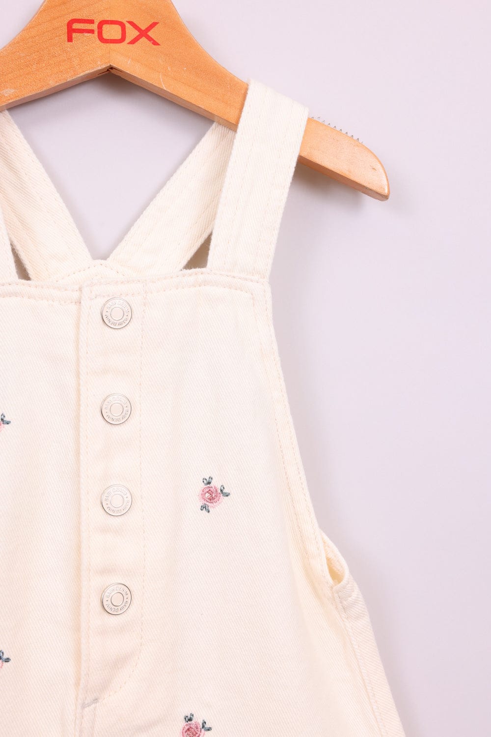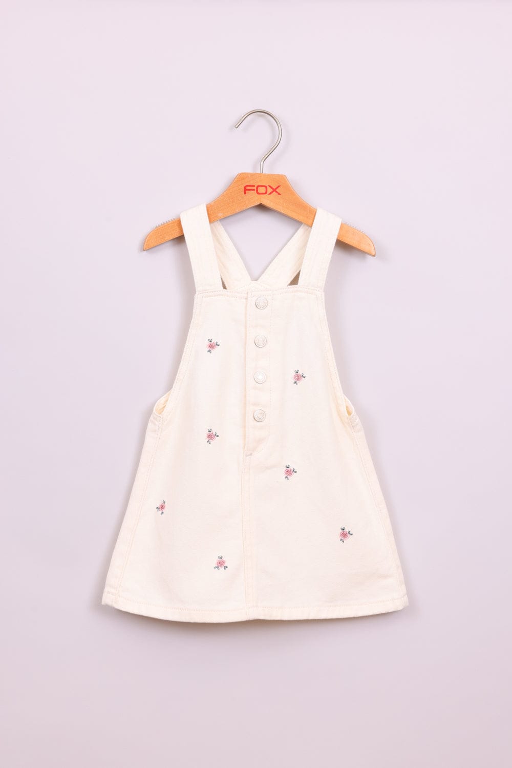 שמלת אוברול פרחונית, עם כפתורים בחלק הקדמי.