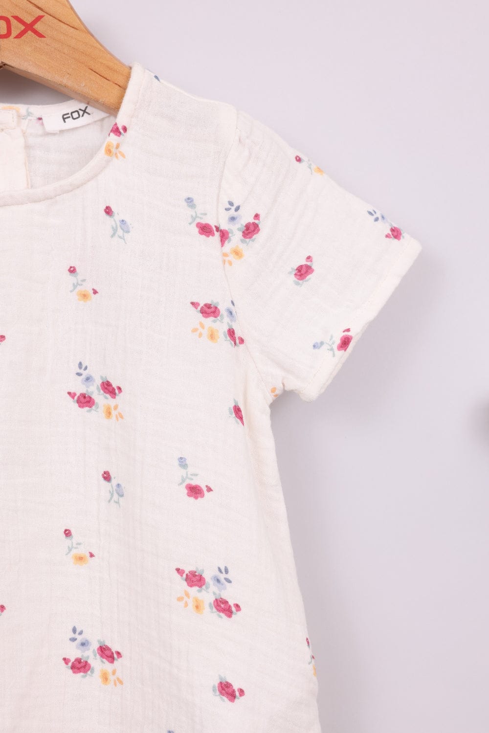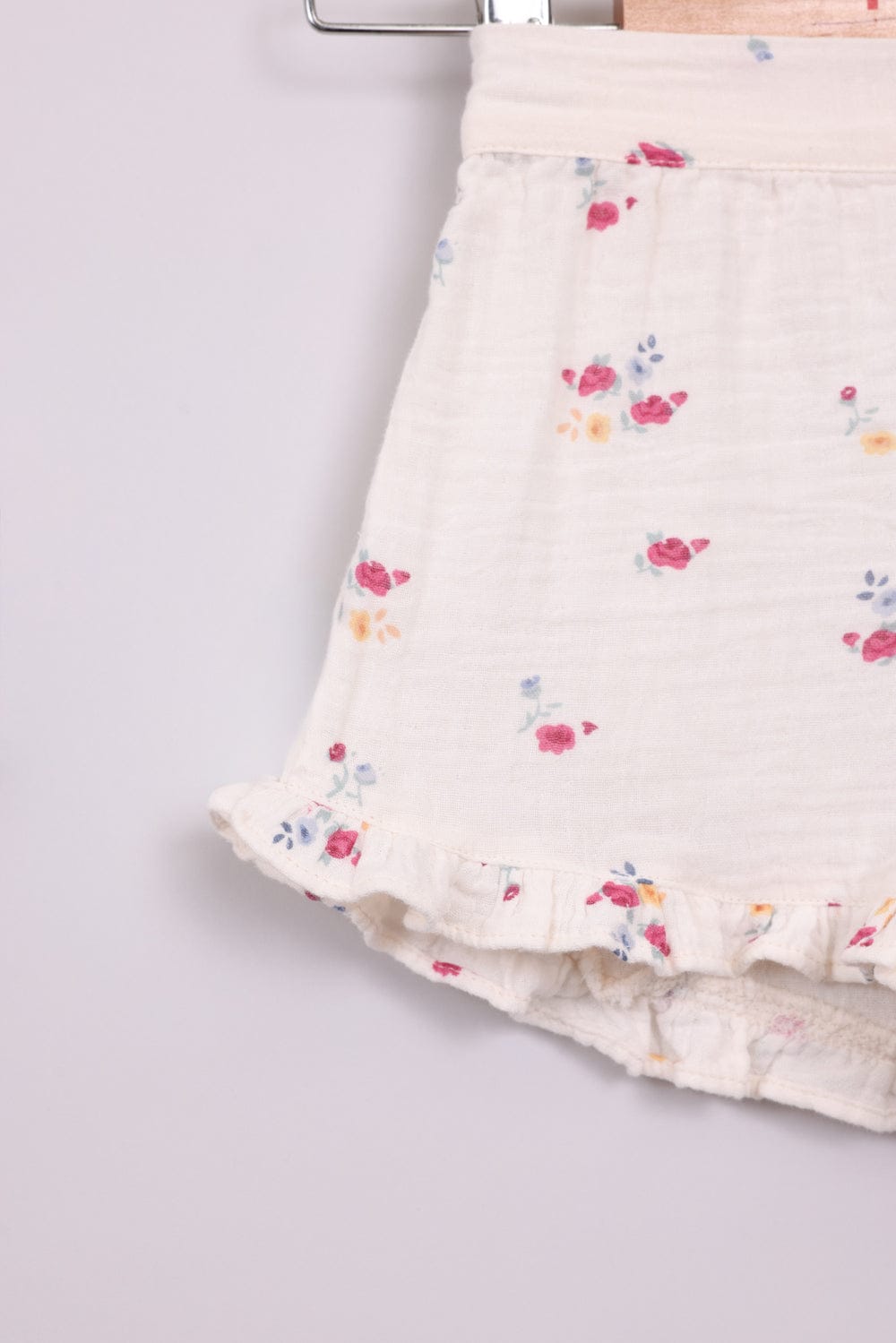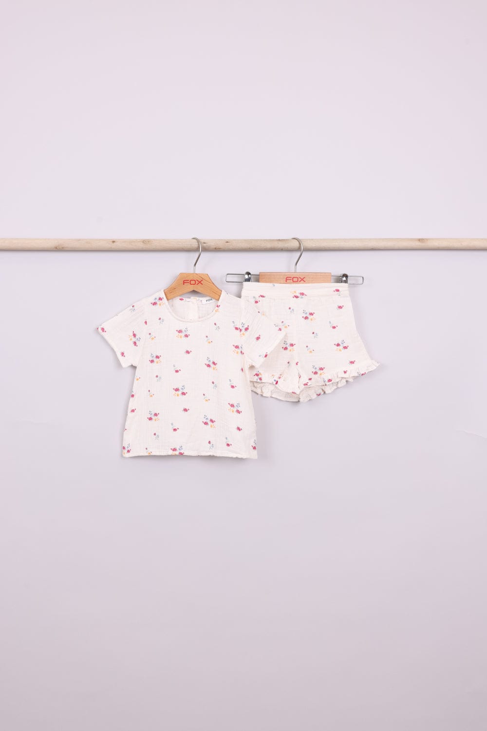 סט חולצה ומכנסיים פרחוניים, חולצה קצרה עם כפתורים בחלק האחורי ושורט עם גימור מלמלה.