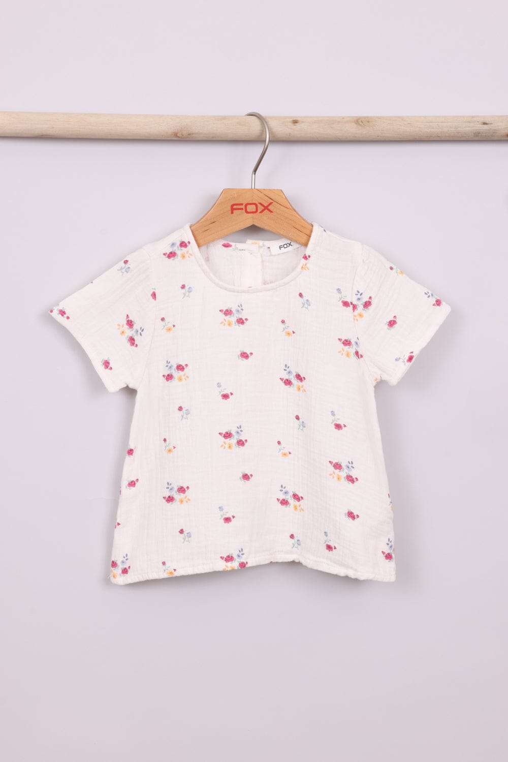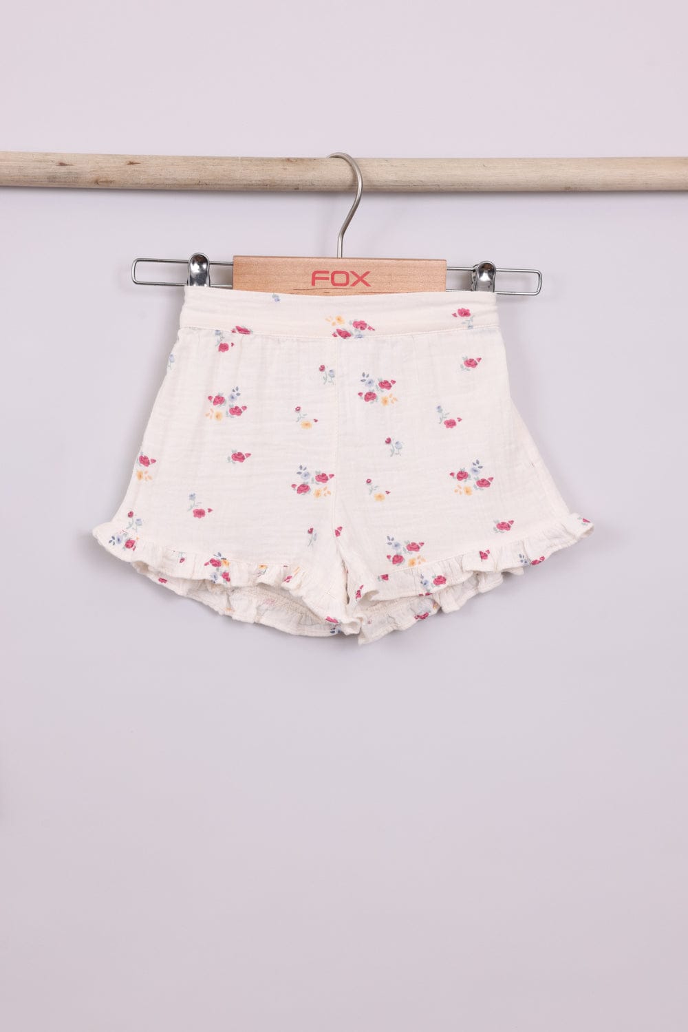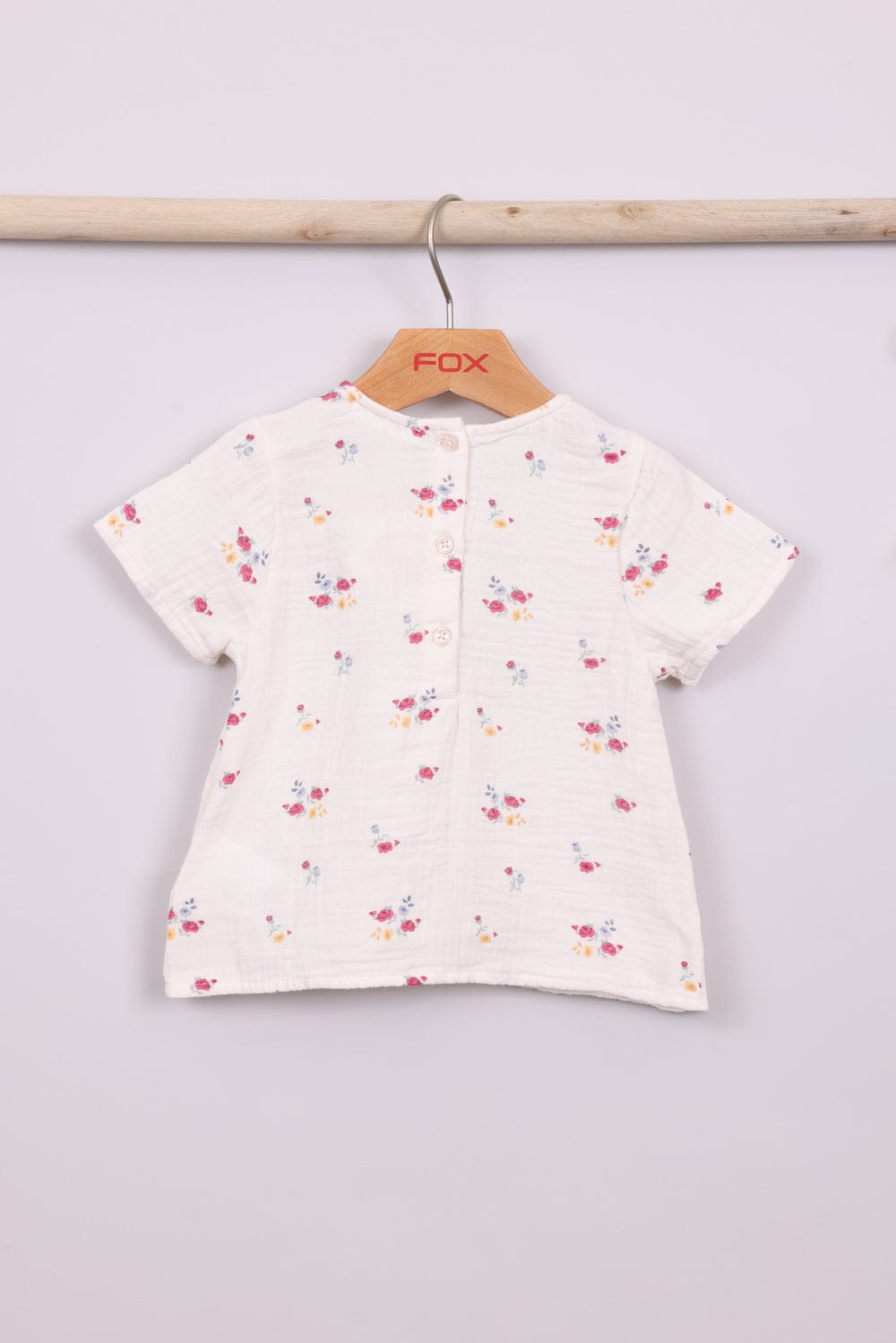 סט חולצה ומכנסיים פרחוניים, חולצה קצרה עם כפתורים בחלק האחורי ושורט עם גימור מלמלה.