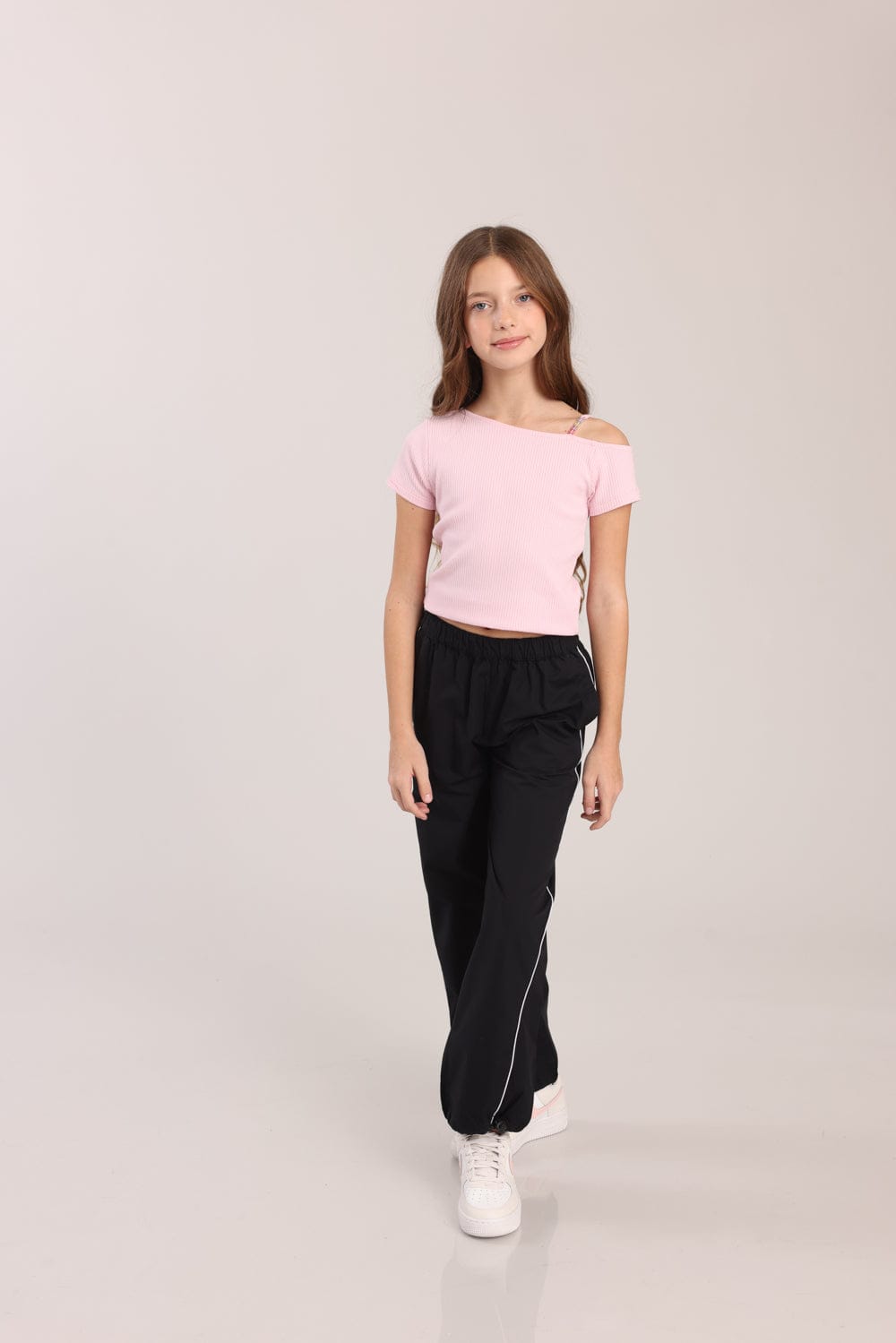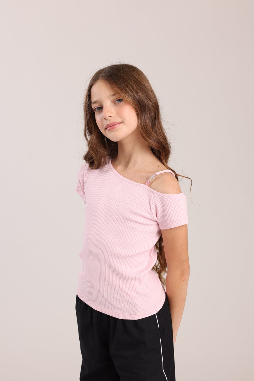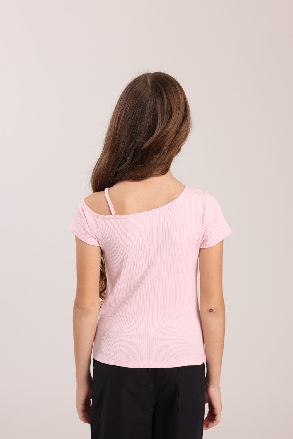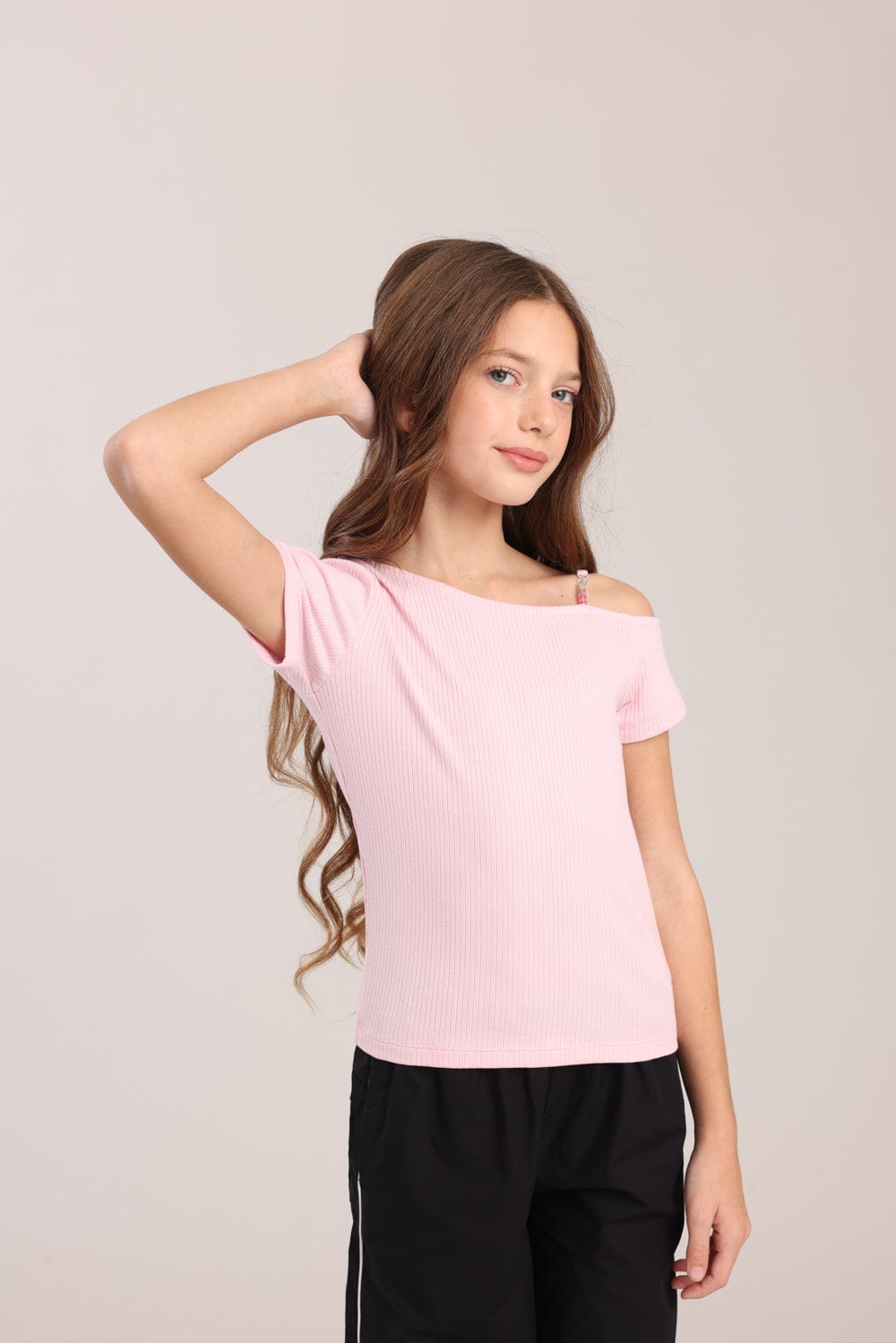 חולצה עם שרוול קצר וכתפיה אחת עם חרוזים צבעוניים.