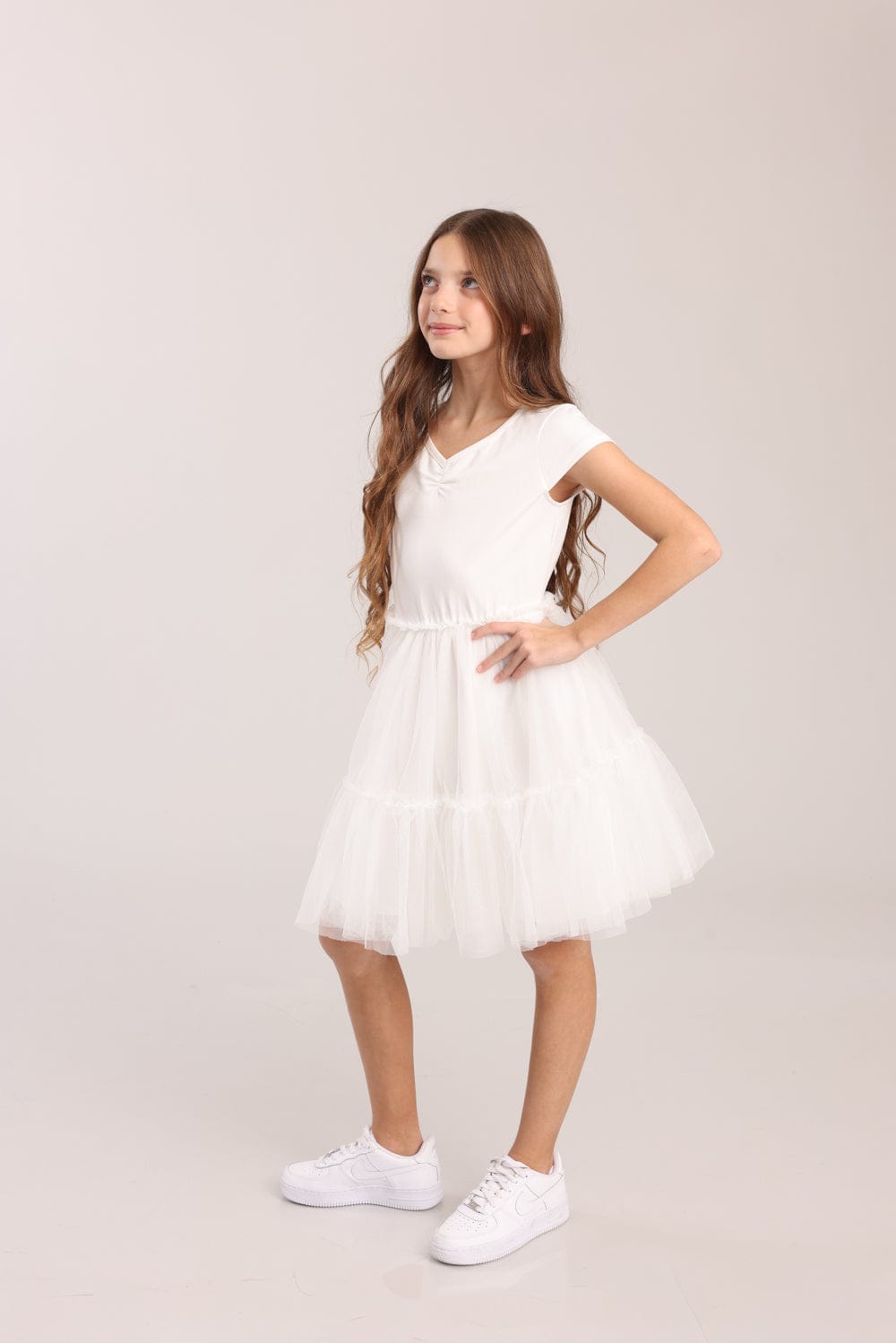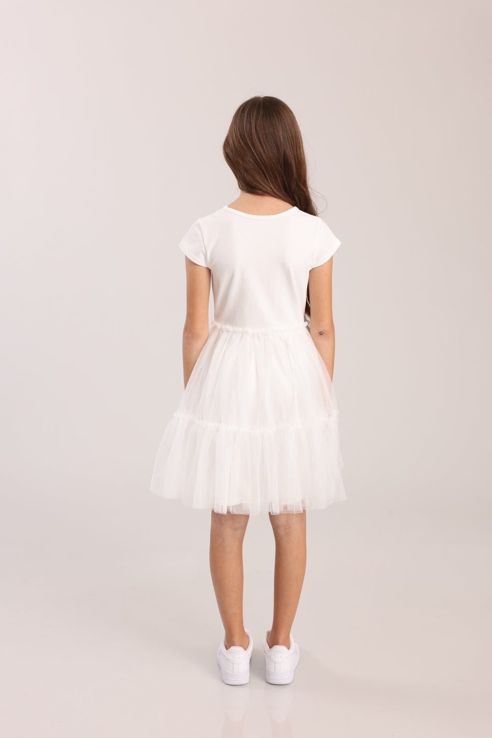 שמלה חגיגית עם שרוול קצר , טול בחלק התחתון.