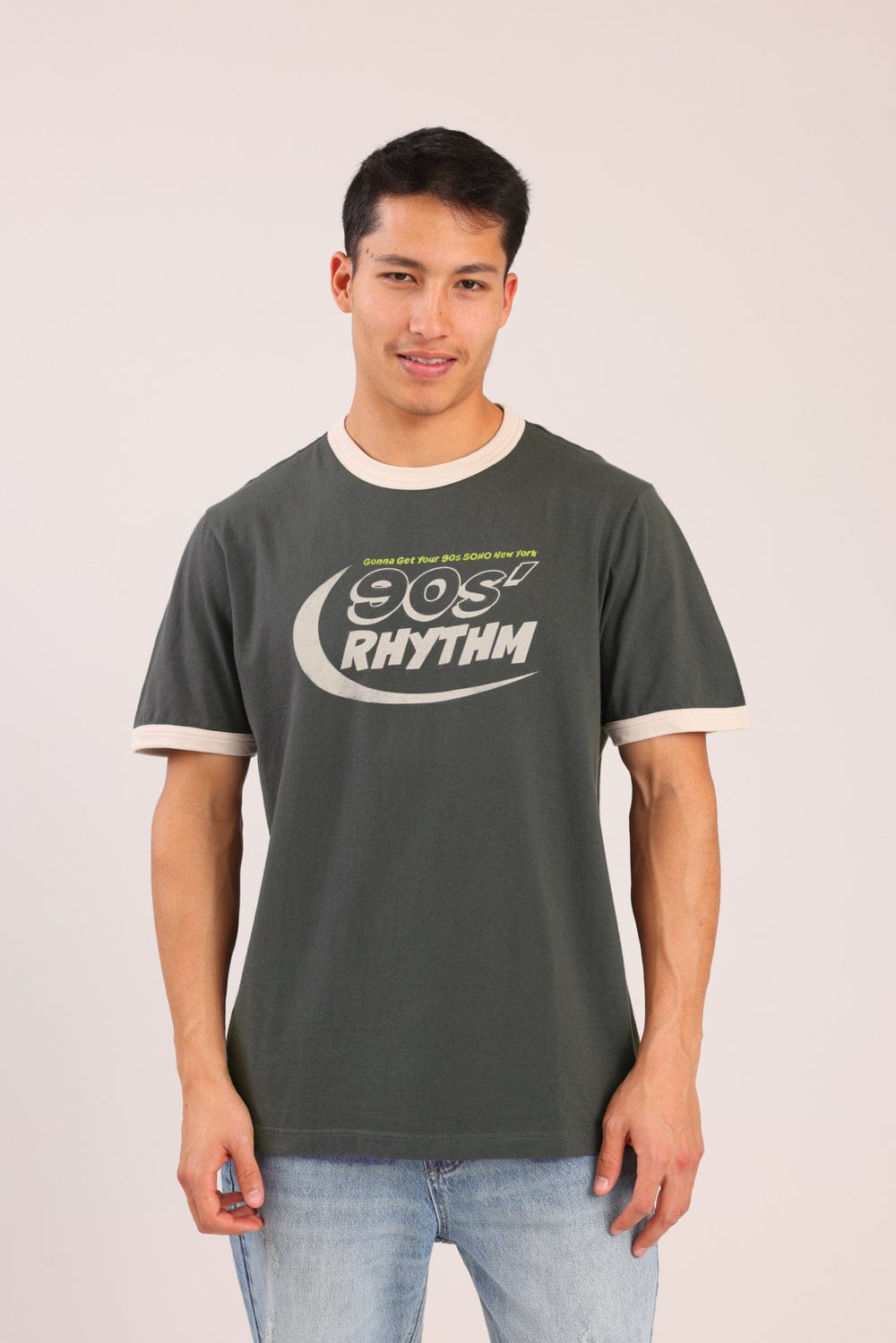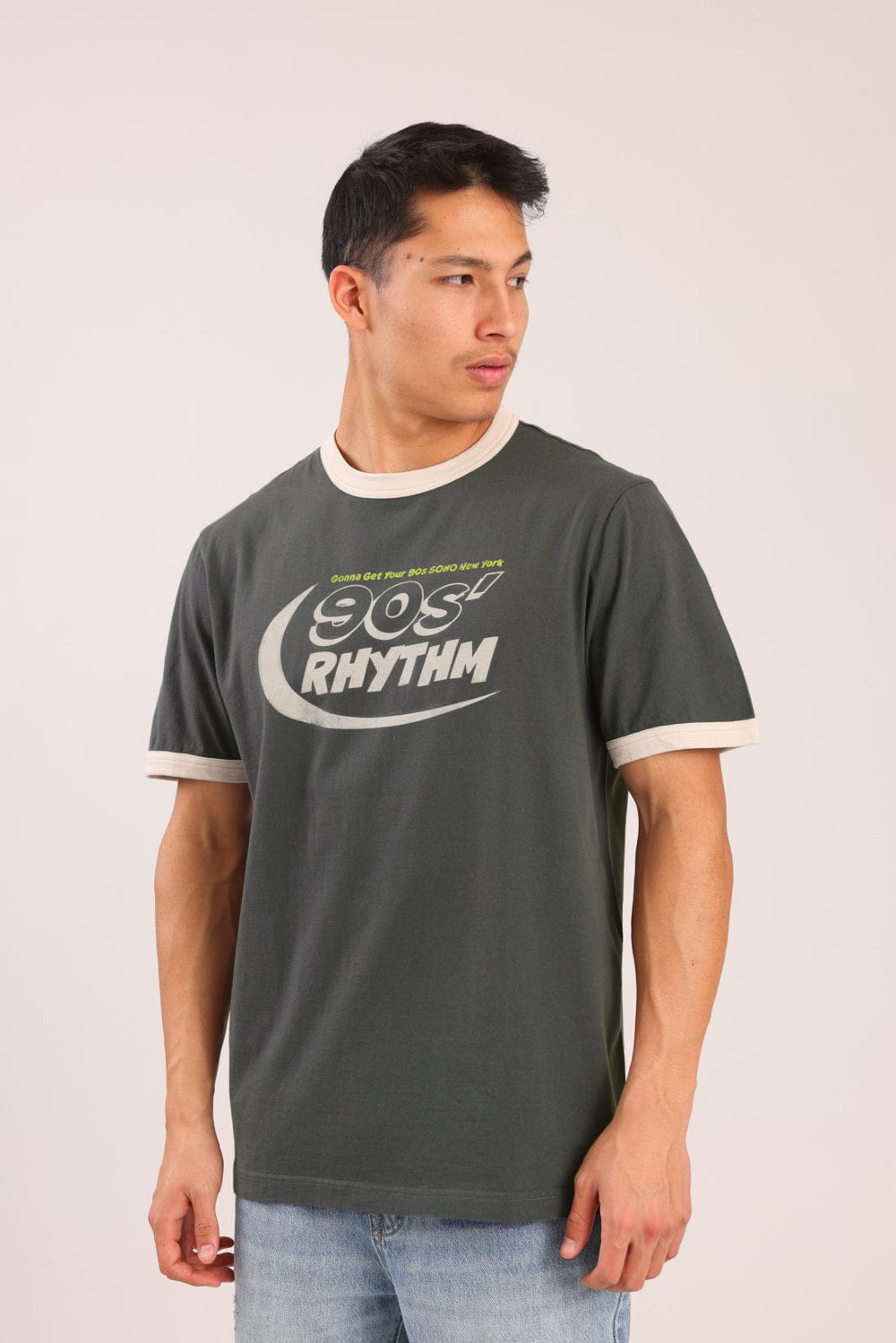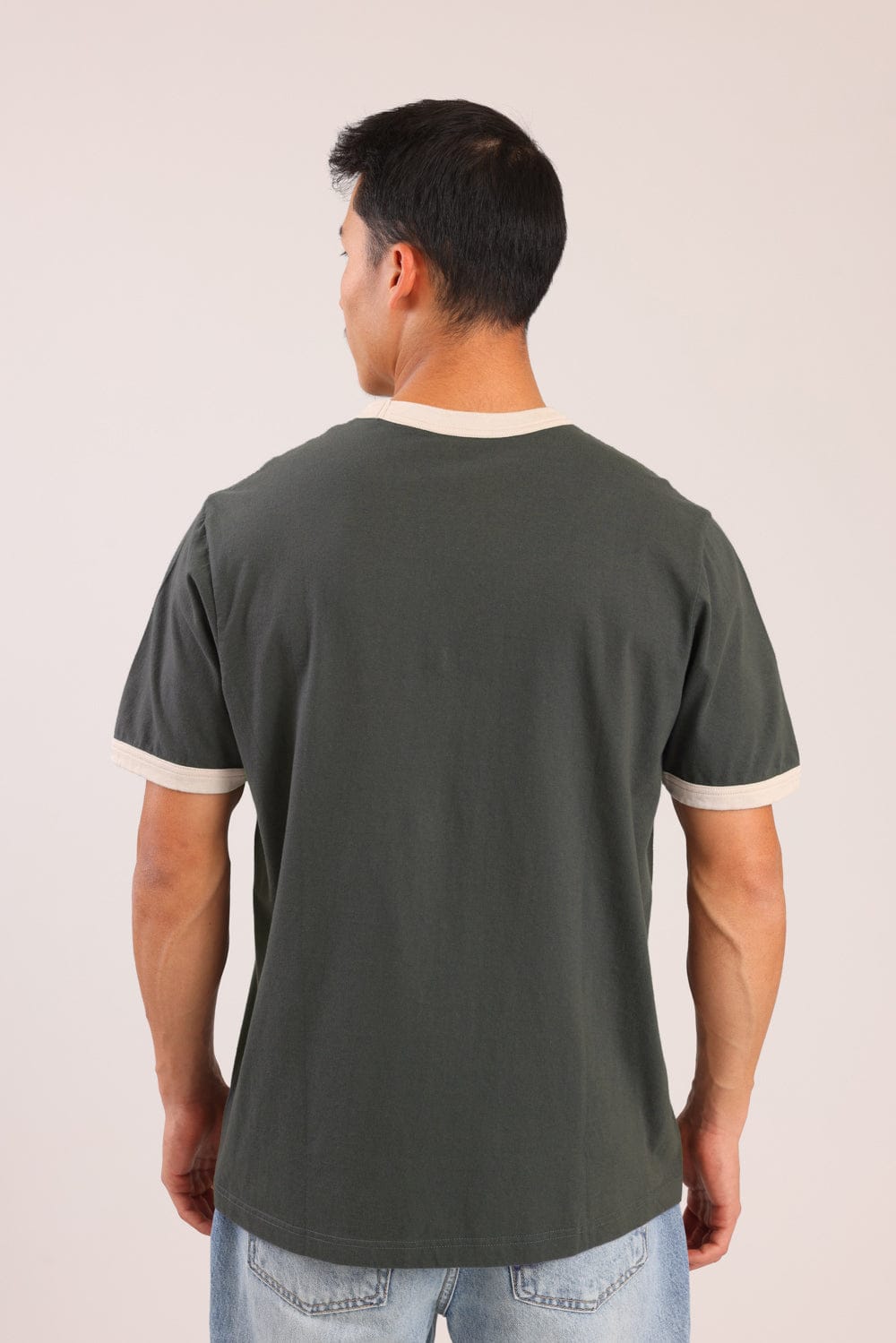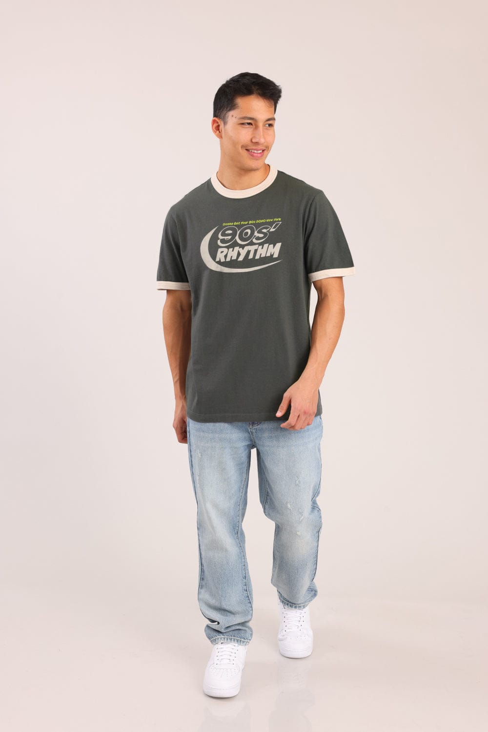 חולצת טריקו קצרה, צווארון עגול מודגש והדפס קדמי.
