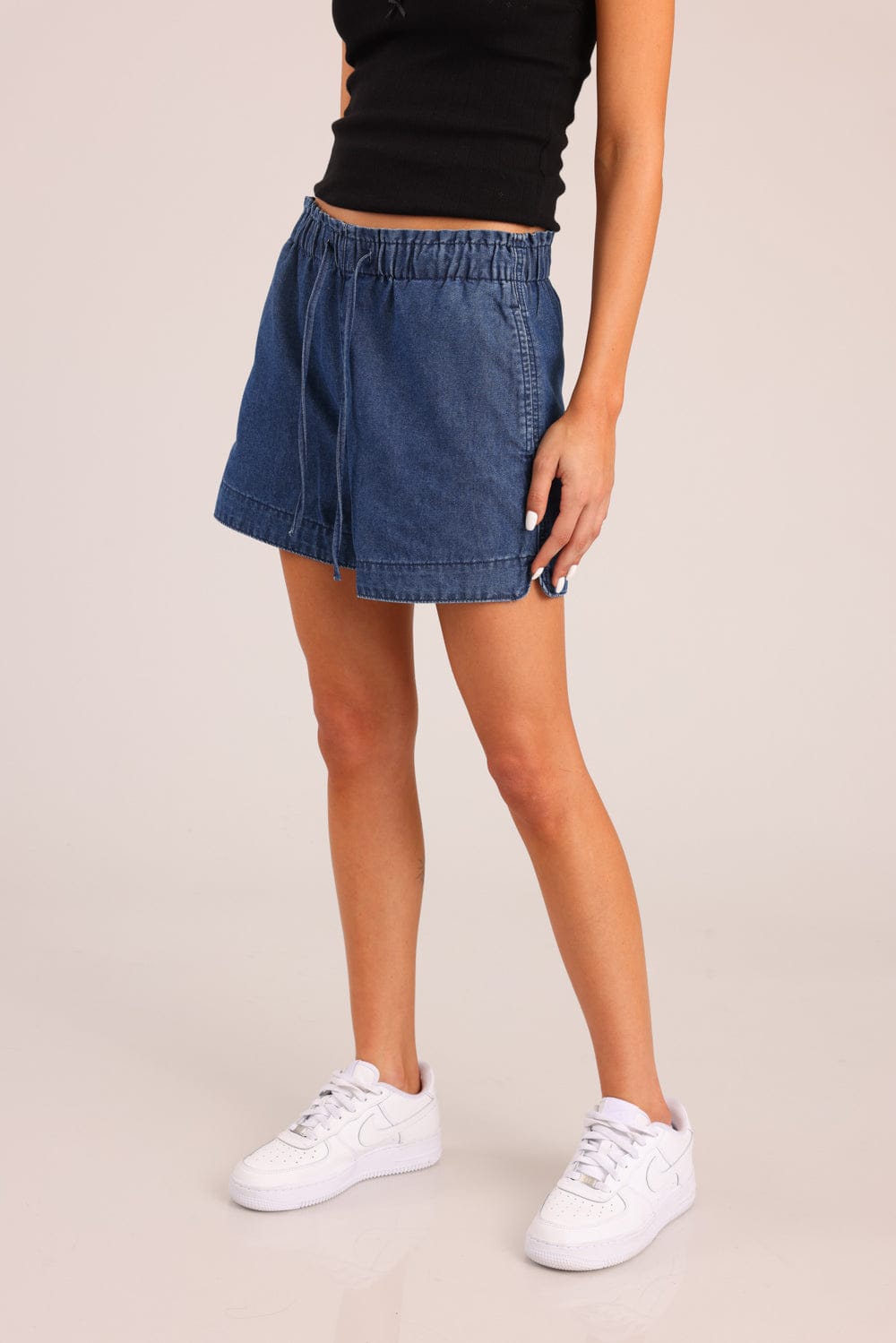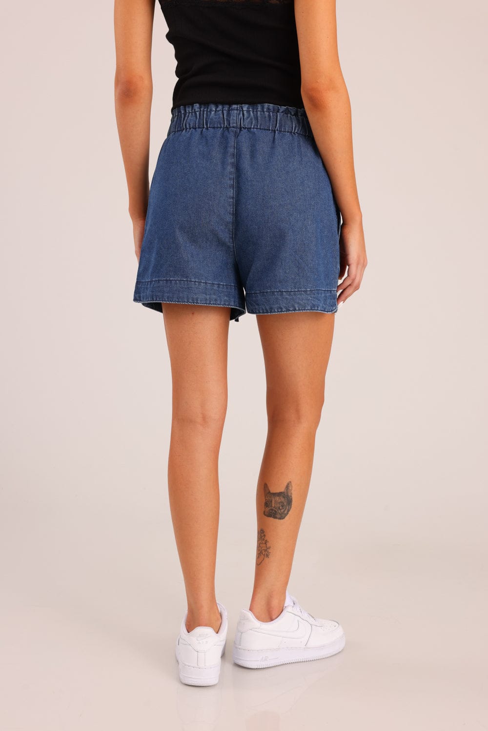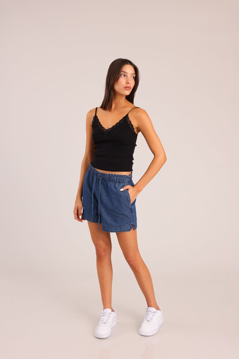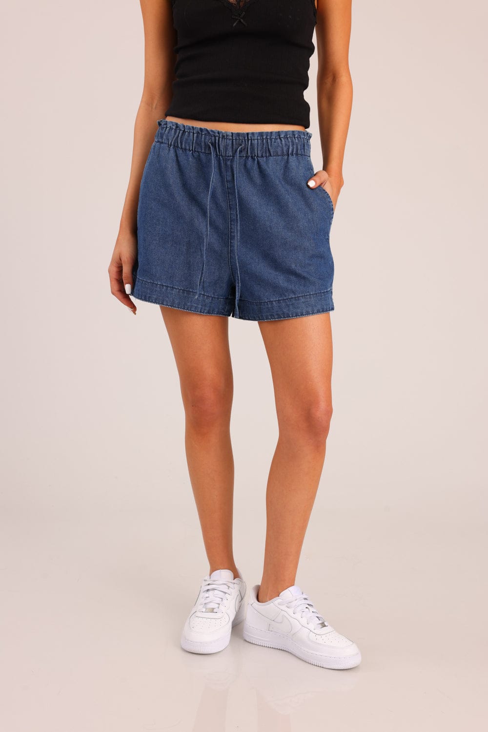 מכנסי ג'ינס קצרים עם גומי במותן וכיסים קדמיים