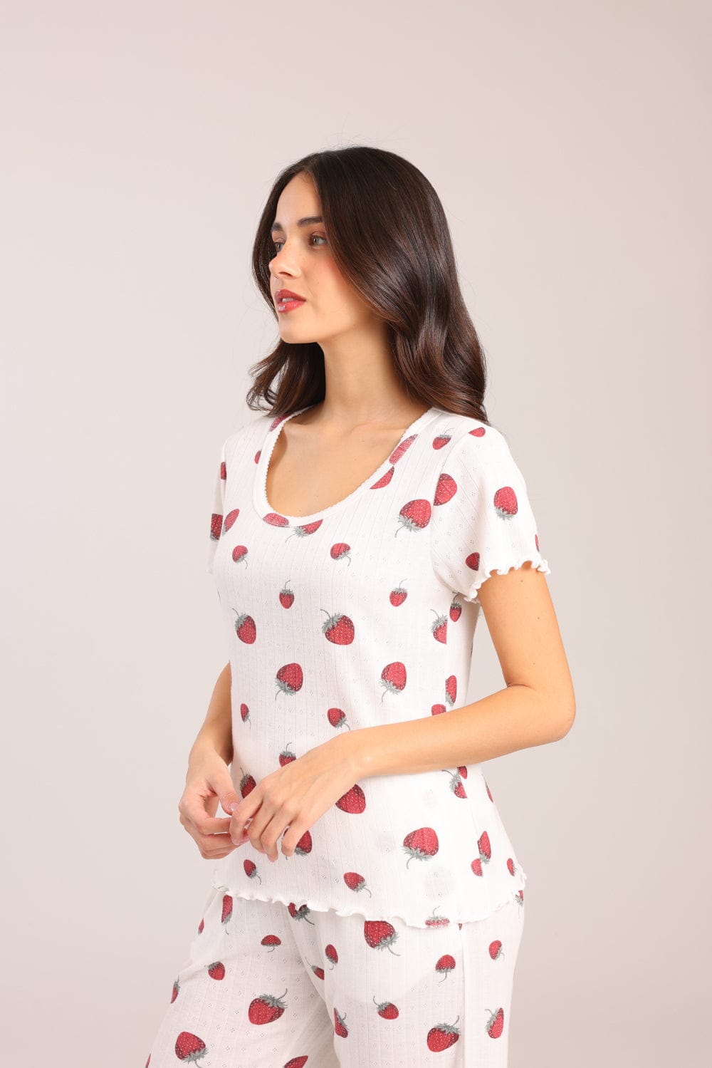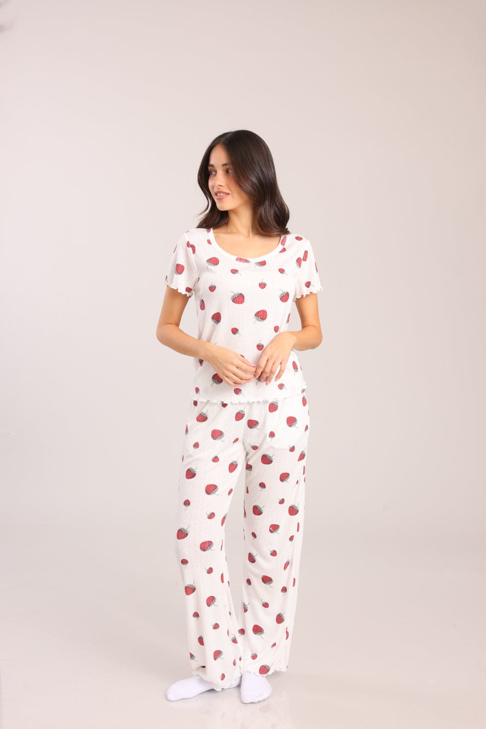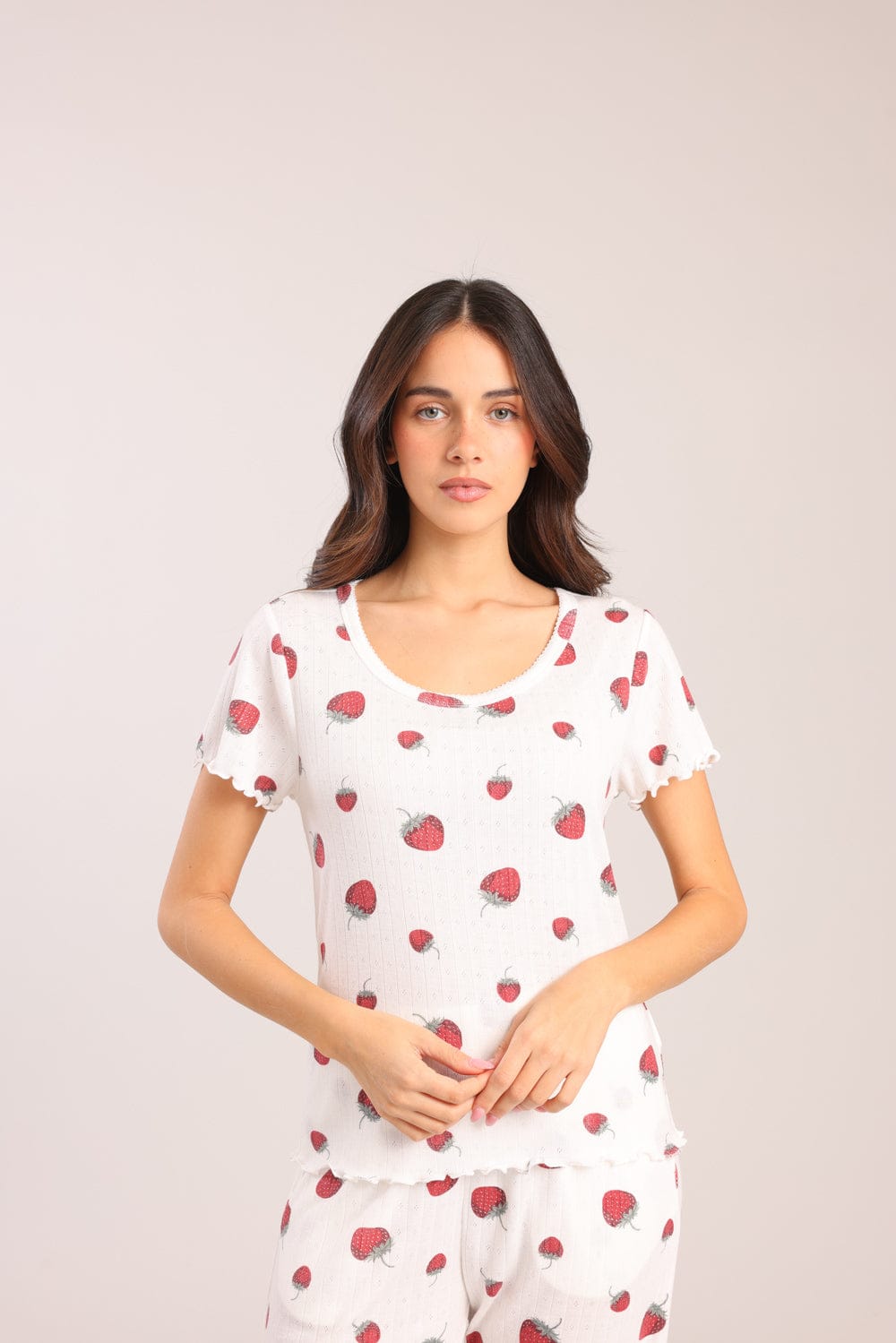 פיג'מת נשים עם הדפס תותים. חולצה קצרה צווארון עגול ומכנסיים עם גומי במותן.