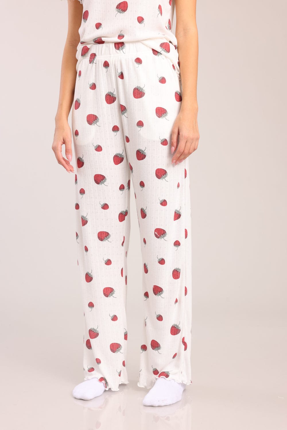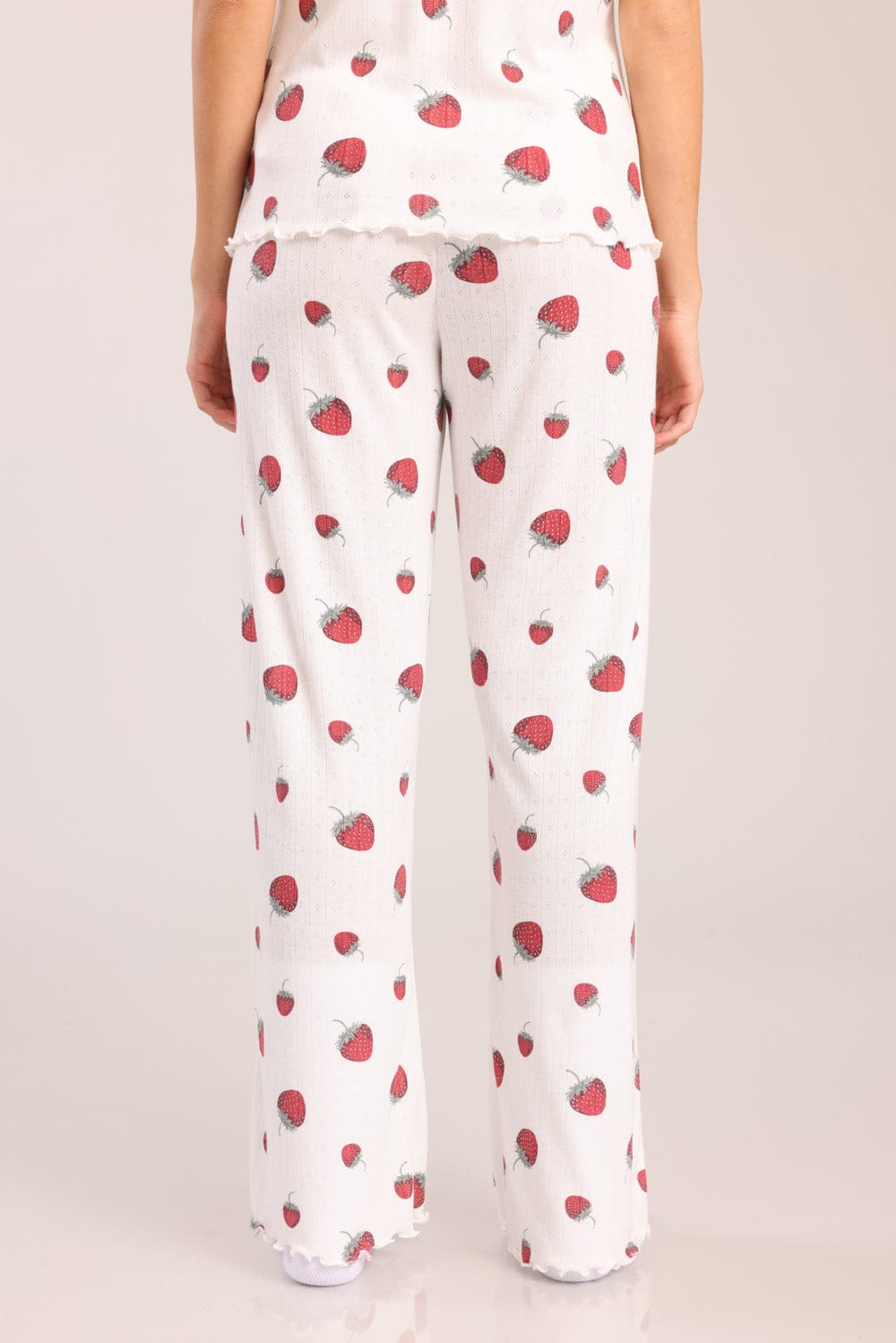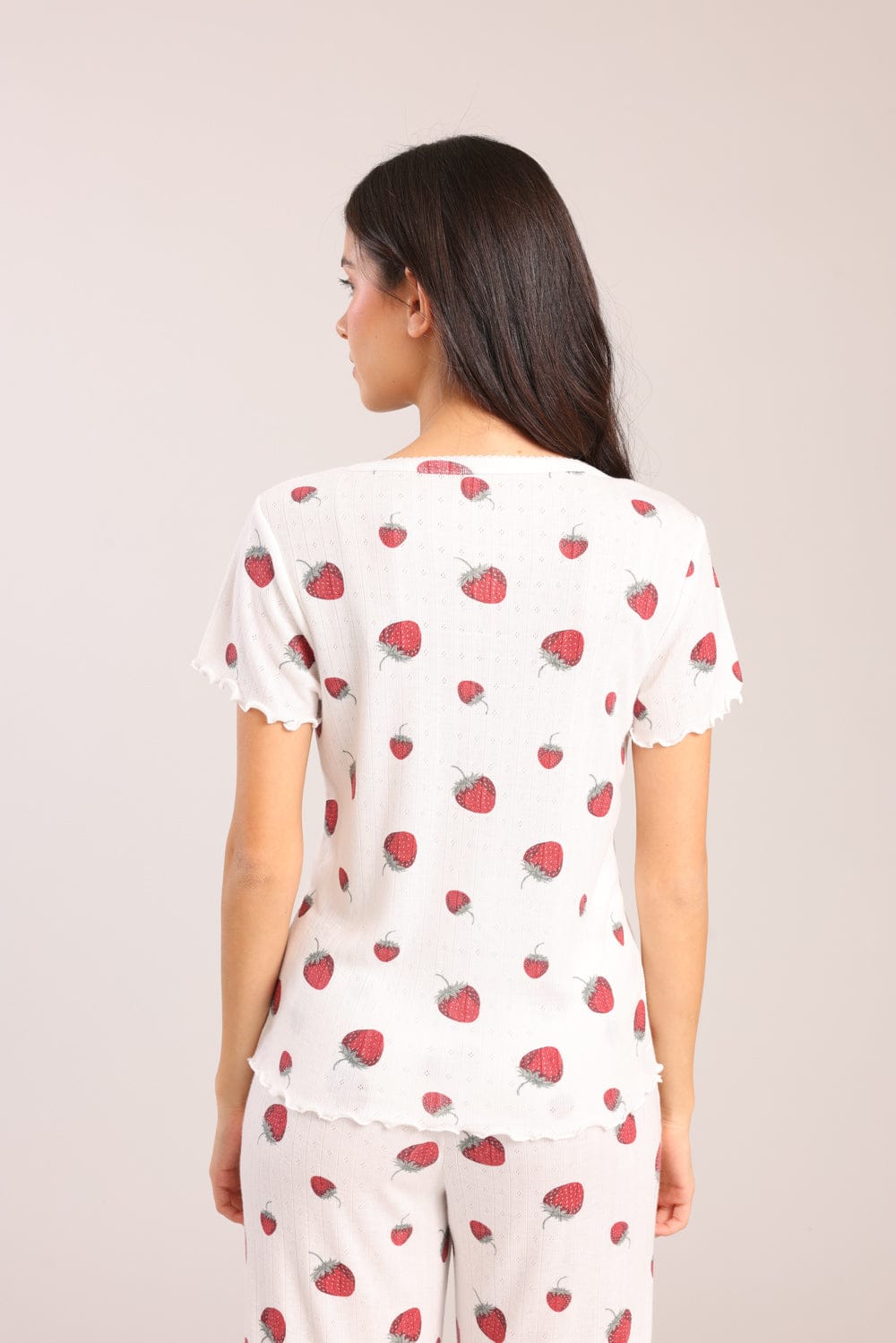 פיג'מת נשים עם הדפס תותים. חולצה קצרה צווארון עגול ומכנסיים עם גומי במותן.