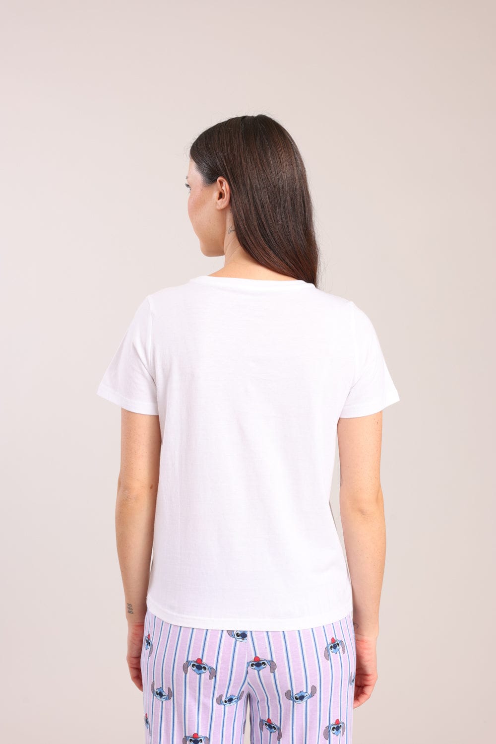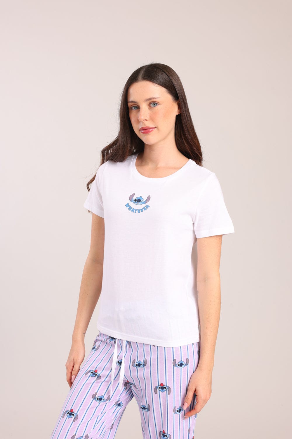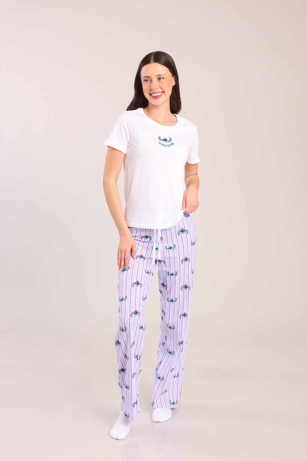 פיג'מת נשים 100% כותנה ממותגת סטיץ'. חולצה קצרה עם צווארון עגול והדפס קדמי ומכנסיים מודפסים עם גומי ושרוך במותן.