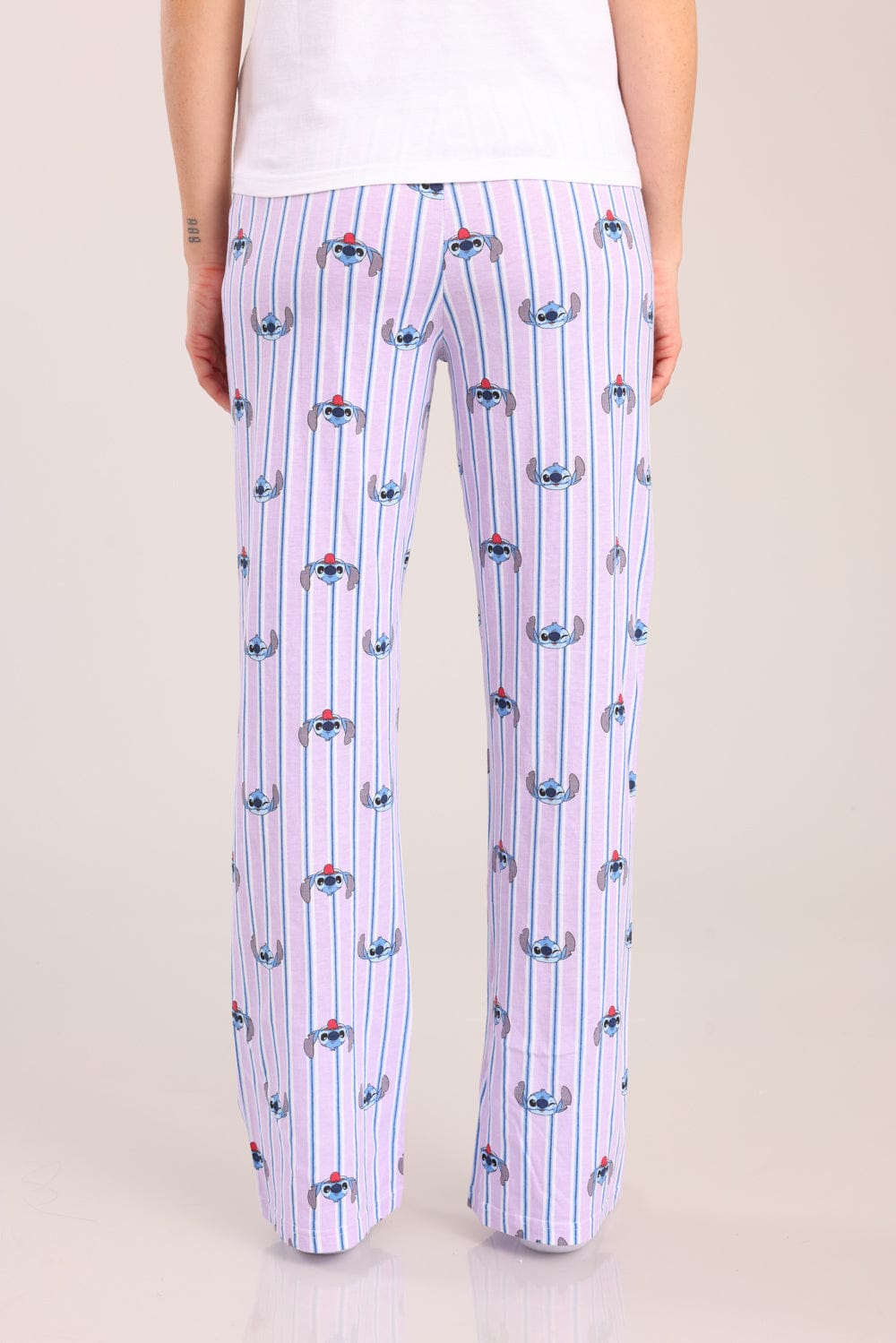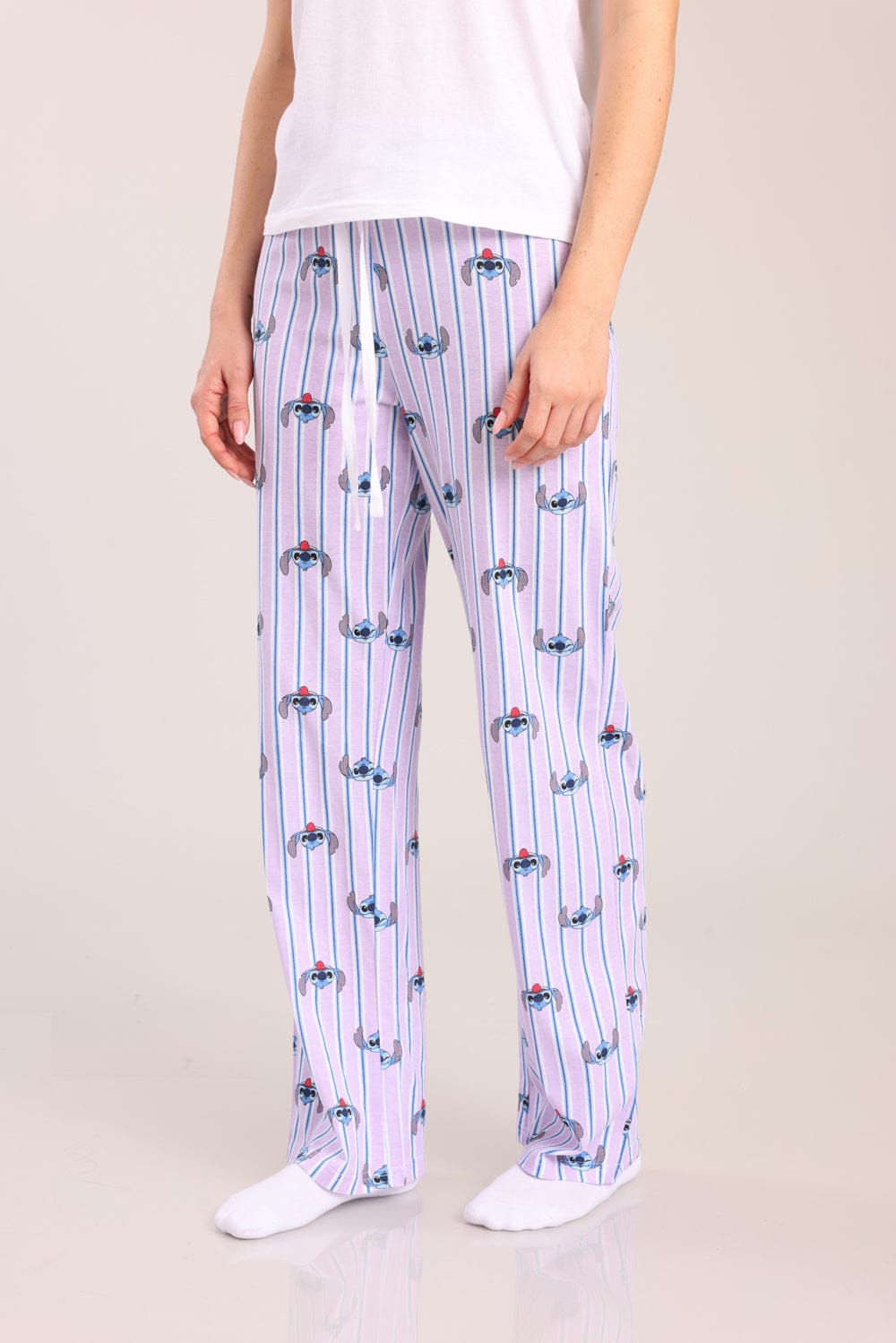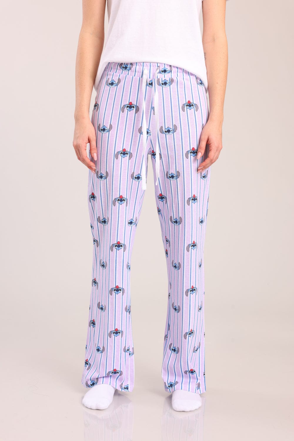 פיג'מת נשים 100% כותנה ממותגת סטיץ'. חולצה קצרה עם צווארון עגול והדפס קדמי ומכנסיים מודפסים עם גומי ושרוך במותן.