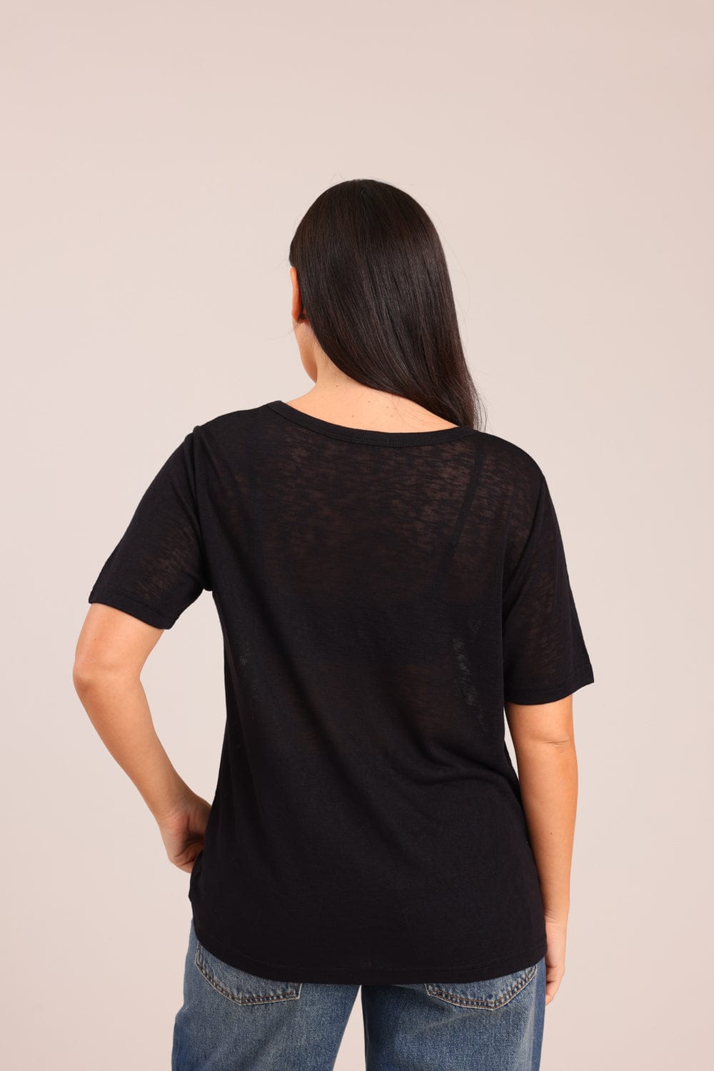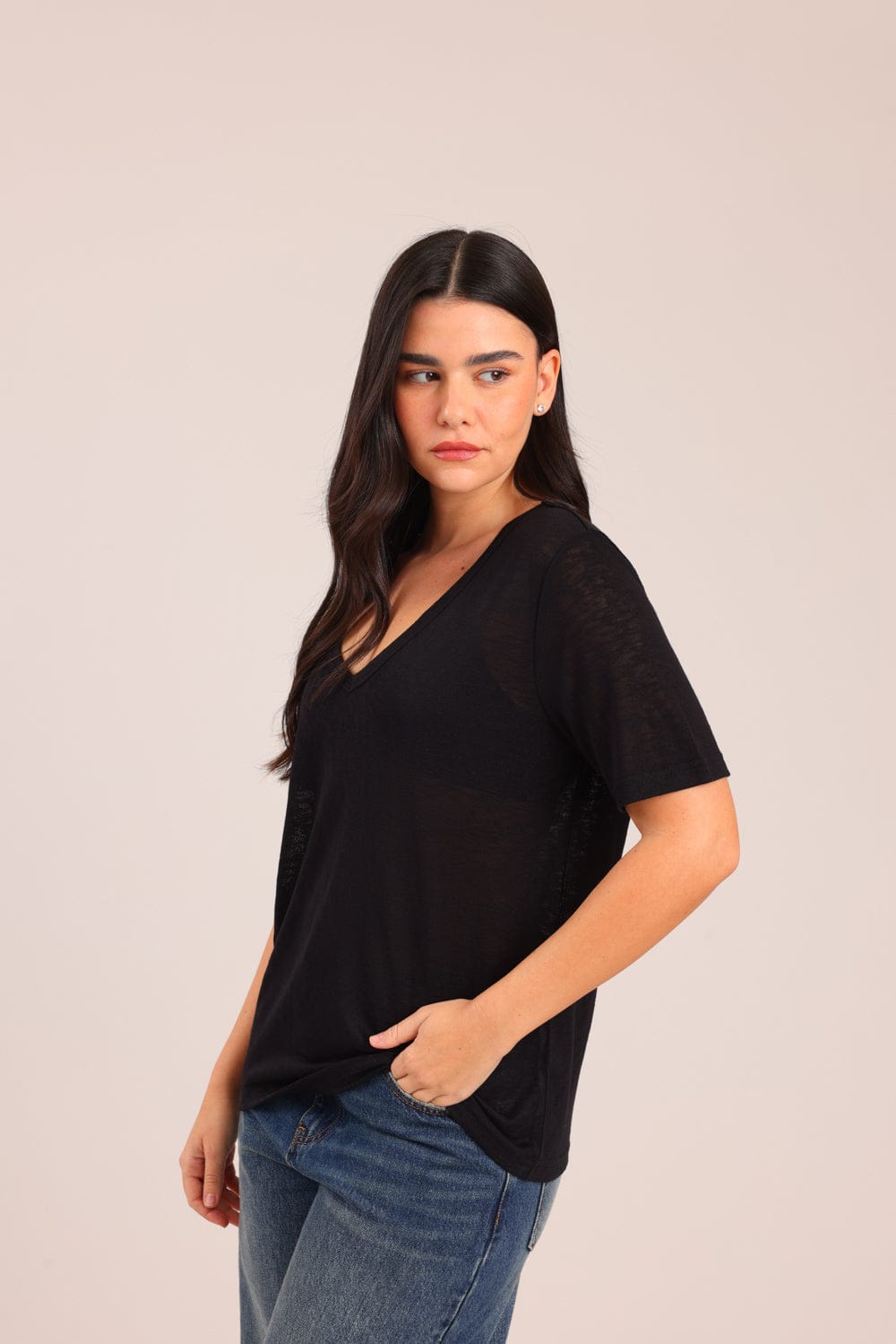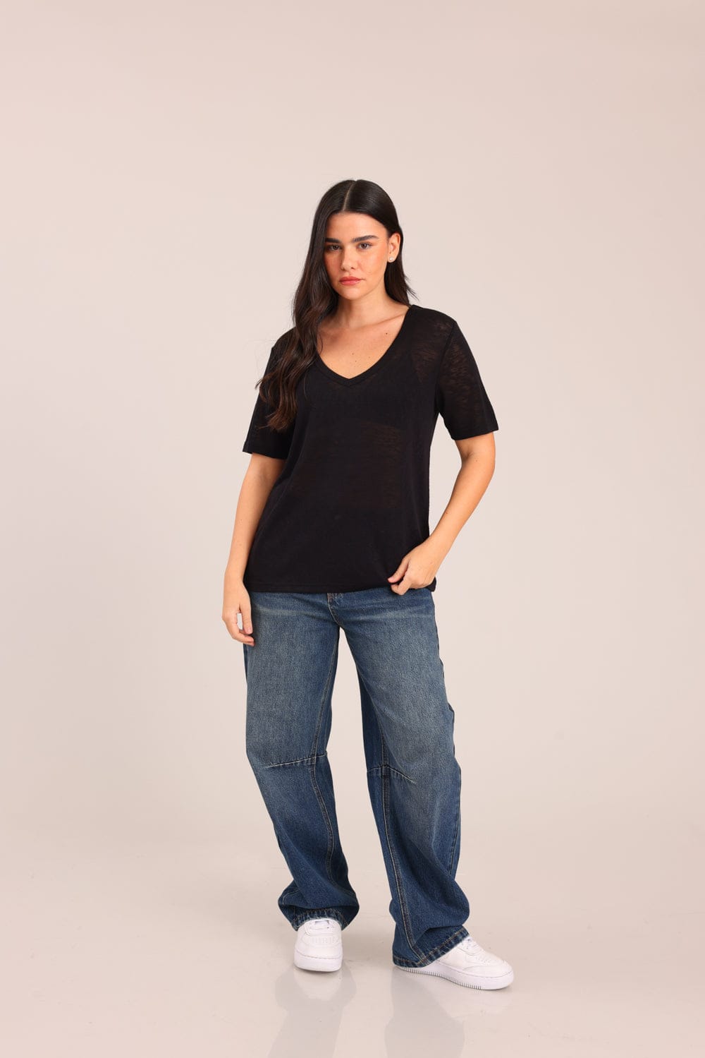 חולצת V אוברסייז בגזרה ארוכה במותן.