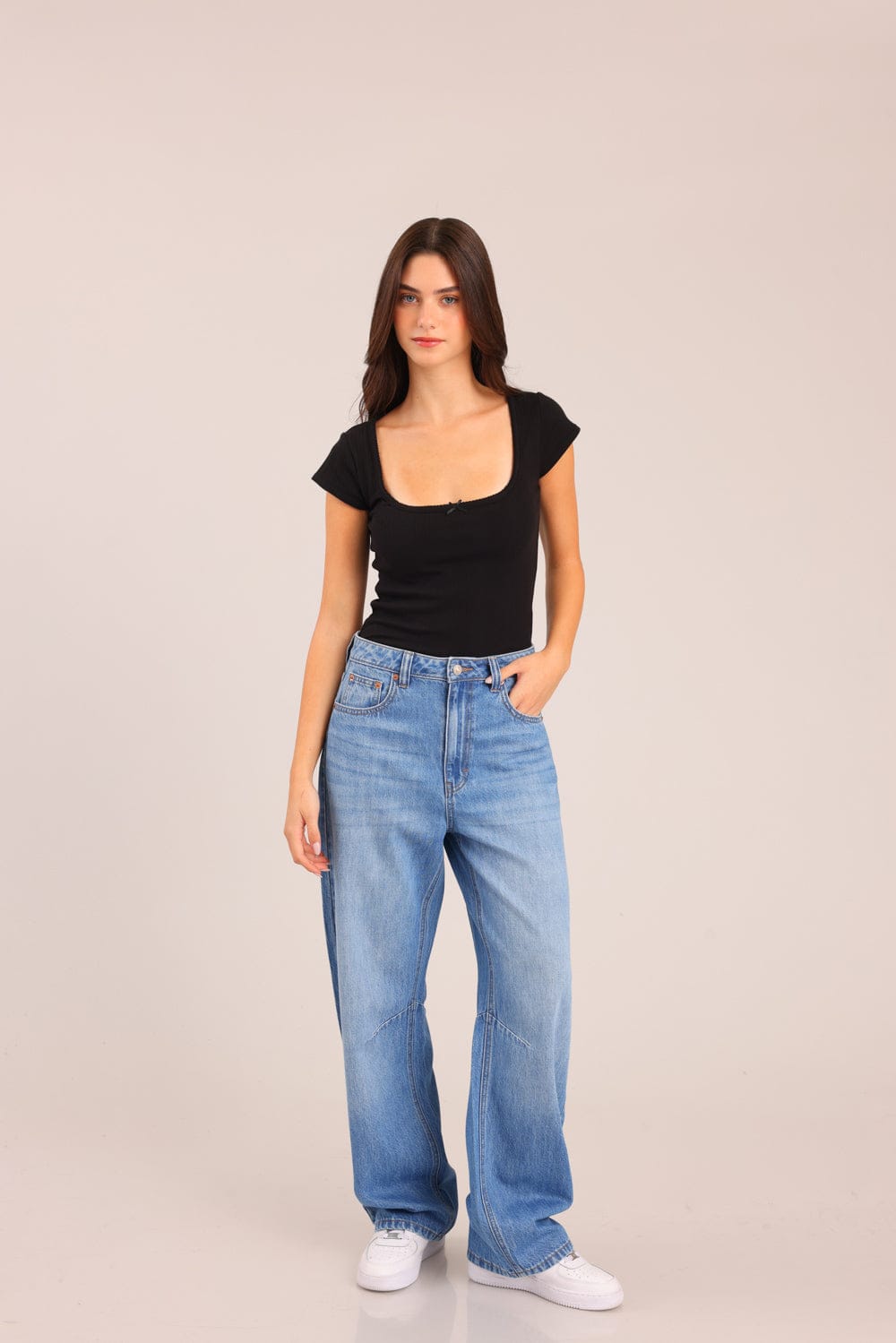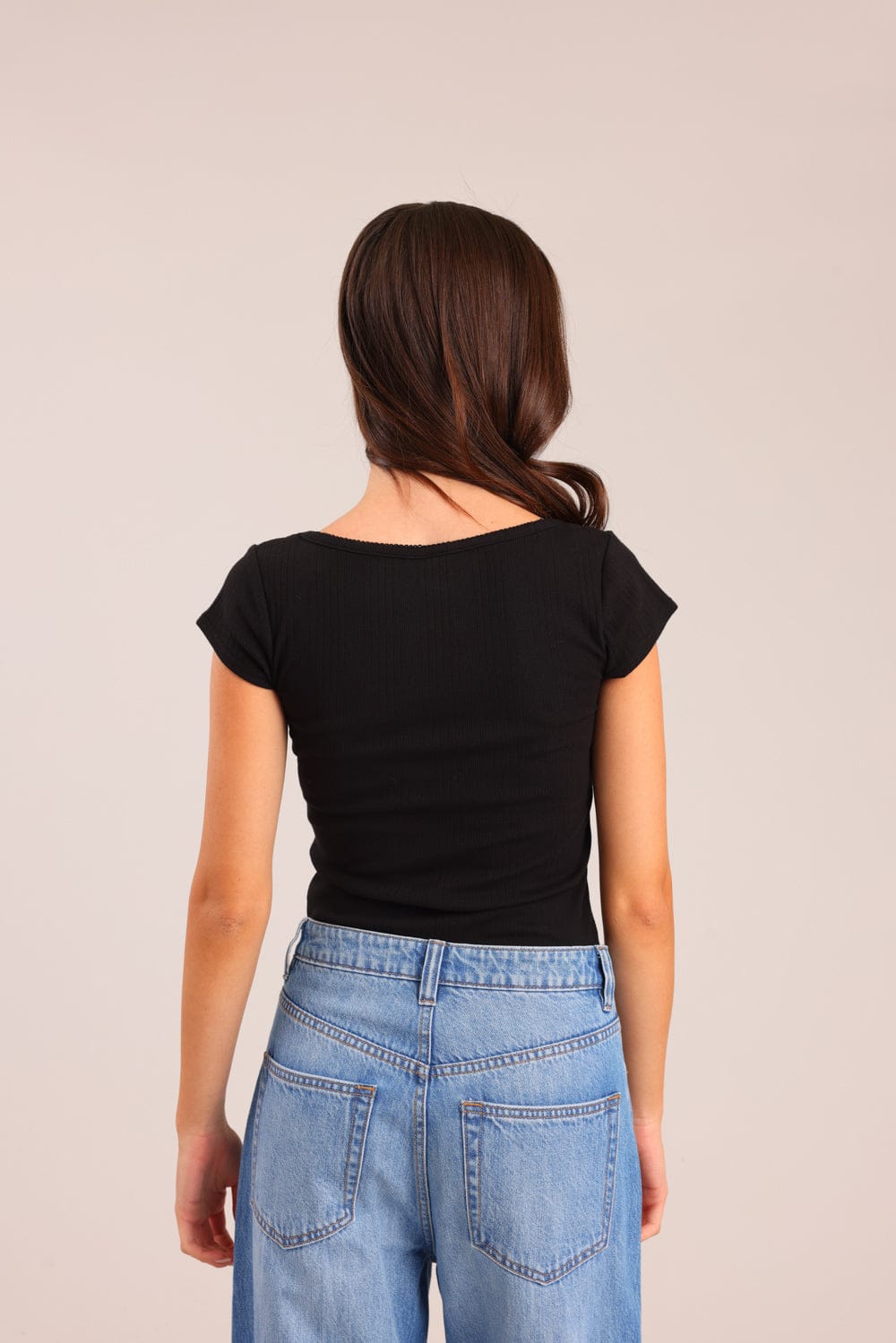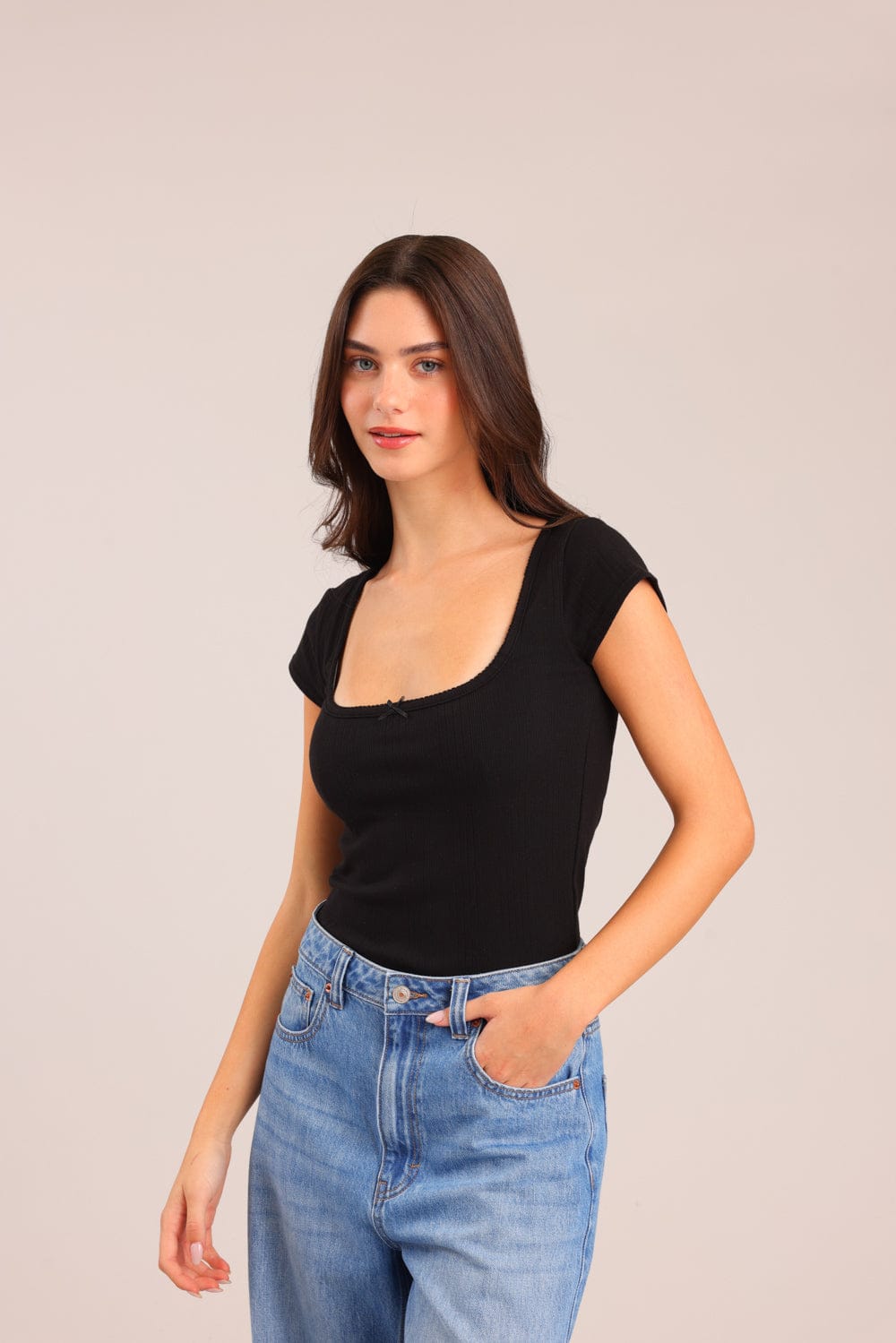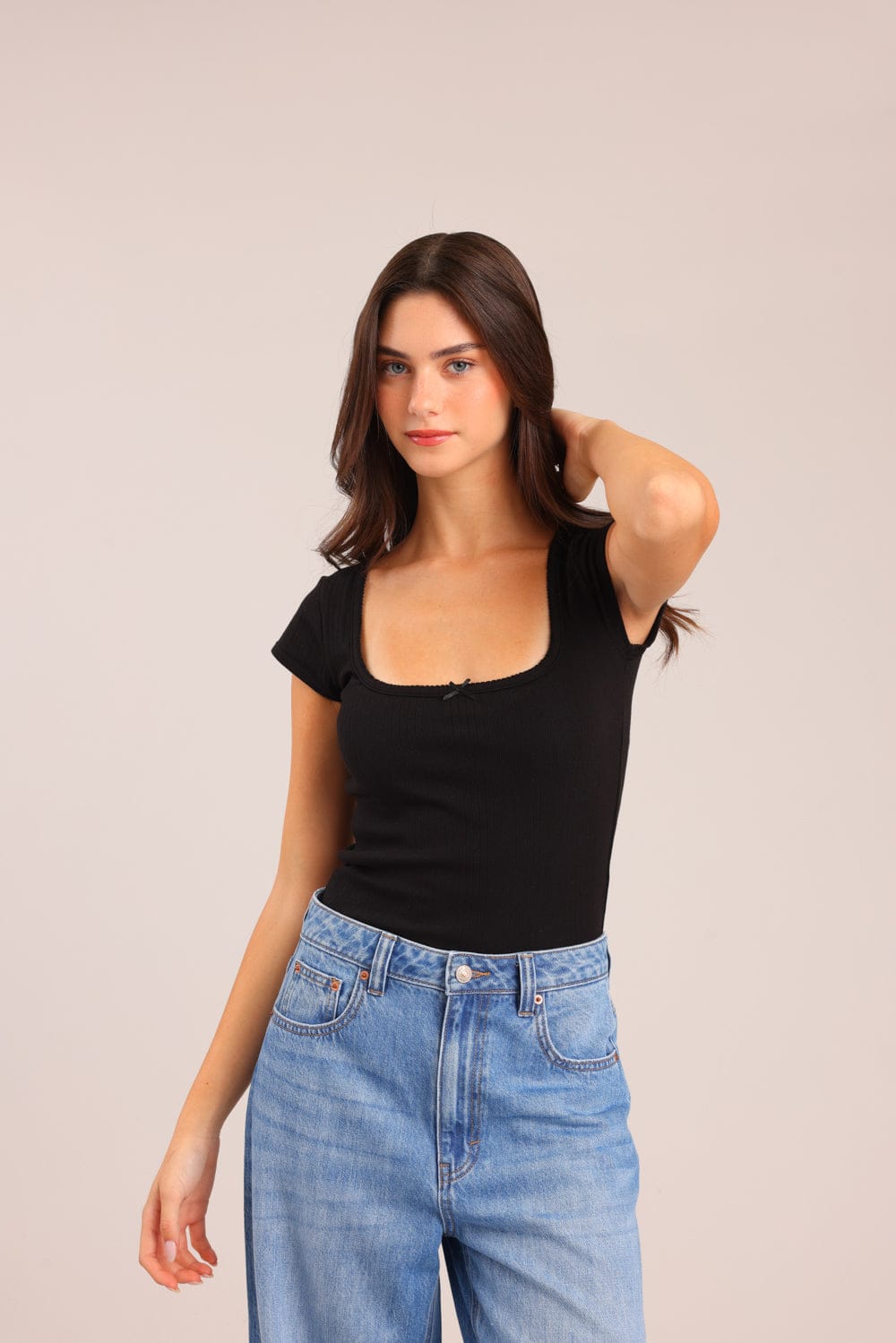חולצת נשים חלקה ריב עם צווארון עגול עמוק ופפיון.