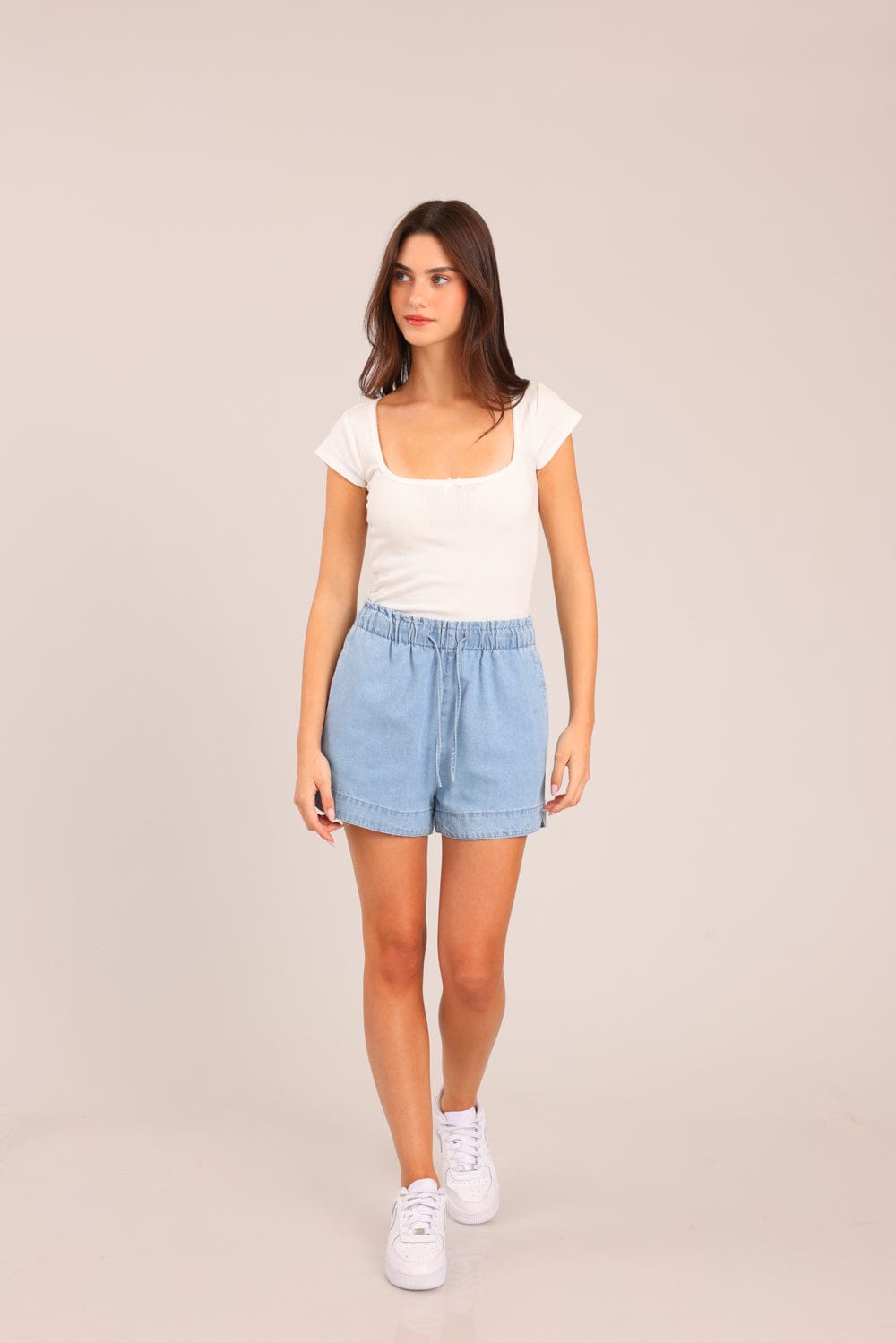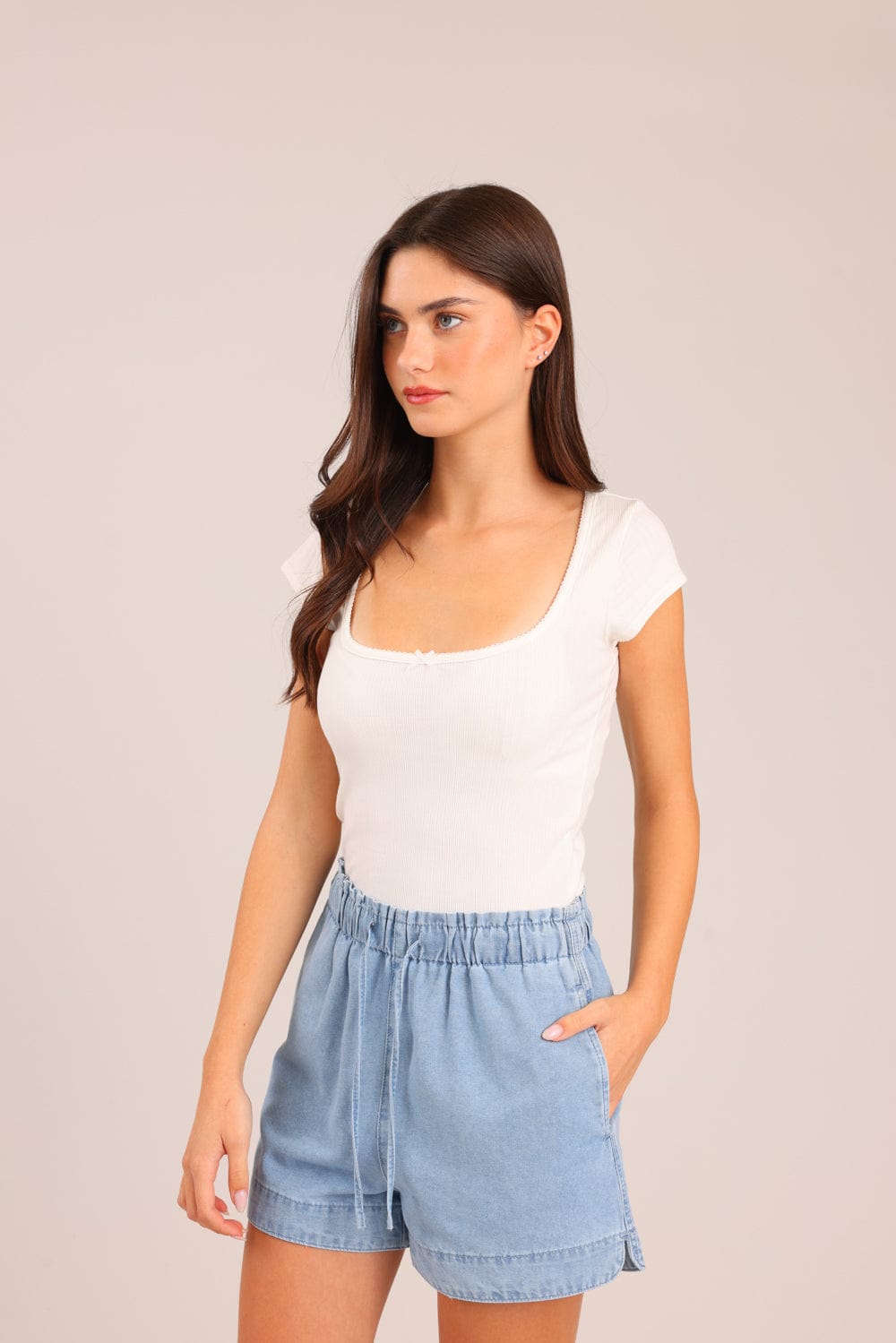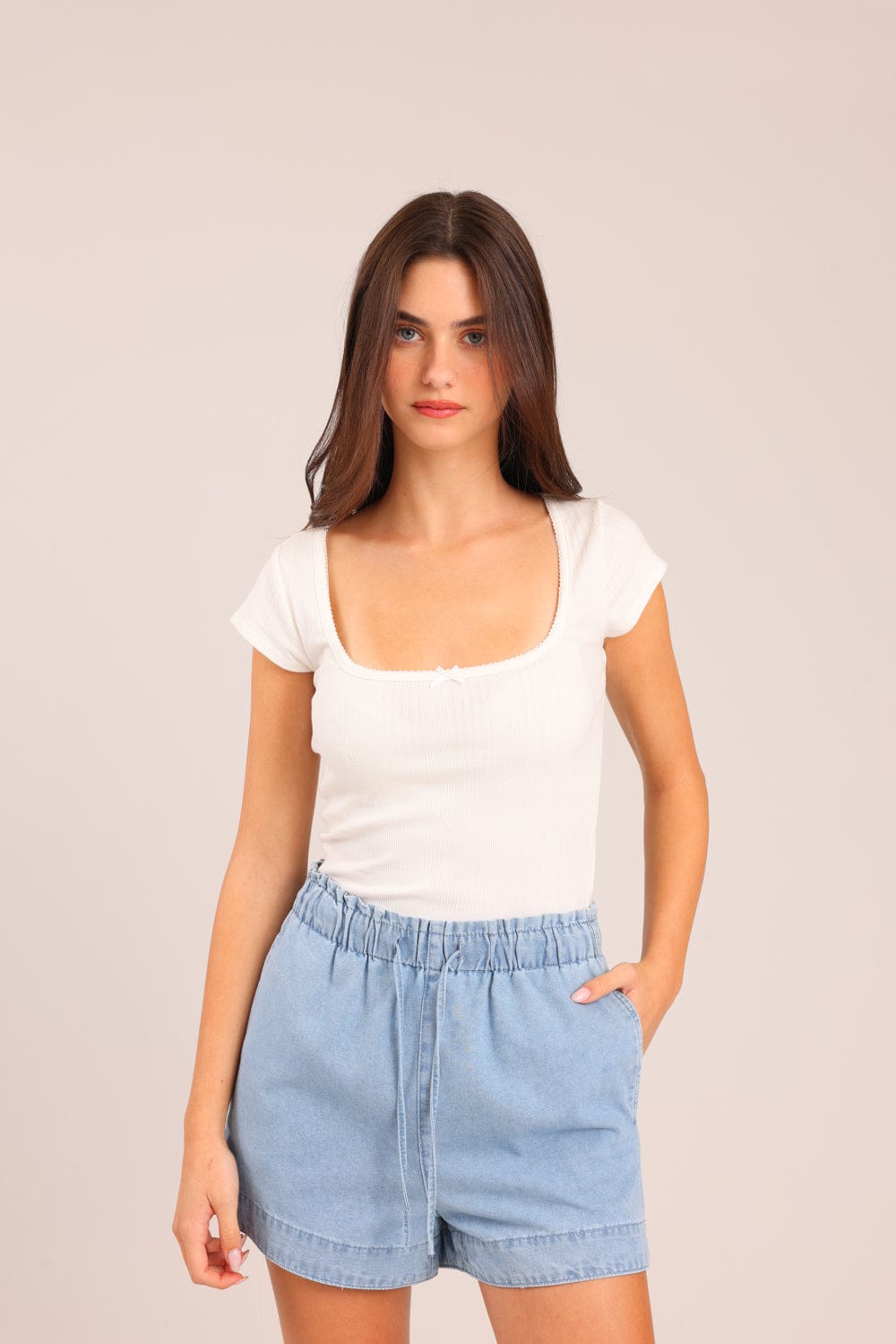 חולצת נשים חלקה ריב עם צווארון עגול עמוק ופפיון.