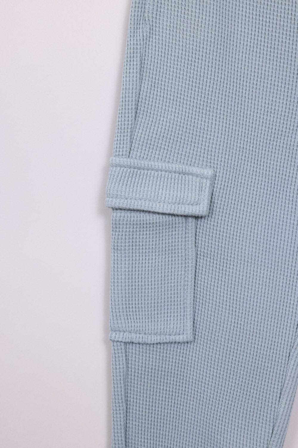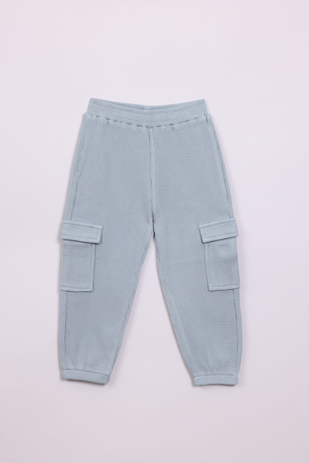 מכנסי טריקו 100% כותנה מבד וופל, עם כיסים צדדיים וגומי במותן וברגליים.