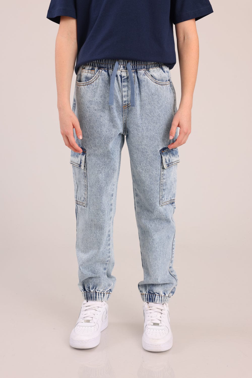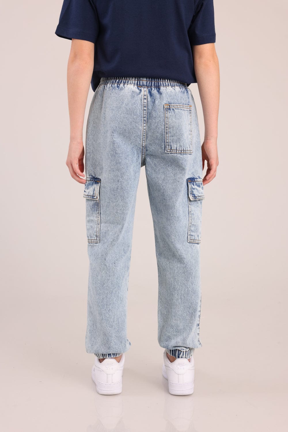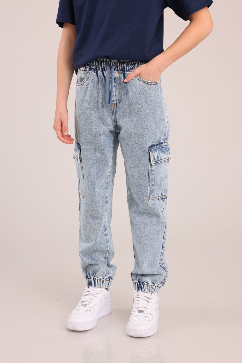 מכנסי ג'ינס אוברסייז עם כיסים צדדים וגומי ברגליים.