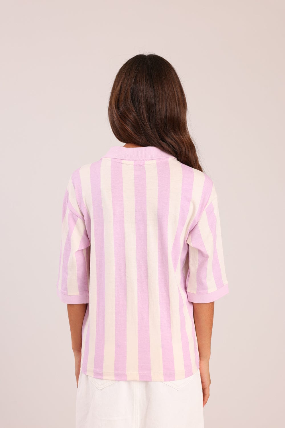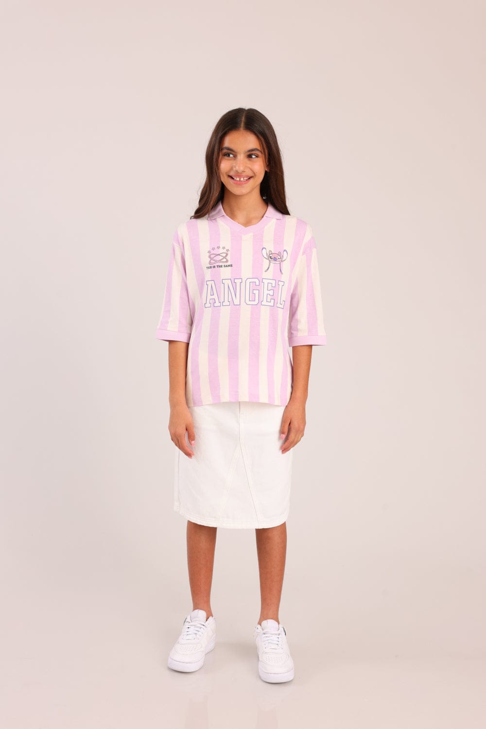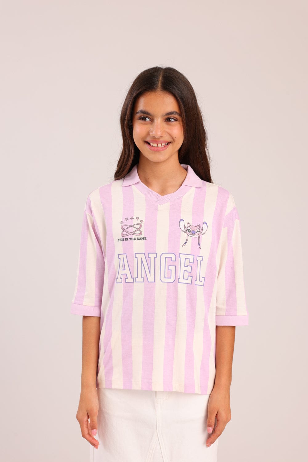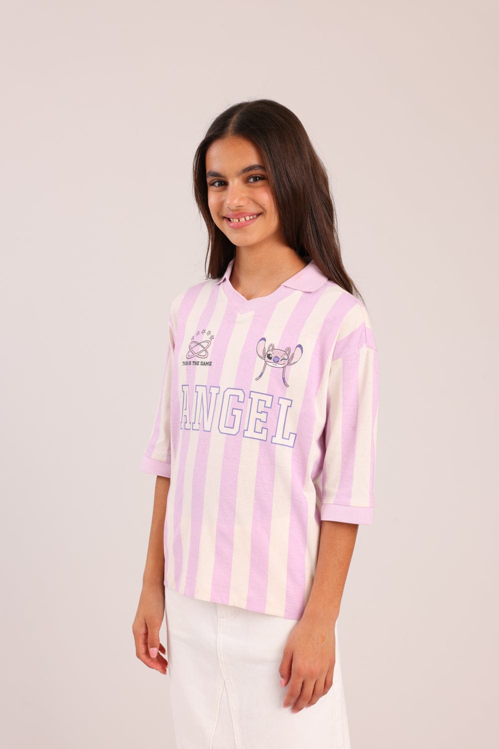 חולצה ממותגת סטיץ' דיסני, עם צווארון , פסים והדפס קדמי.