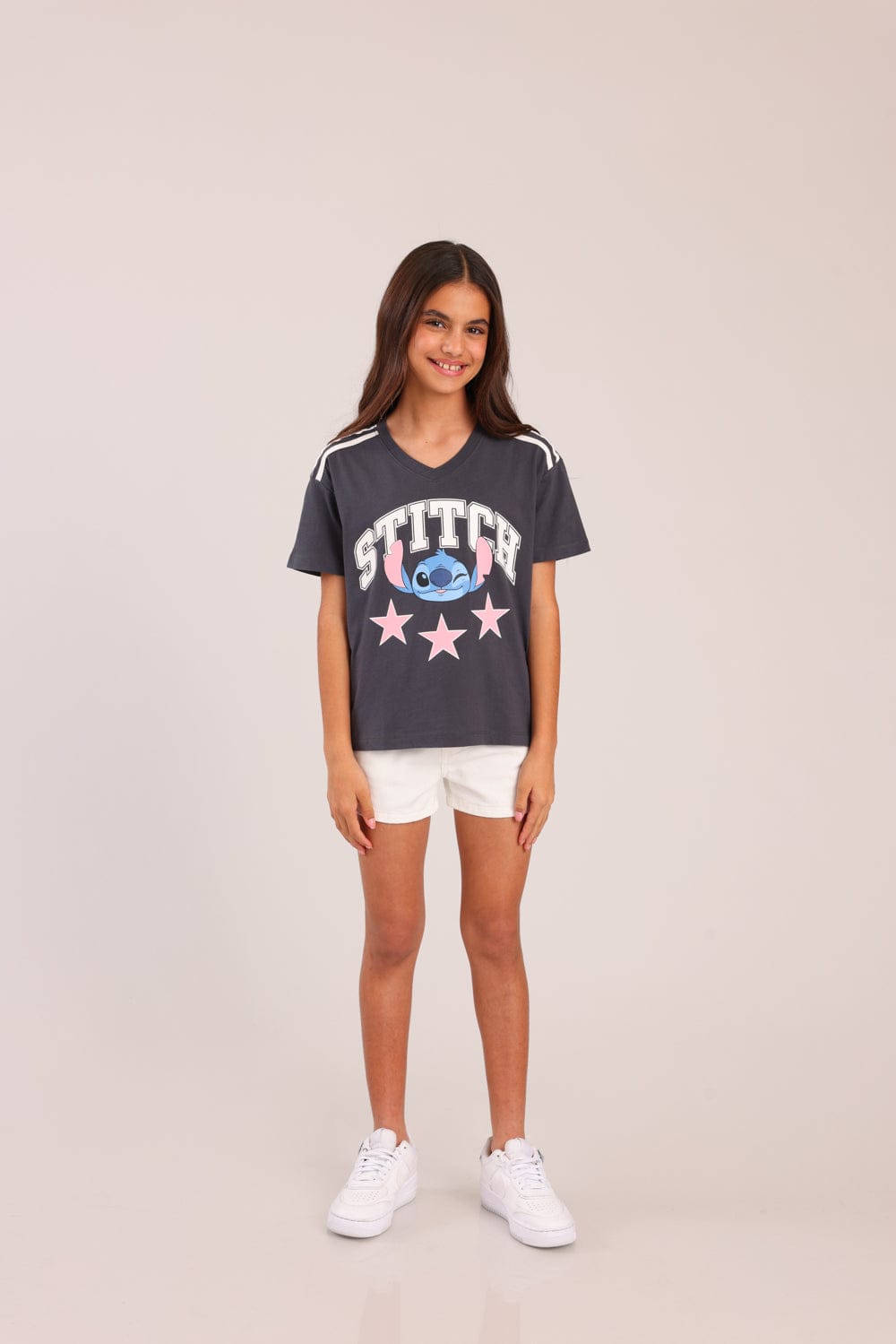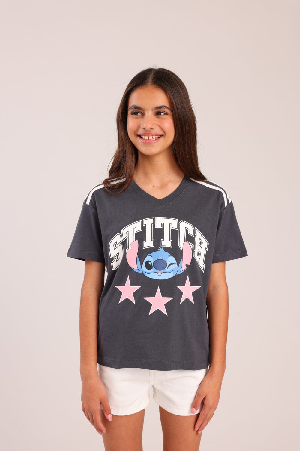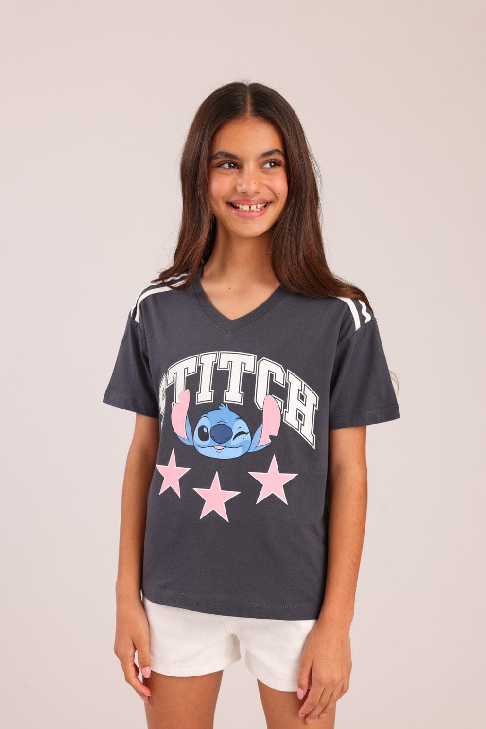חולצה ממותגת סטי'ץ דיסני עם הדפס קדמי ופסים בכתפיים.
