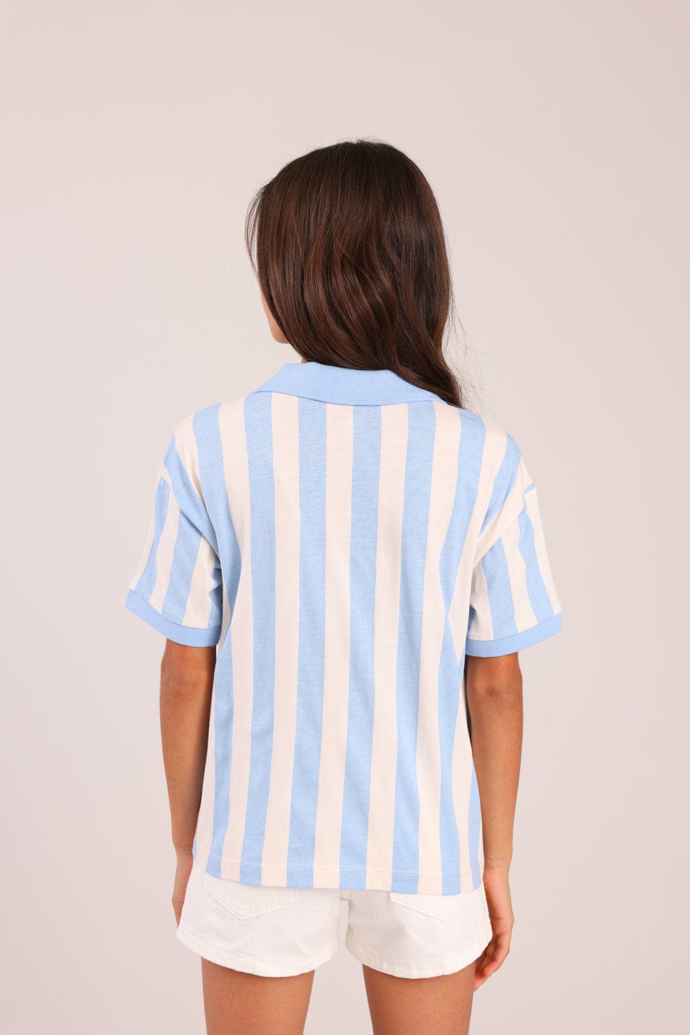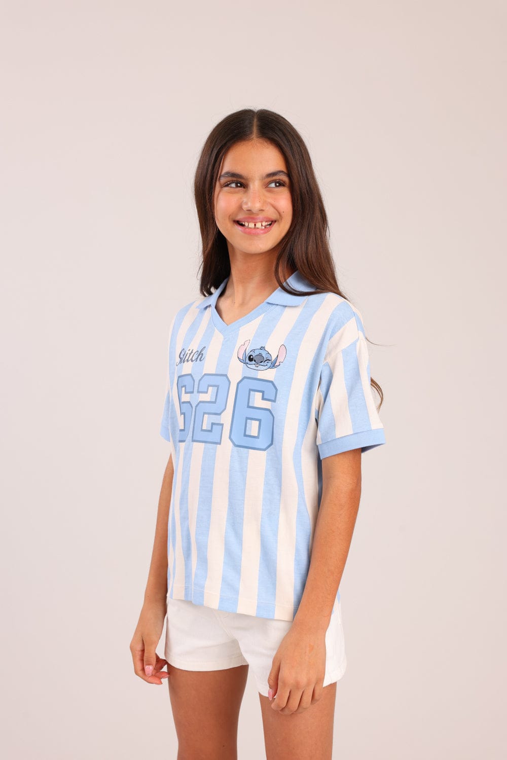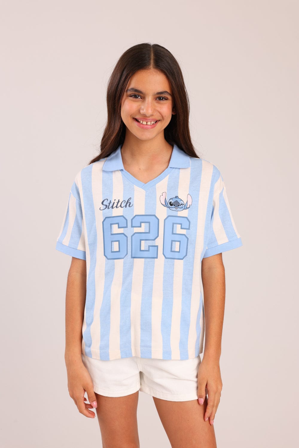 חולצה ממותגת סטיץ' דיסני, עם צווארון , פסים והדפס קדמי.