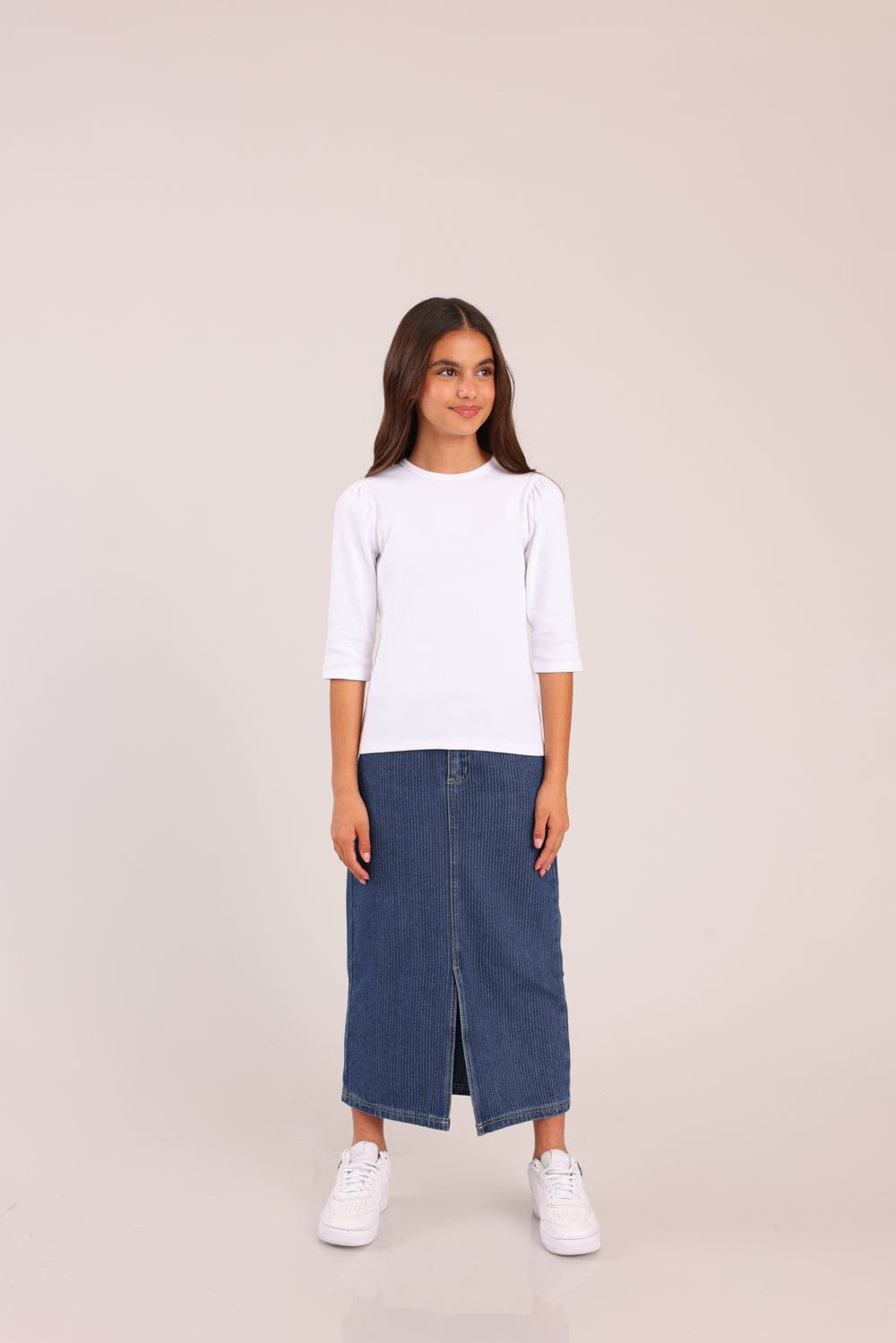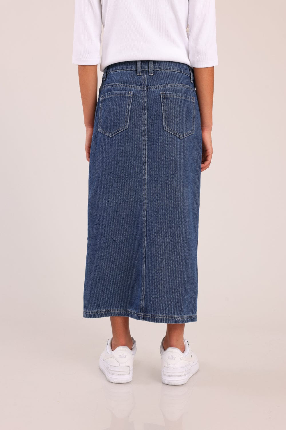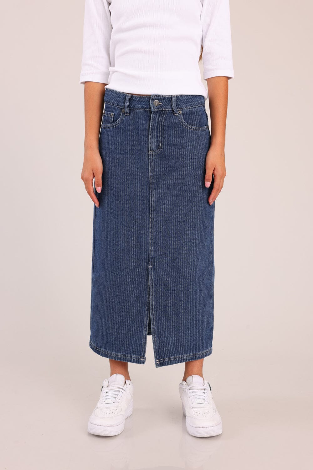 חצאית ג'ינס , עם שסע קדמי וכיסים אחוריים וקדמיים.